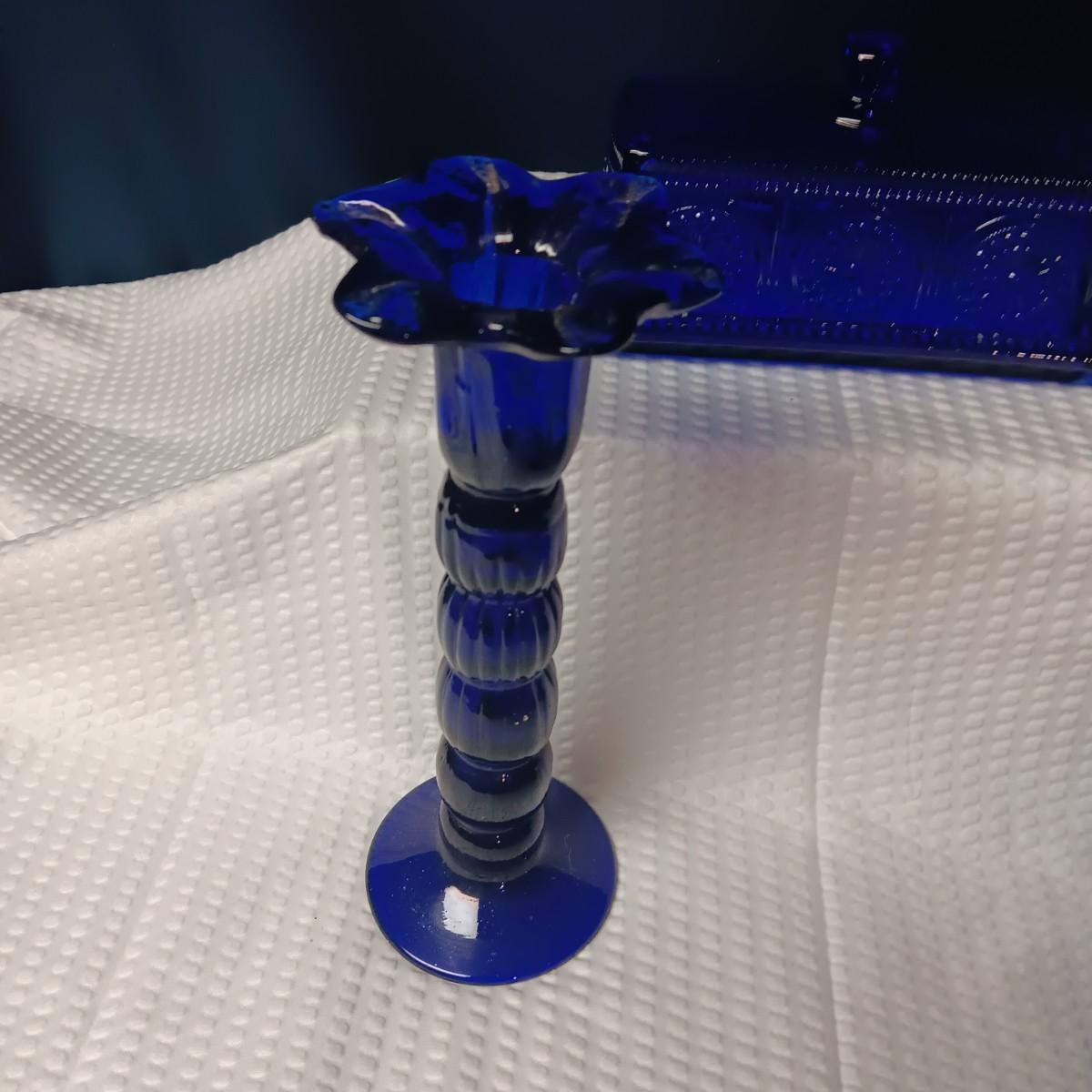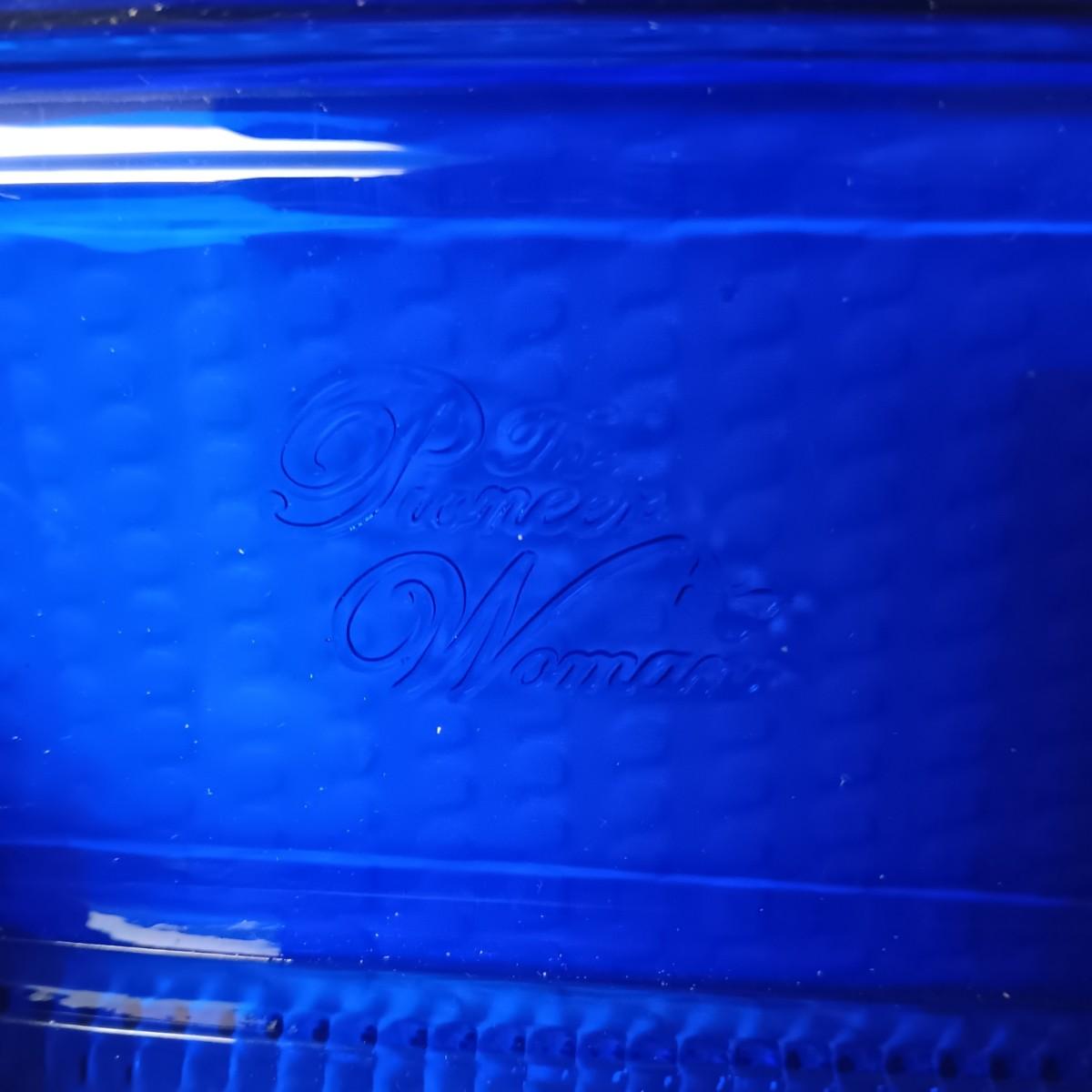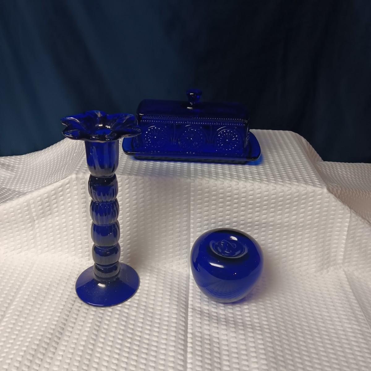 COBALT BLUE PIONEER WOMAN BUTTER DISH, GLASS VASE AND APPLE