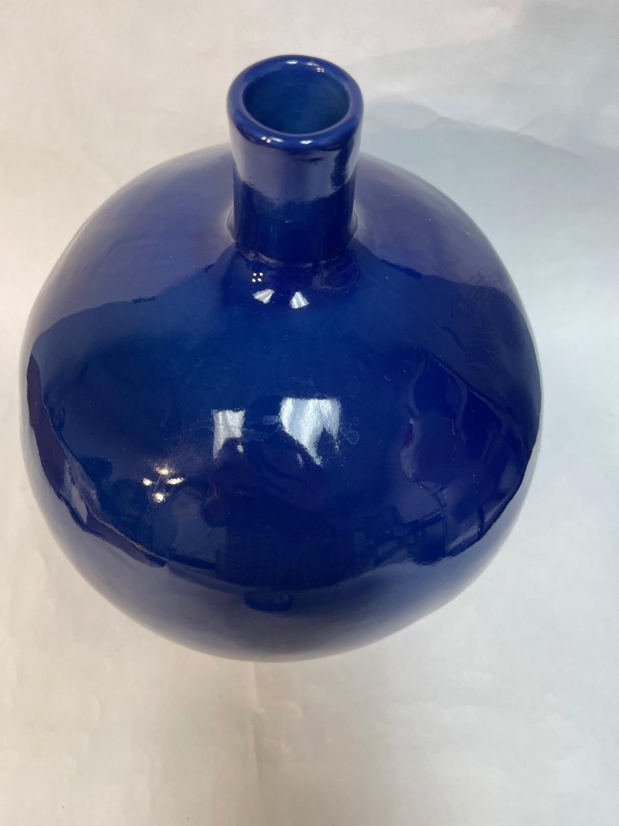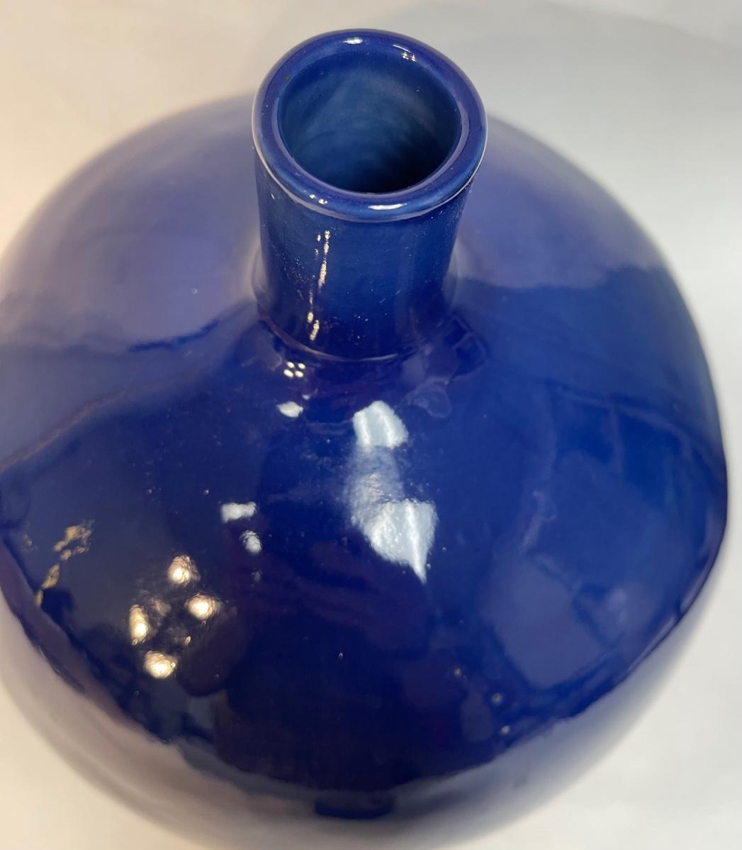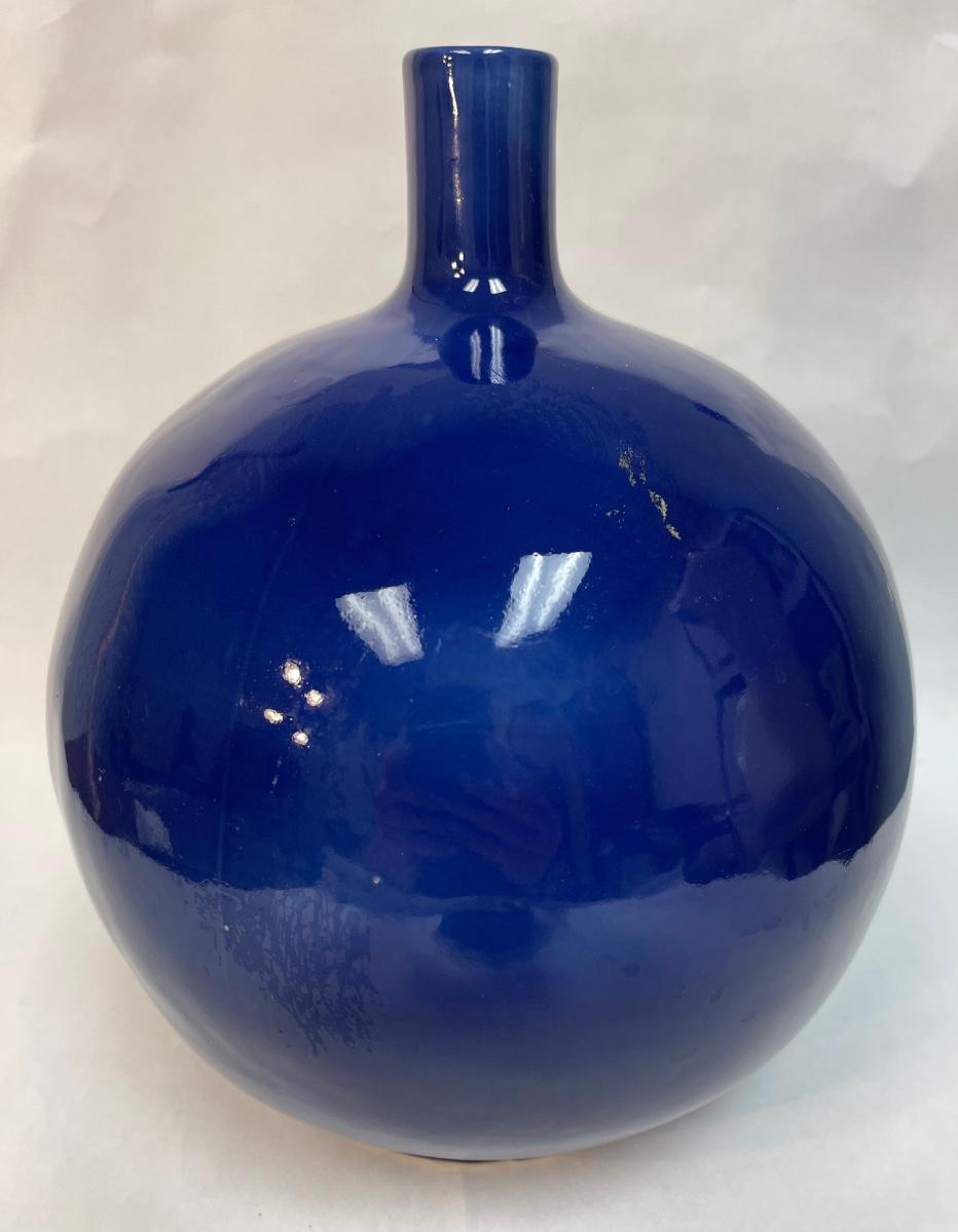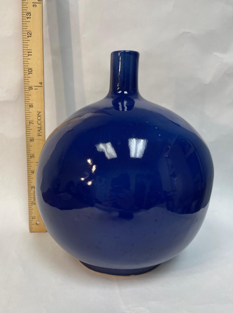 Cobalt Blue round vase with narrow neck in good condition . There is a brown spot under the glaze on one side. side