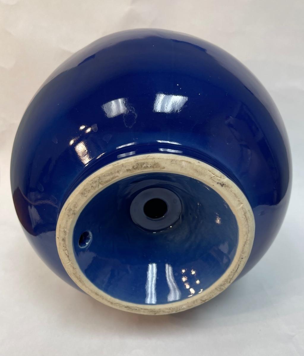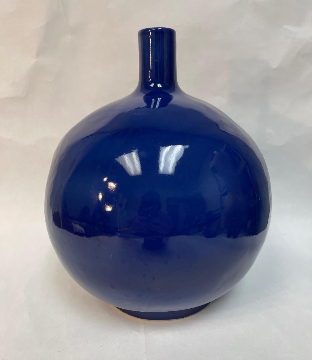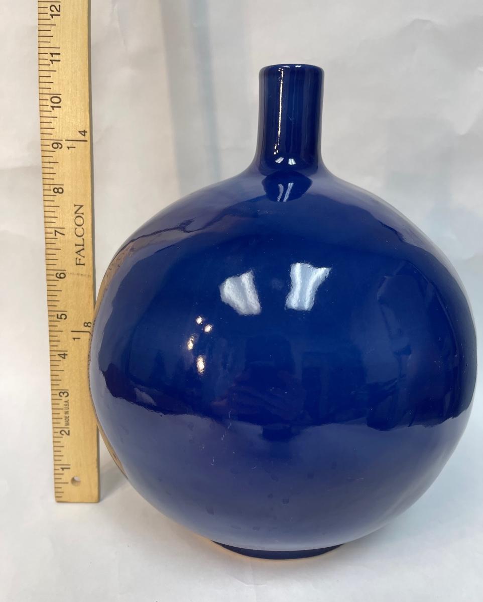 Cobalt Blue round vase with narrow neck in good condition . There is a brown spot under the glaze on one side. side