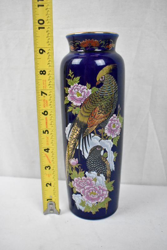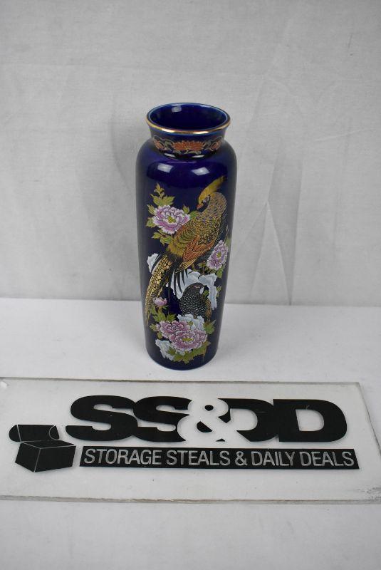 Cobalt Blue Vase w/ Flowers & Birds Design Peacocks? Pheasants? Vintage Japanese