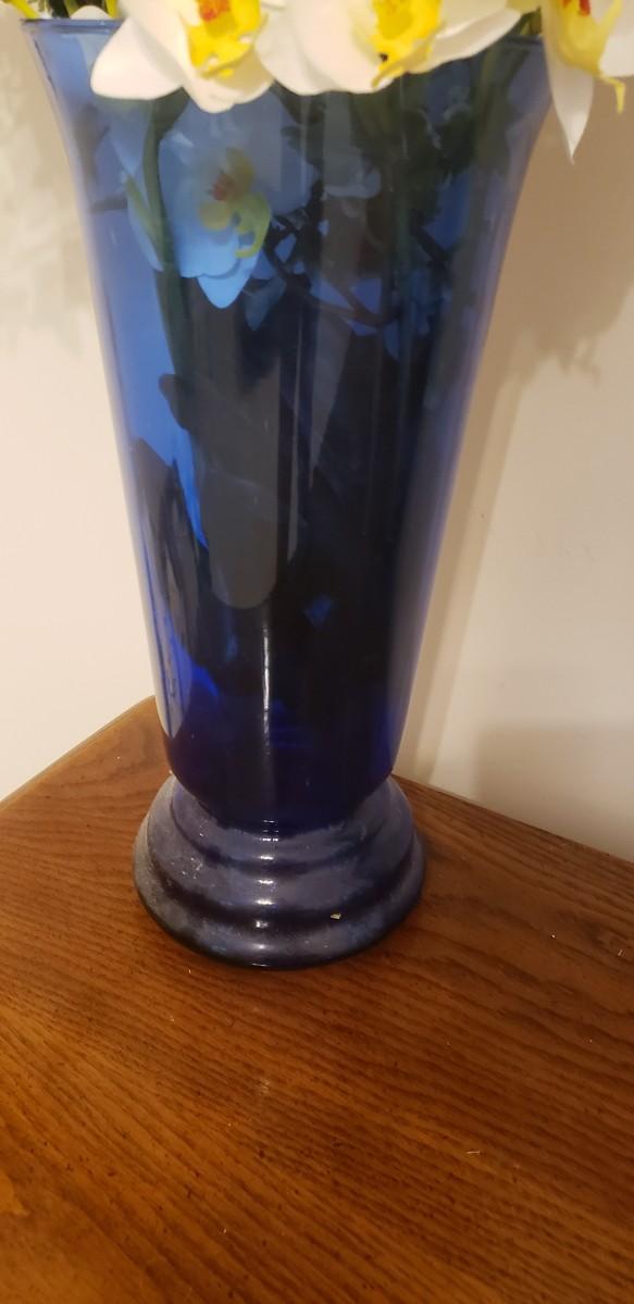 Beautiful Cobalt blue vase with artificial flowers. Stands approximately 18-20 "
