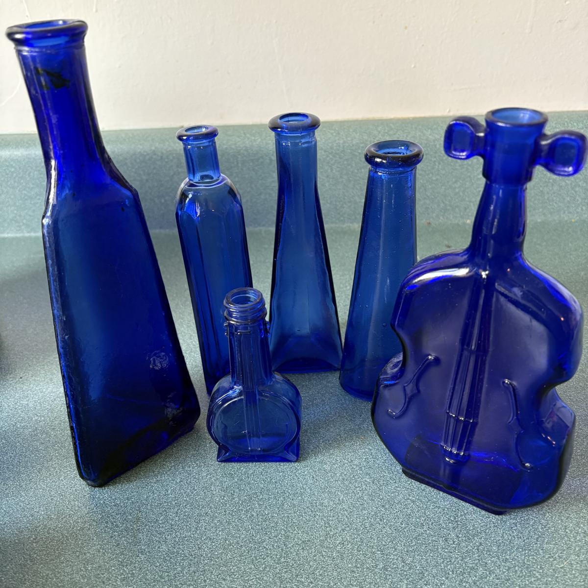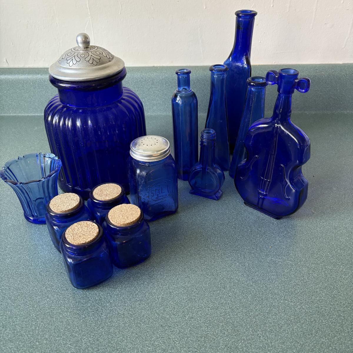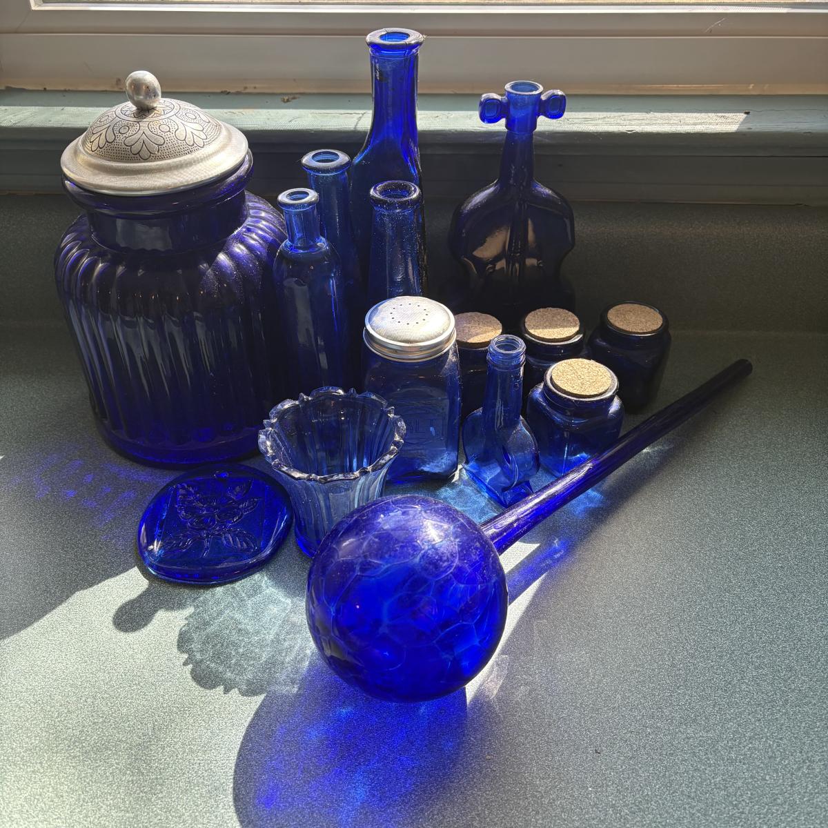 16 piece collection of deep blue glass items. Lot includes traditional bottles and unique treasures too! Stemmed ball garden planter is 3.5”D x 15”, flower decor piece is 3.75” x 4”. Canister is 5.5”D x 7.5”H. Small cork-topped bottles are 2”D x 2.5”H. Tallest bottle is 9.5”H. None of these items are stamped with identifying marks. Shipping available.