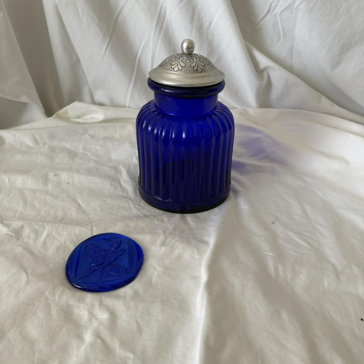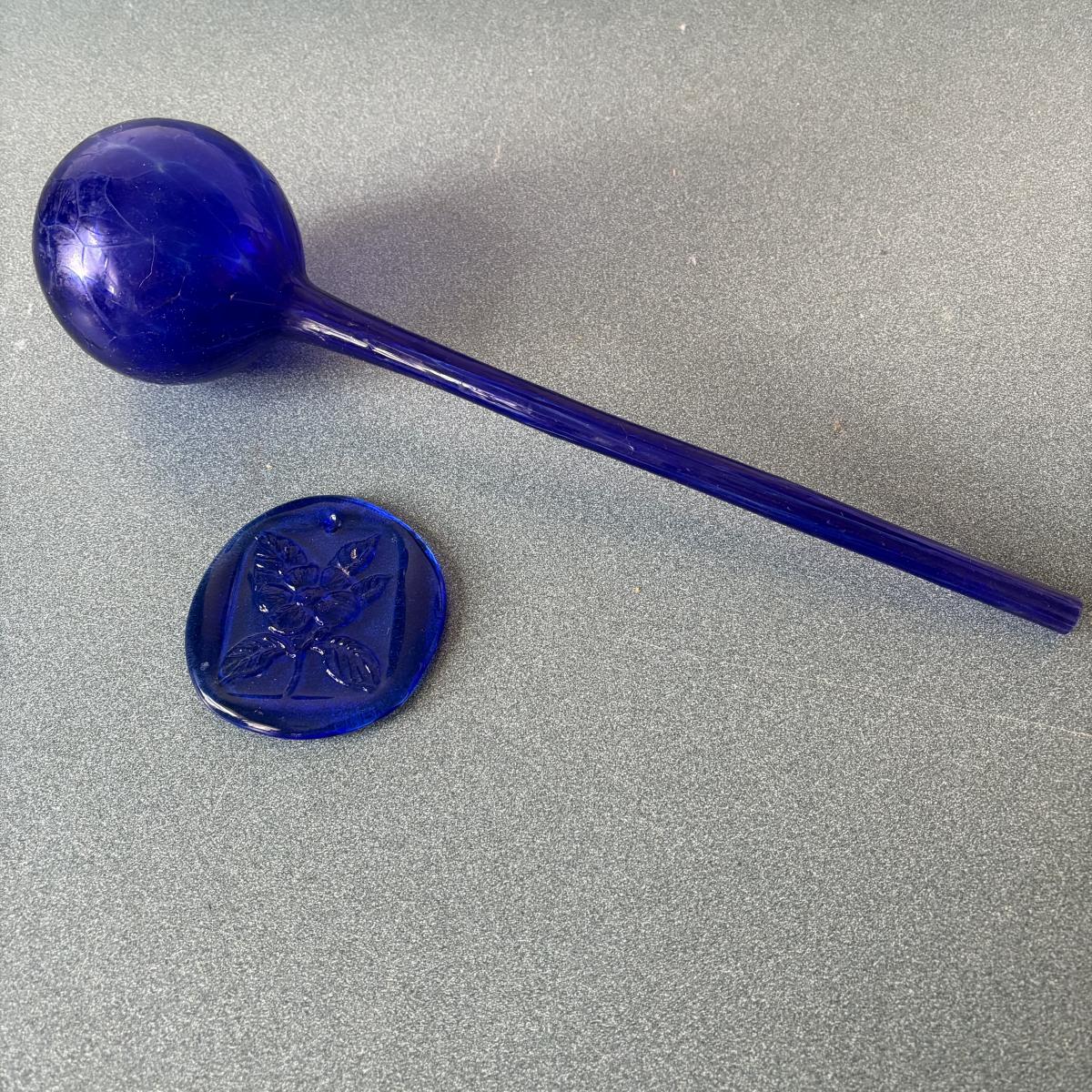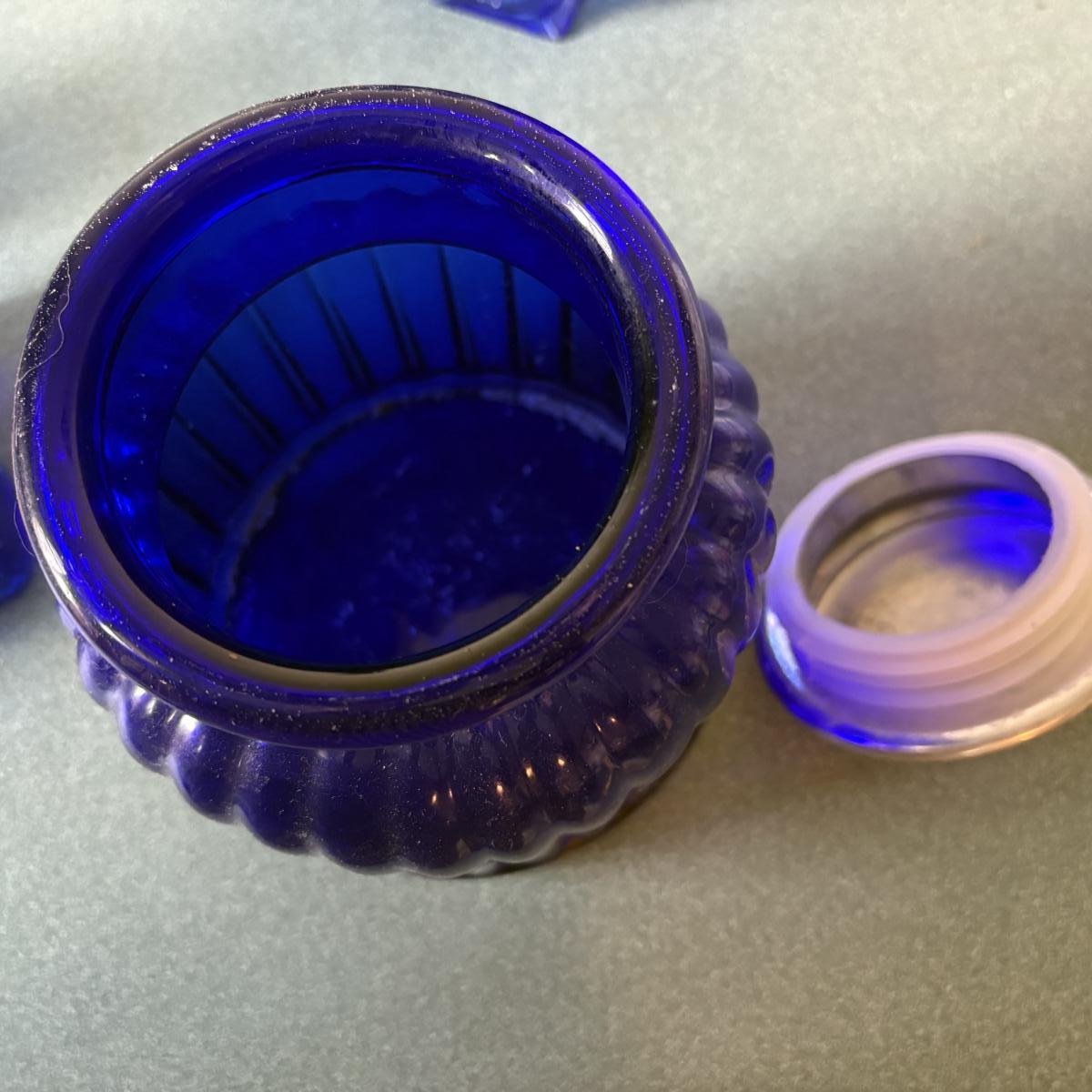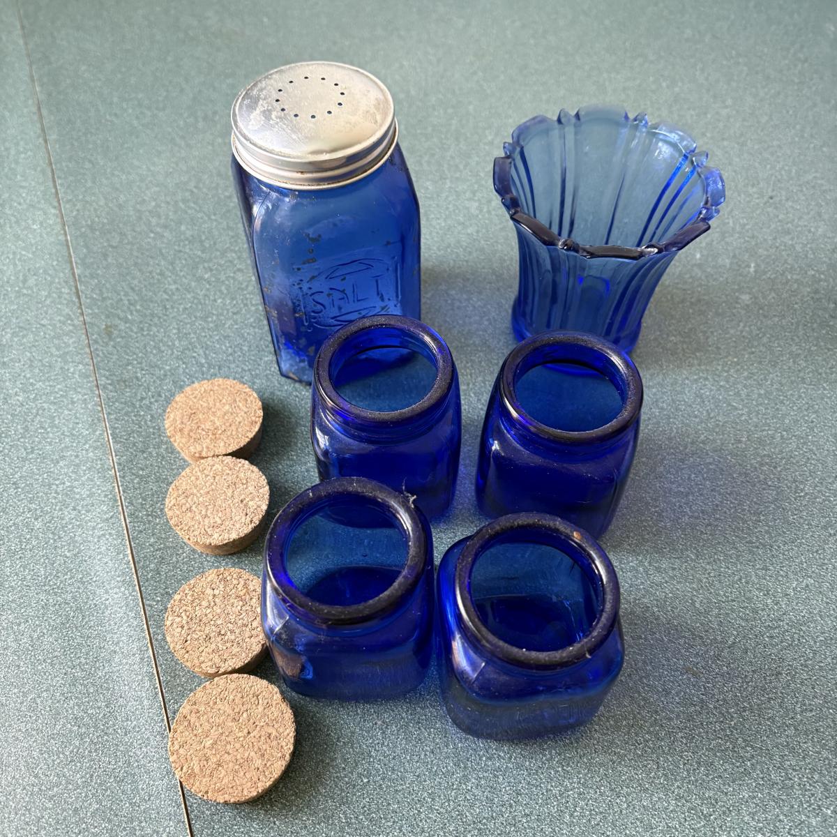 16 piece collection of deep blue glass items. Lot includes traditional bottles and unique treasures too! Stemmed ball garden planter is 3.5”D x 15”, flower decor piece is 3.75” x 4”. Canister is 5.5”D x 7.5”H. Small cork-topped bottles are 2”D x 2.5”H. Tallest bottle is 9.5”H. None of these items are stamped with identifying marks. Shipping available.