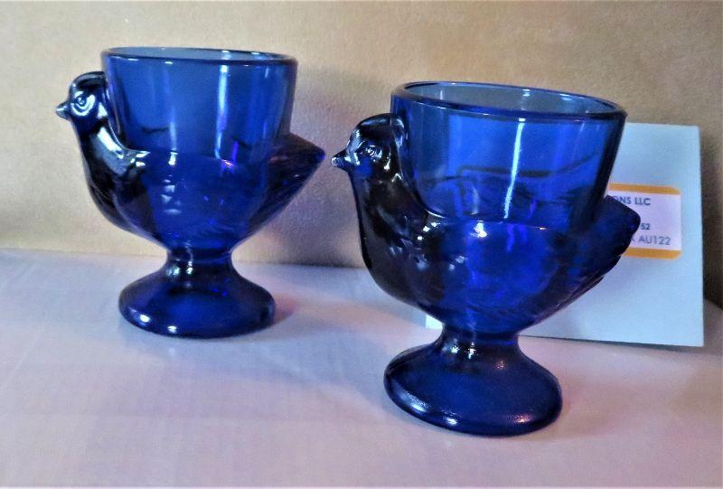 nice (2) Cobalt French Blue Hen Chicken Egg Cups - marked France. Footed Blue Glass. In Good Condition.