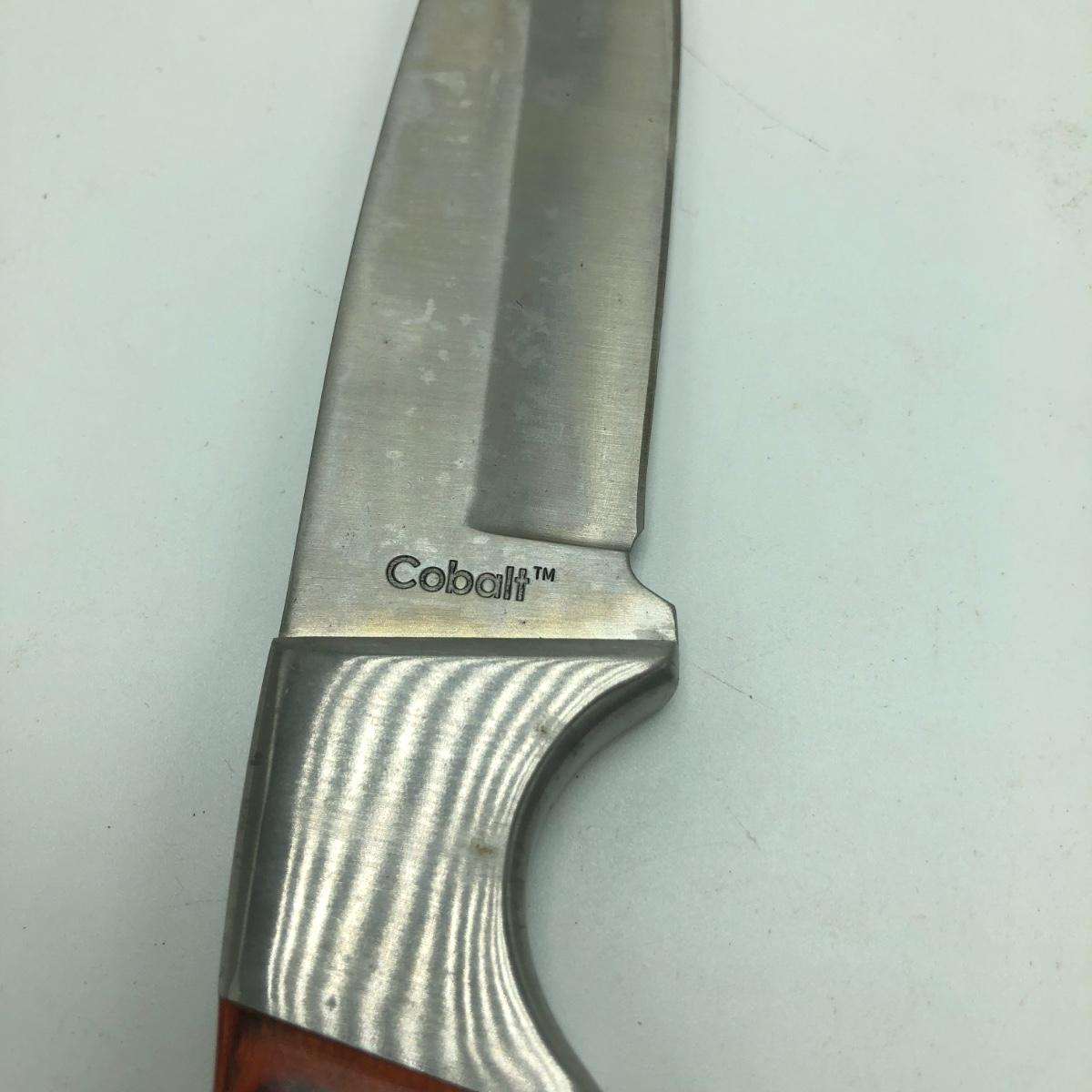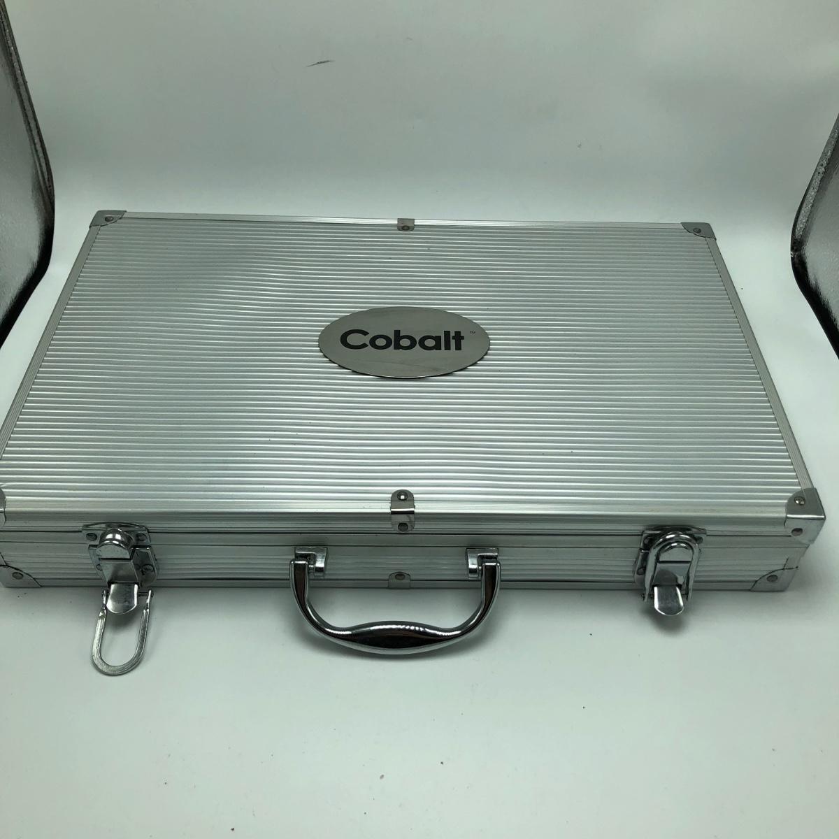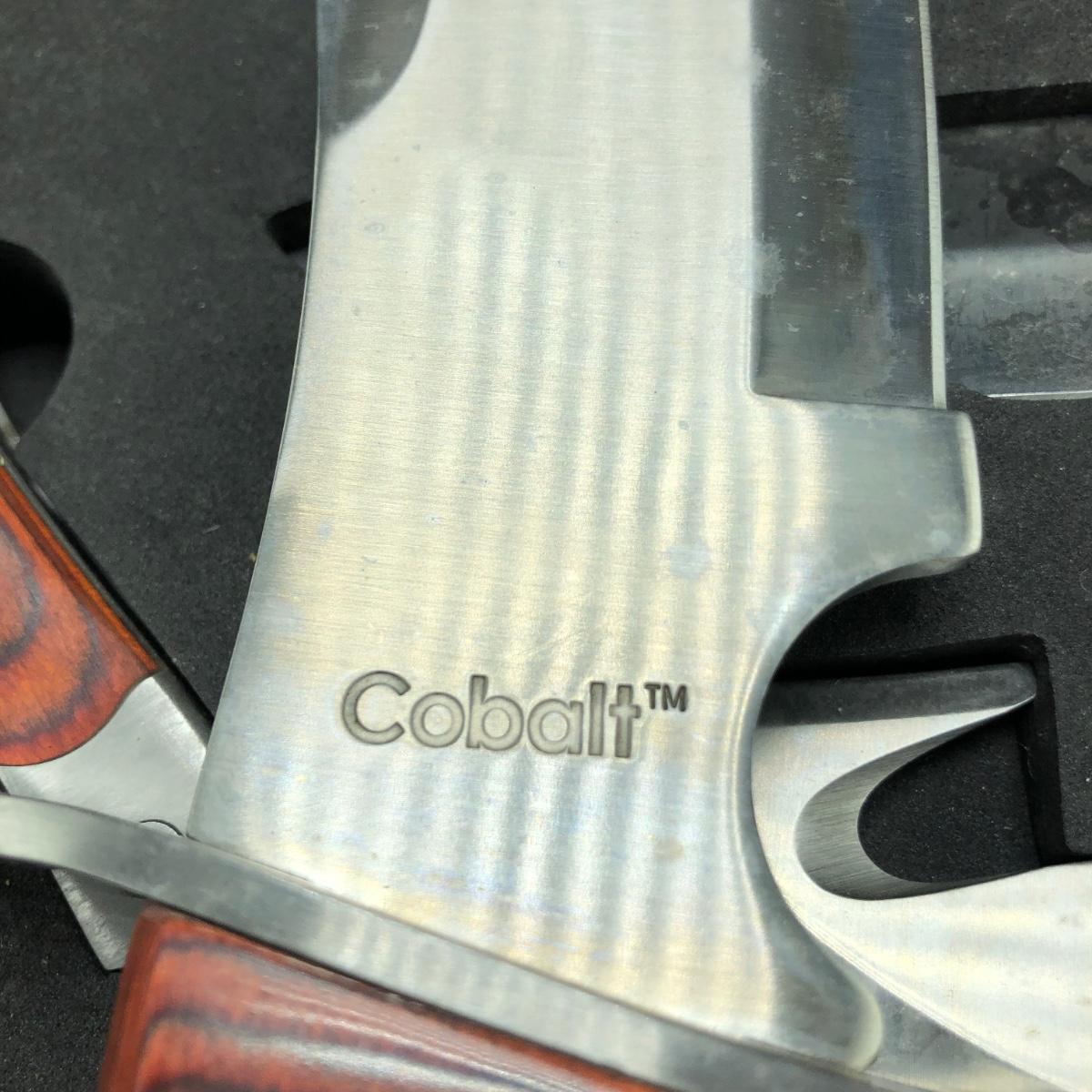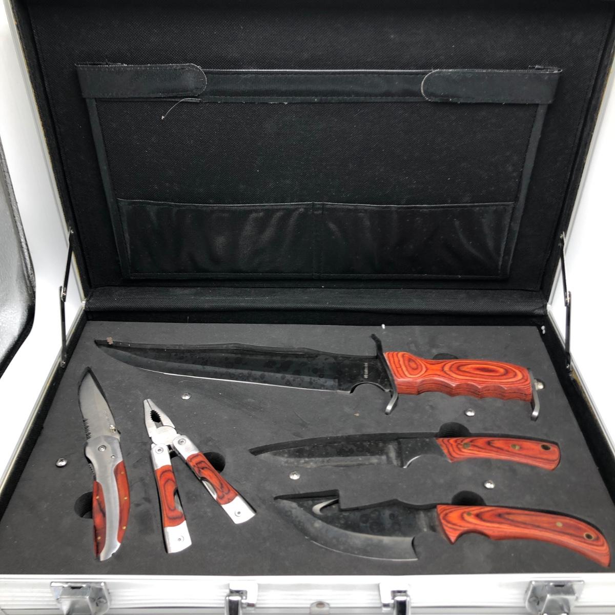 Lot contains a five piece Cobalt set: includes three non-folding knives, one folding knife and a multi-use tool in a aluminum case marked Cobalt. Longest knife measures 15.5”.