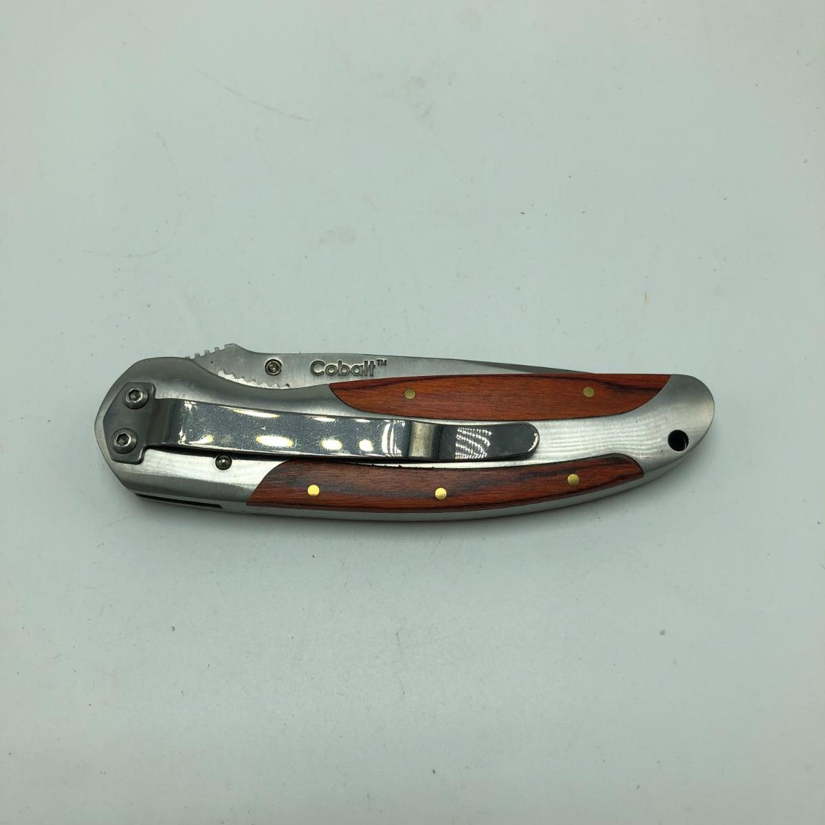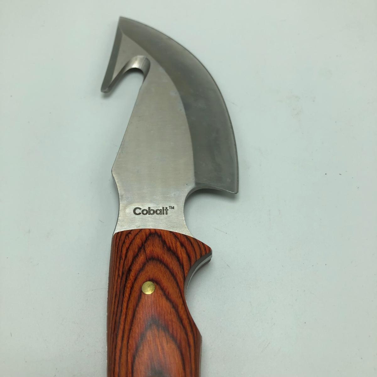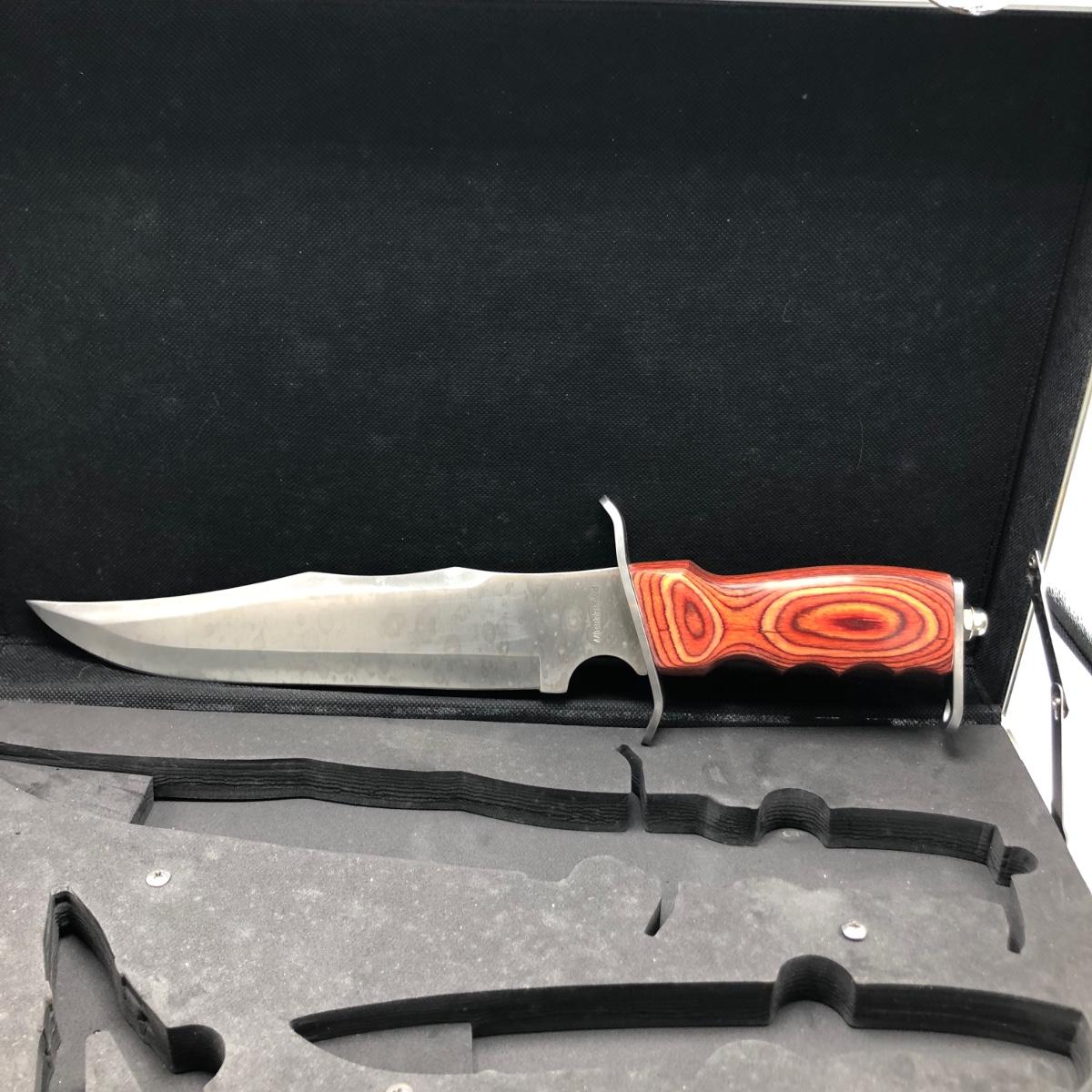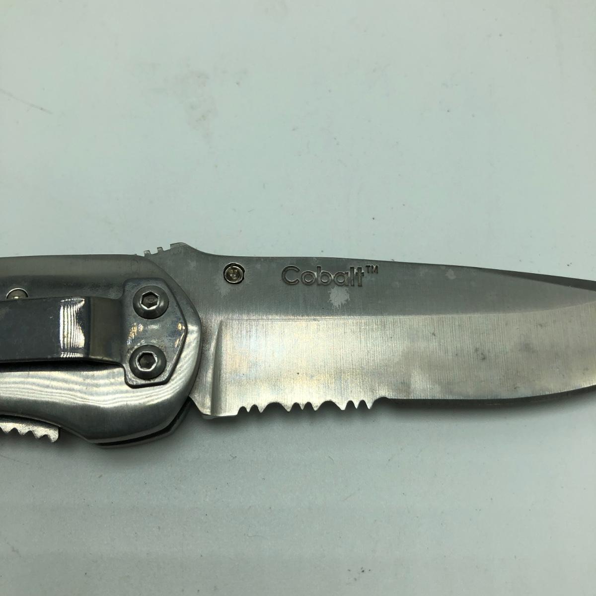 Lot contains a five piece Cobalt set: includes three non-folding knives, one folding knife and a multi-use tool in a aluminum case marked Cobalt. Longest knife measures 15.5”.
