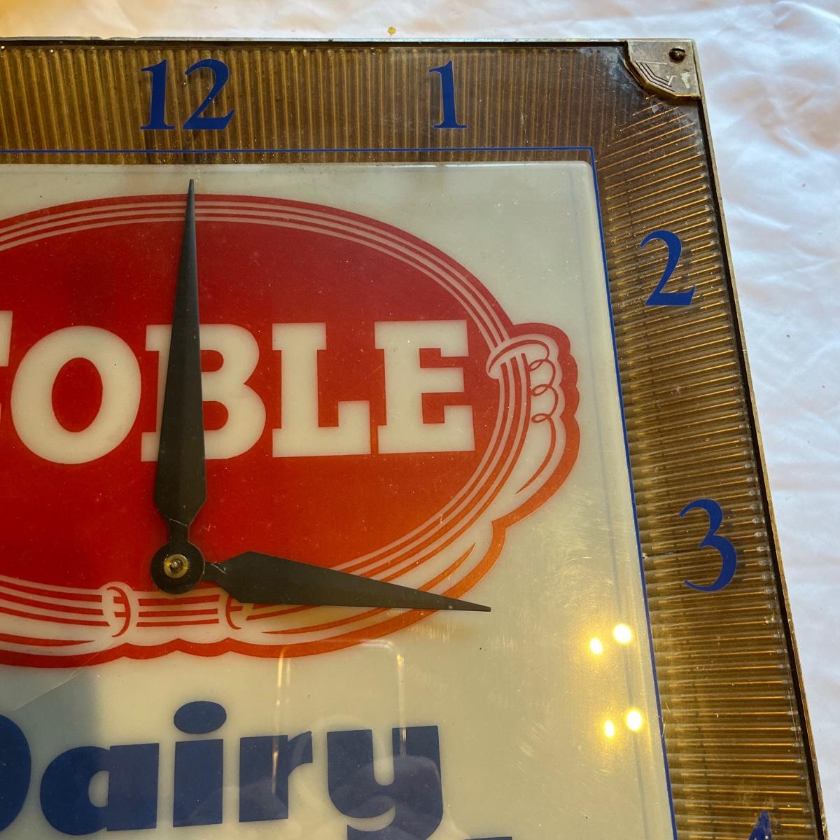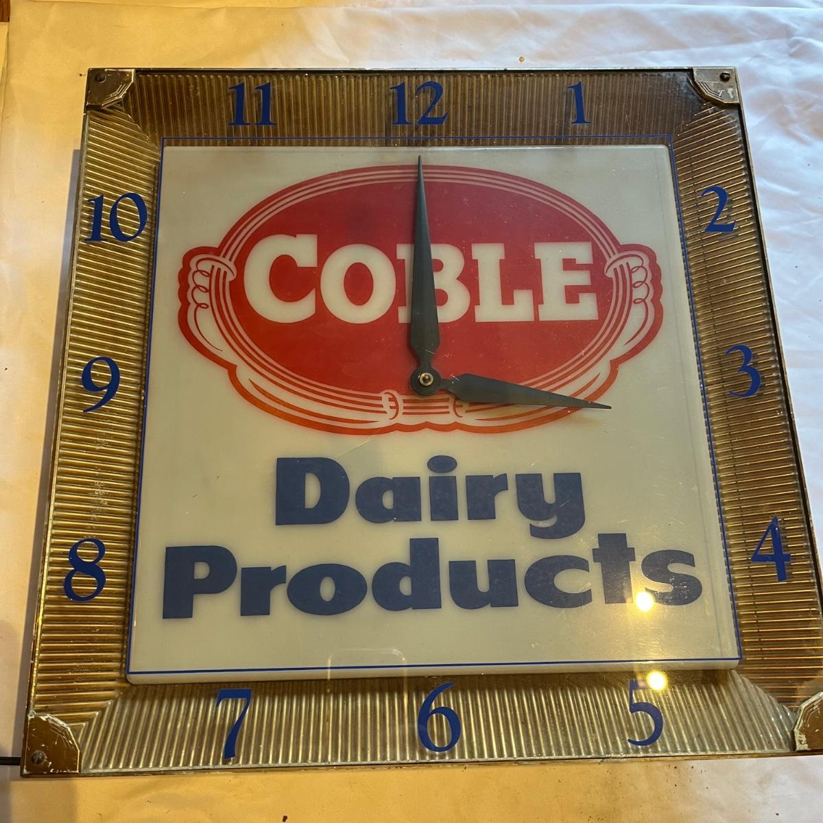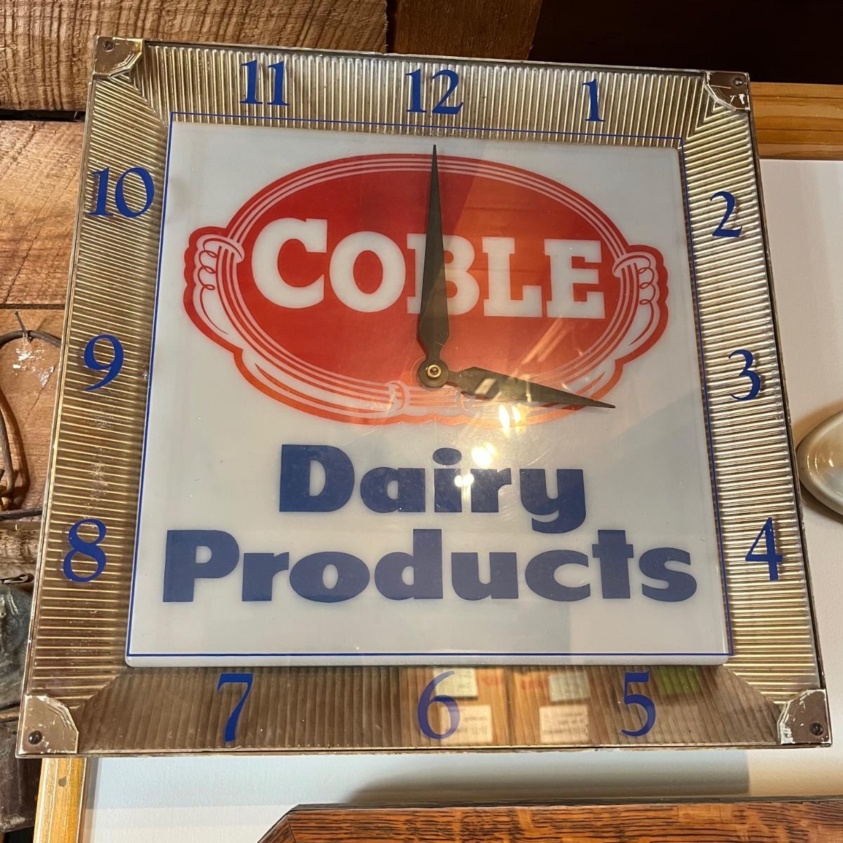 Lot includes an electric wall clock with vintage advertising for Coble Dairy Products. Clock is plastic with plexiglass front. Clock worked when tested. Clock measures 15.5” x 15.5” x 3.75”.