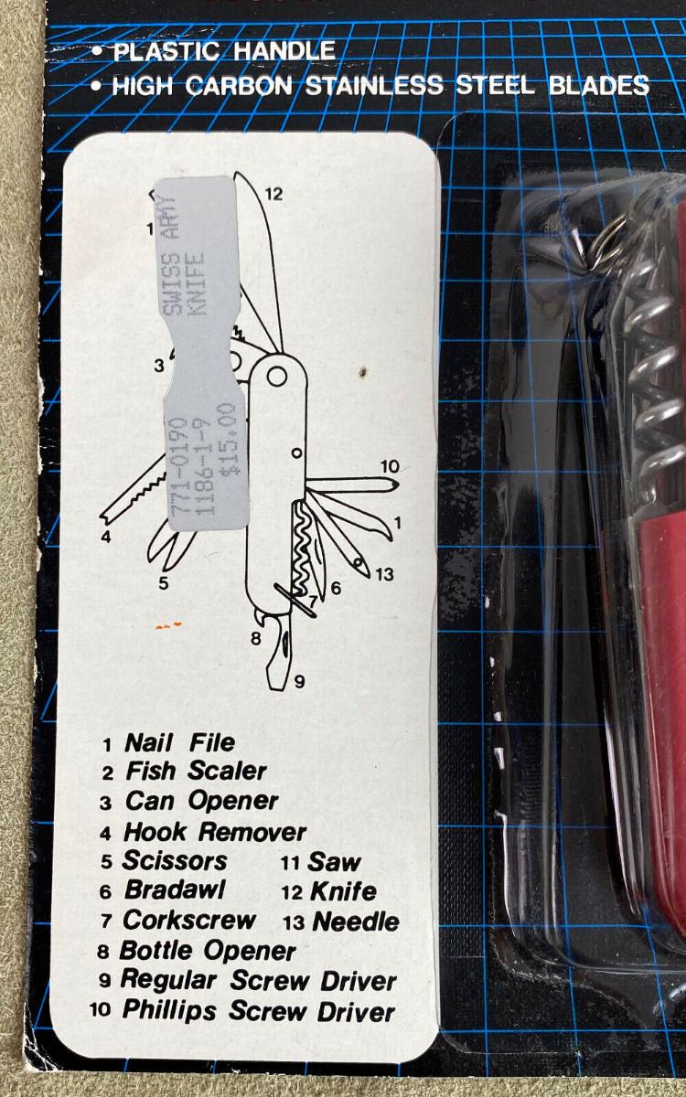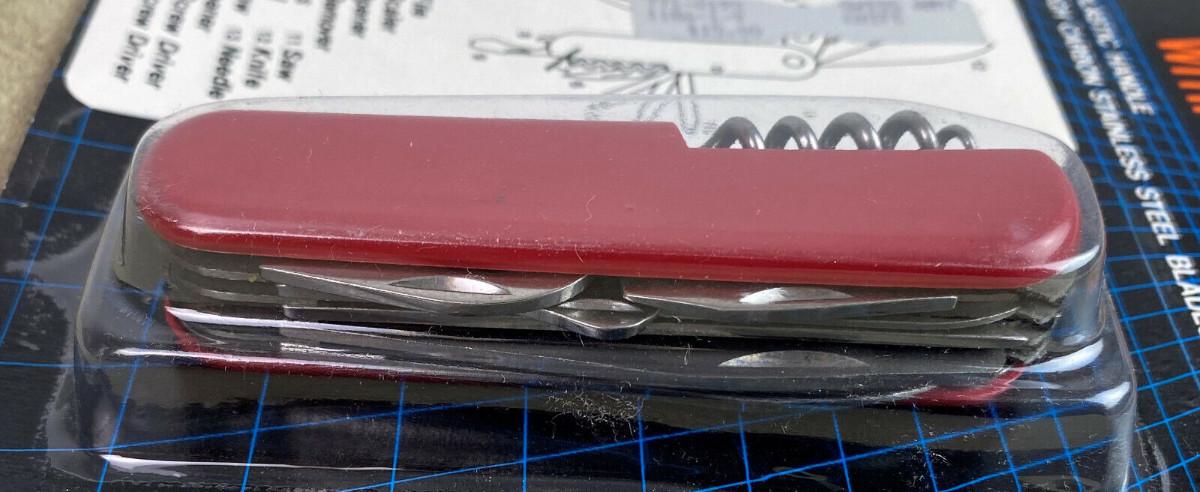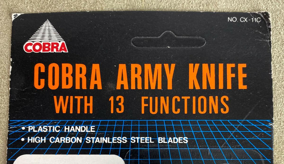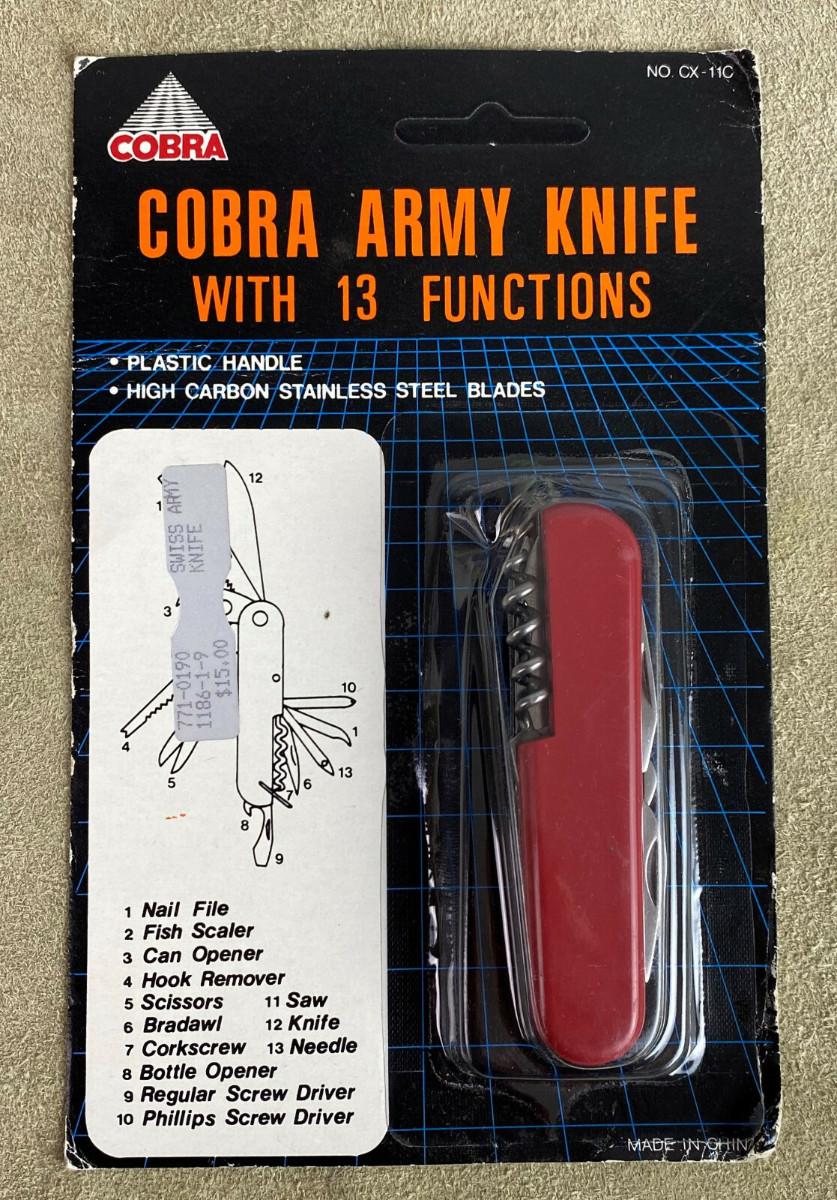 New old stock COBRA ARMY KNIFE WITH 13 FUNCTIONS...Plastic handle..High carbon stainless steel blades...Closed 3.5"...No. CX-11C...As shown.