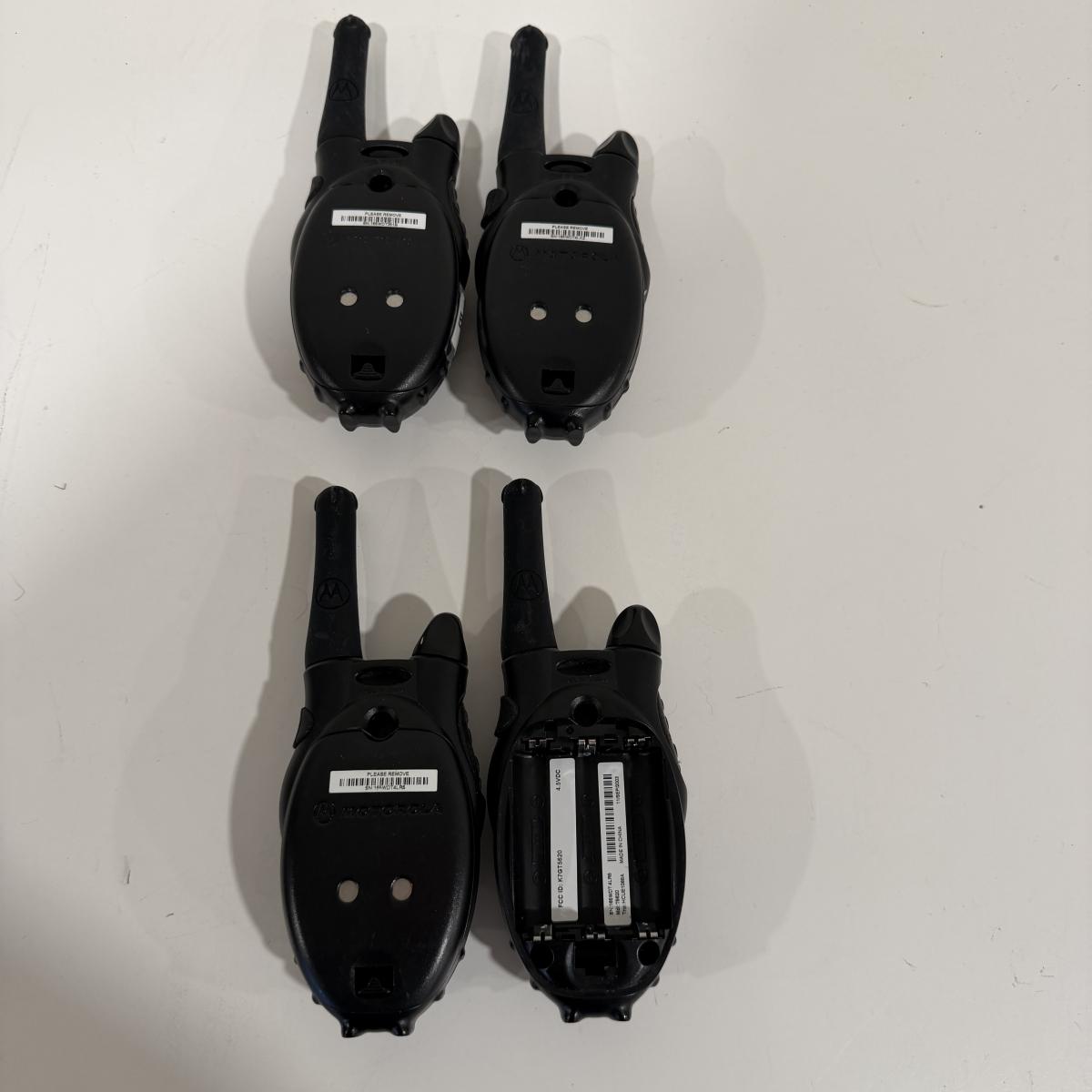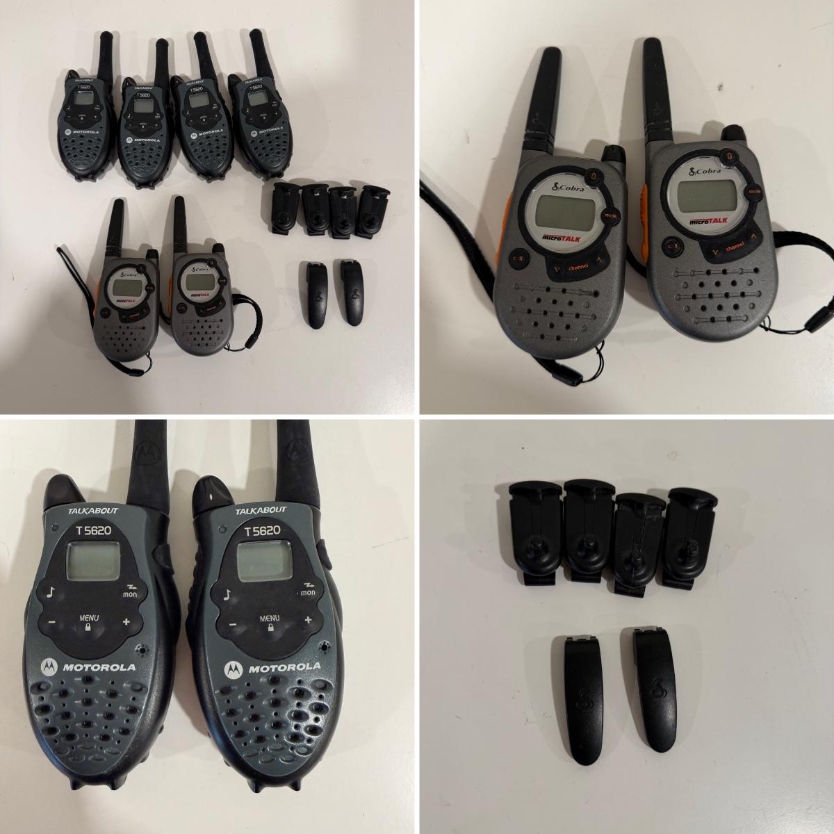 Lot includes four Motorola two-way radios and two Cobra two-way radios. All radios powered on when batteries were inserted.