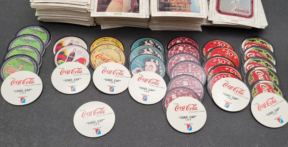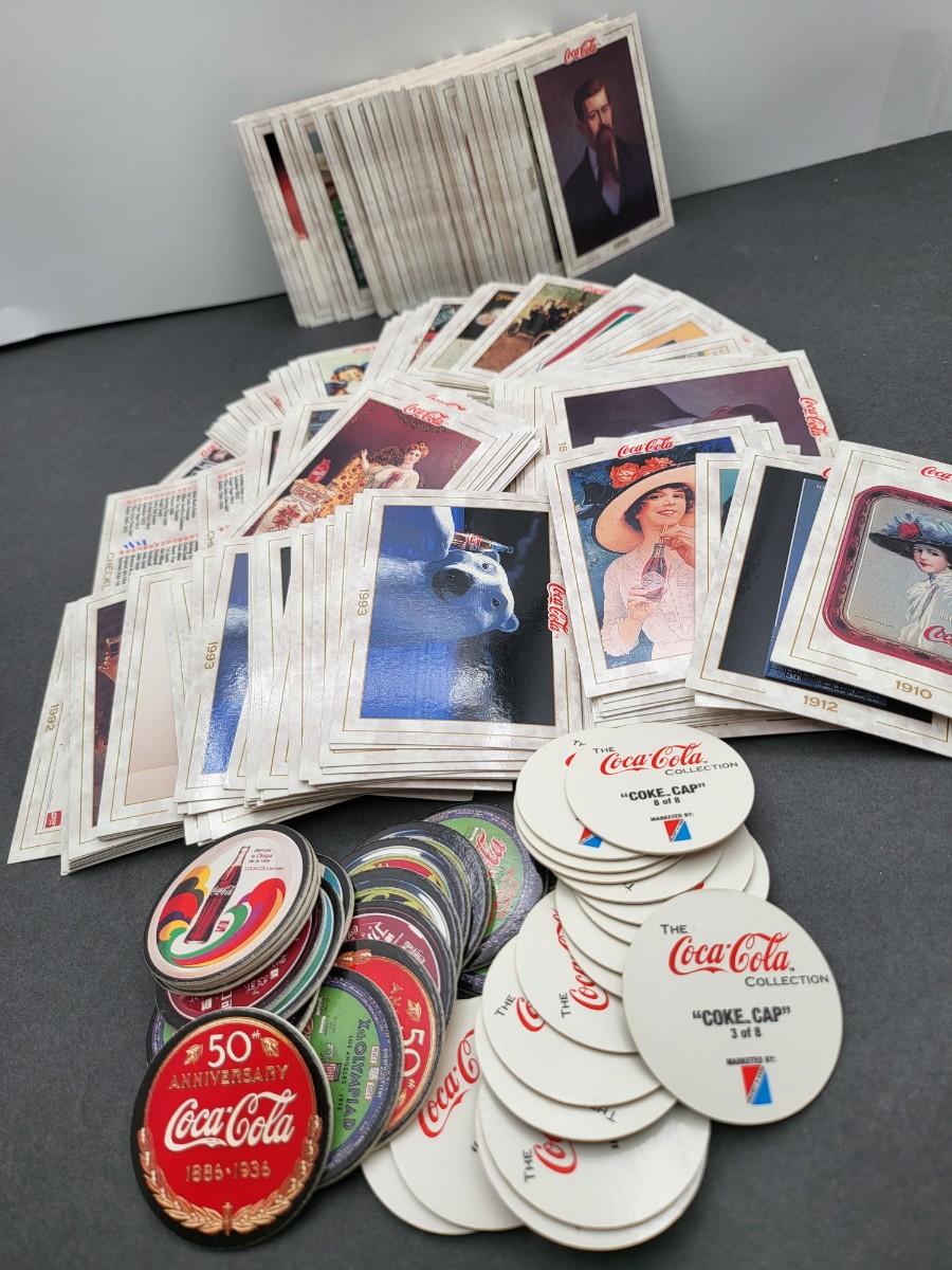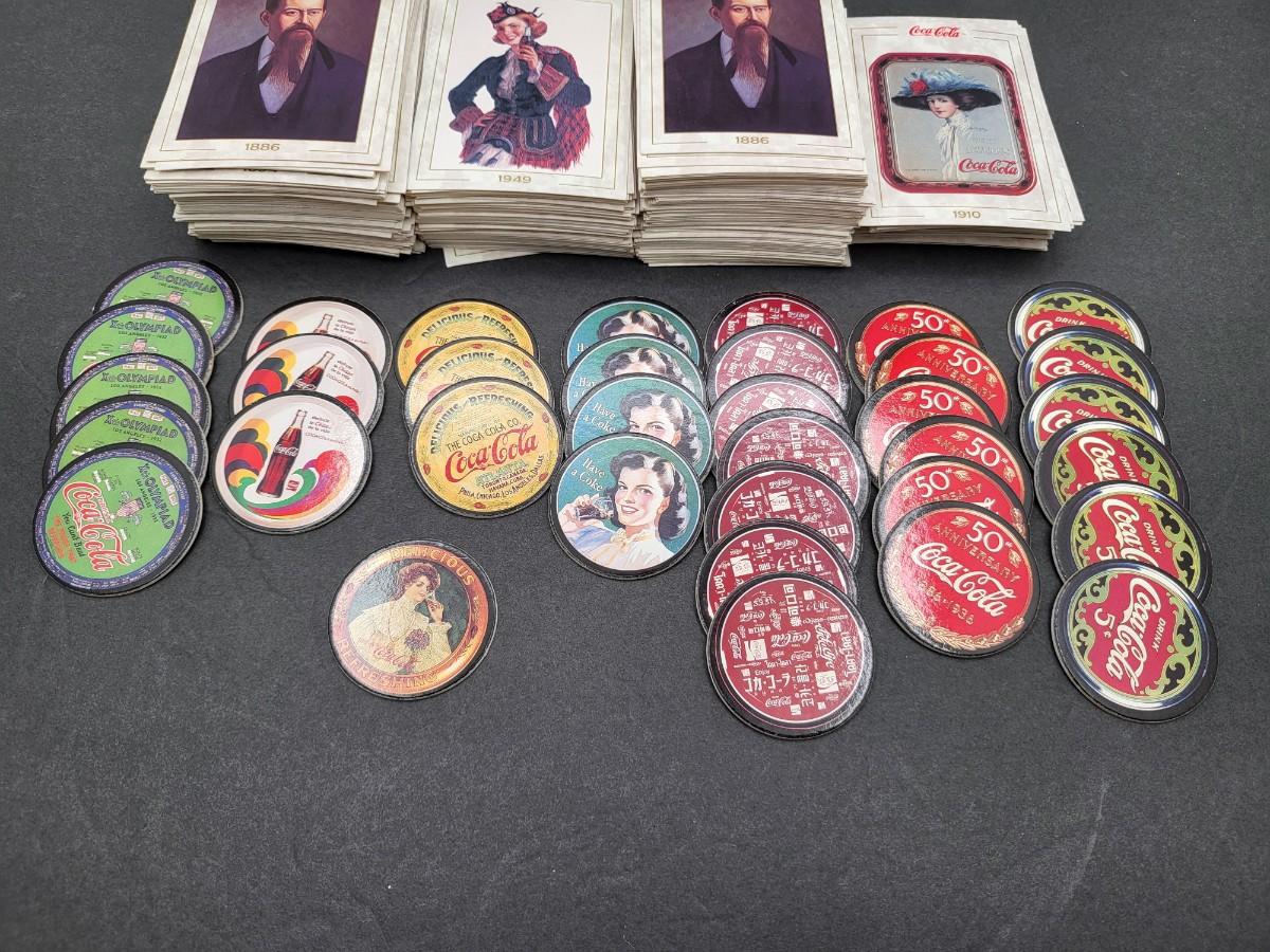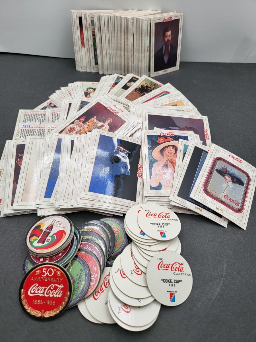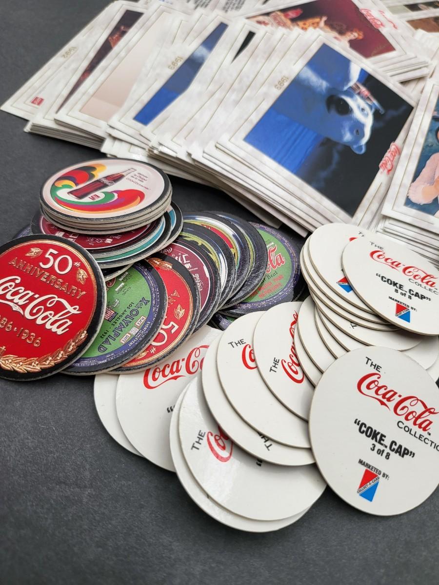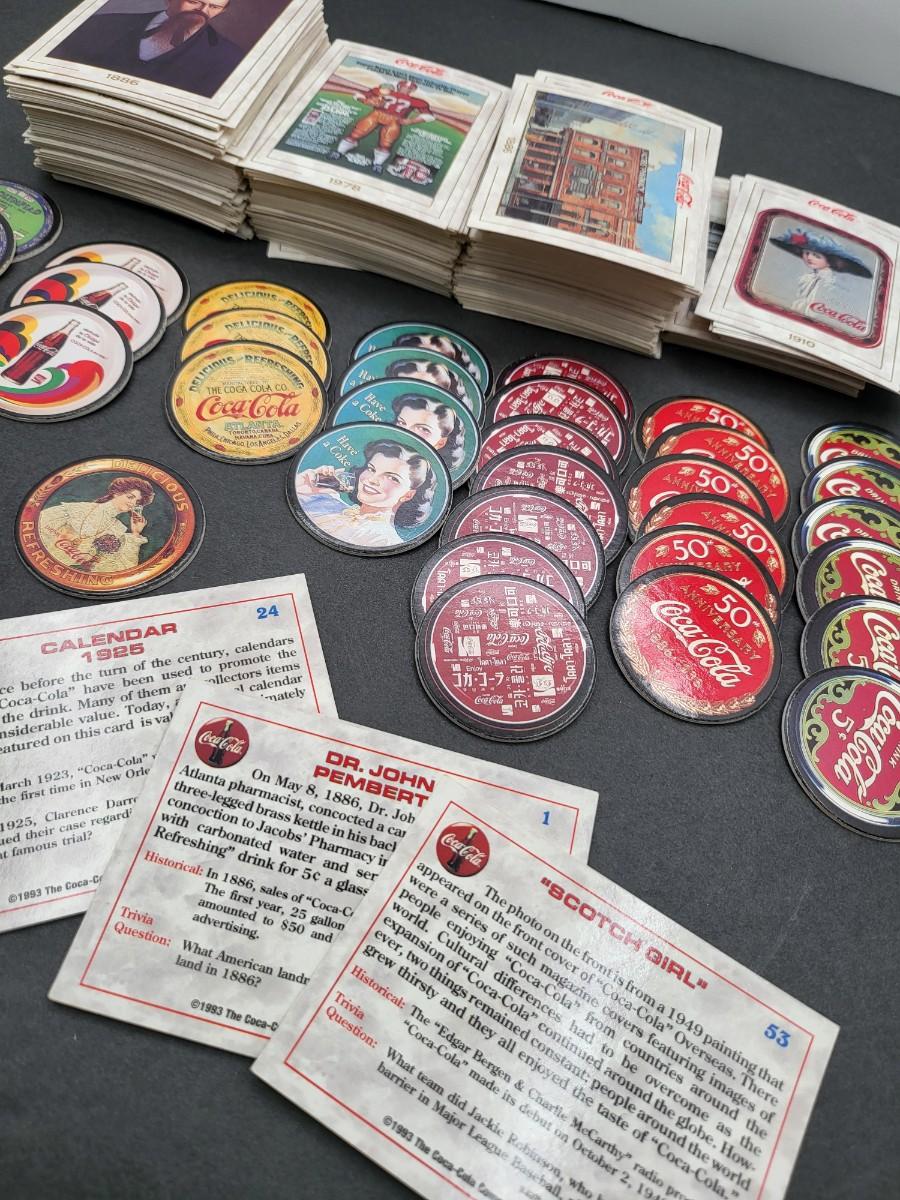 1993 Coca Cola cards, some duplicstes. Coca Cola advertisi g cardboard cap tokens. You will receive all the cards and caps pictured!