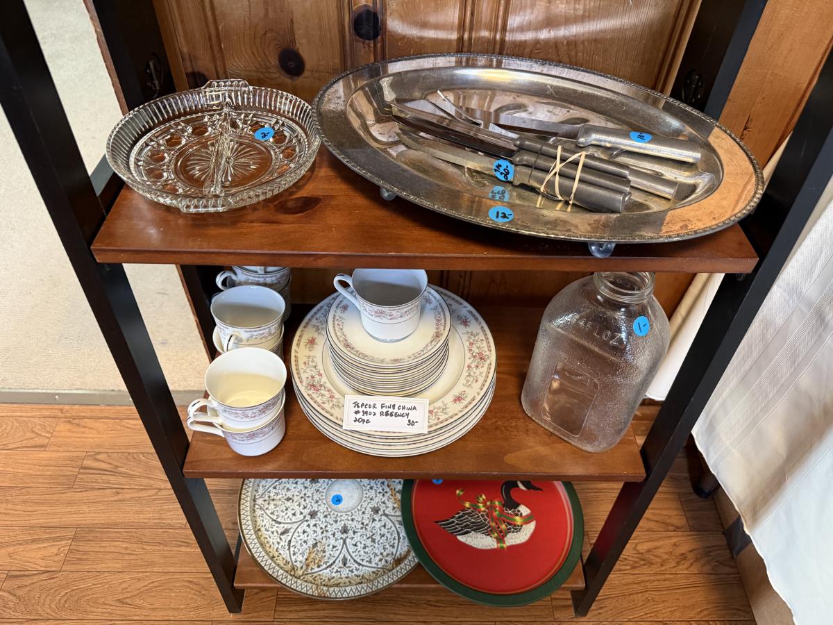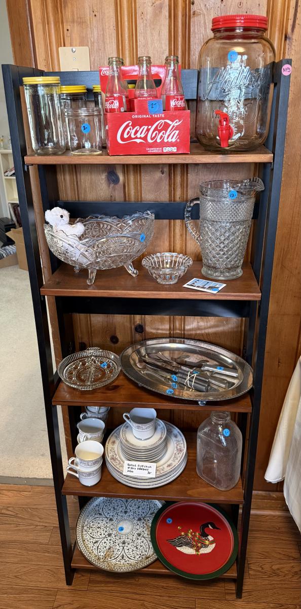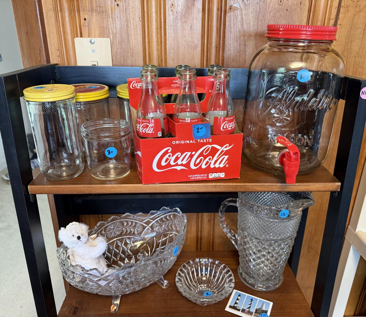 Coca Cola bottles, Aladdin dispenser, Peter Pan jars, China set, crystal bowl, glass pitcher, tins, meat tray, Rada cutlery, etc