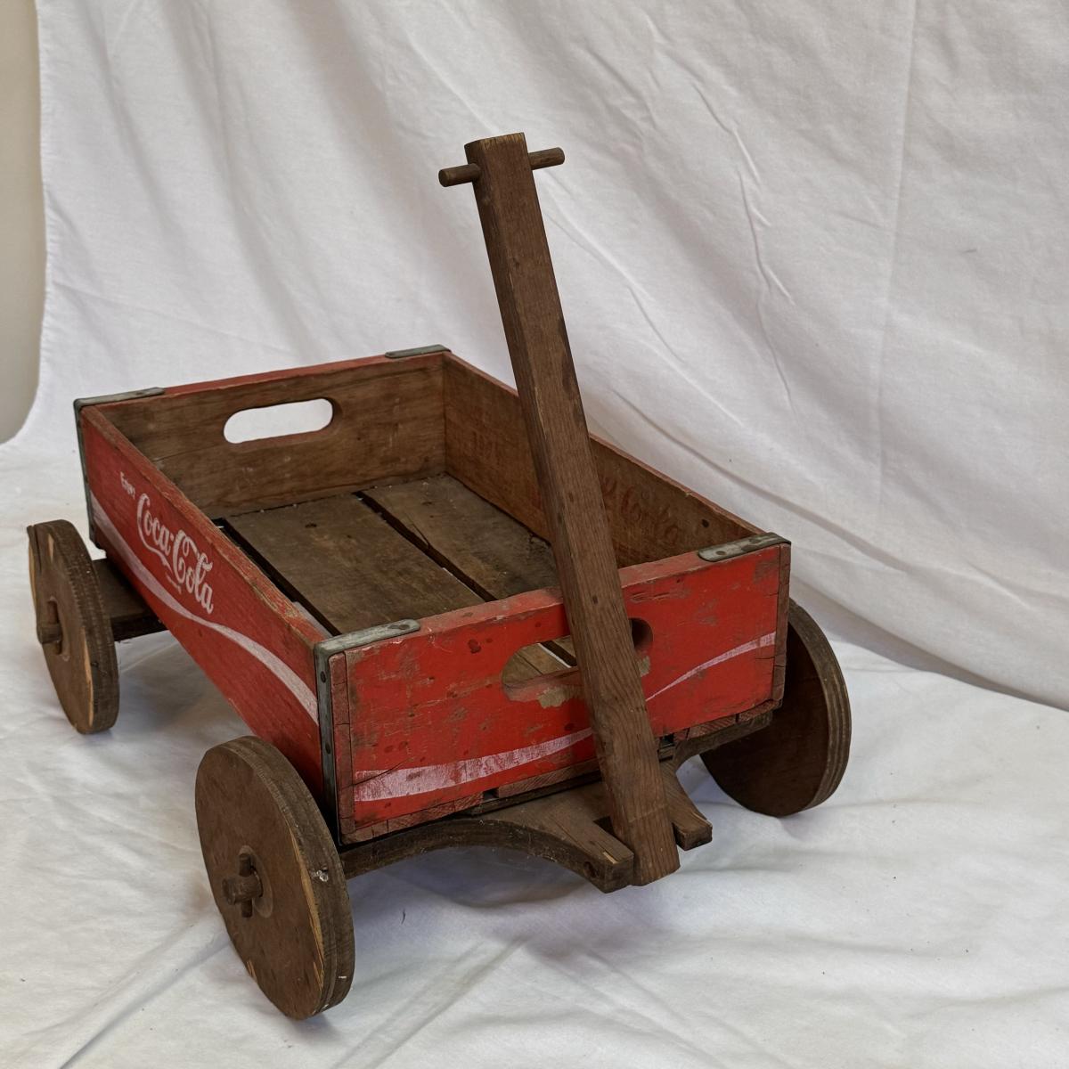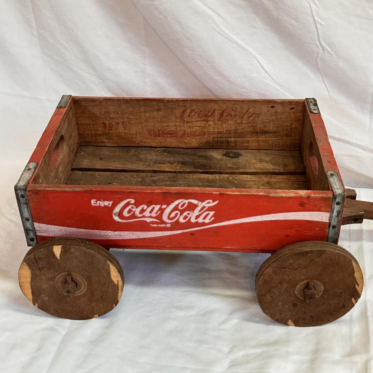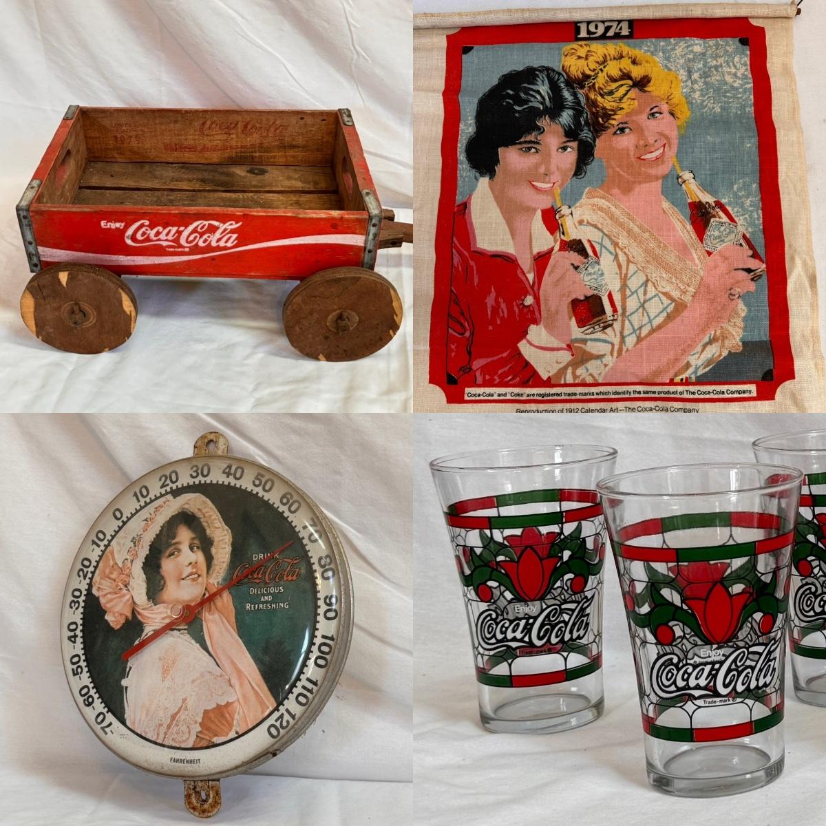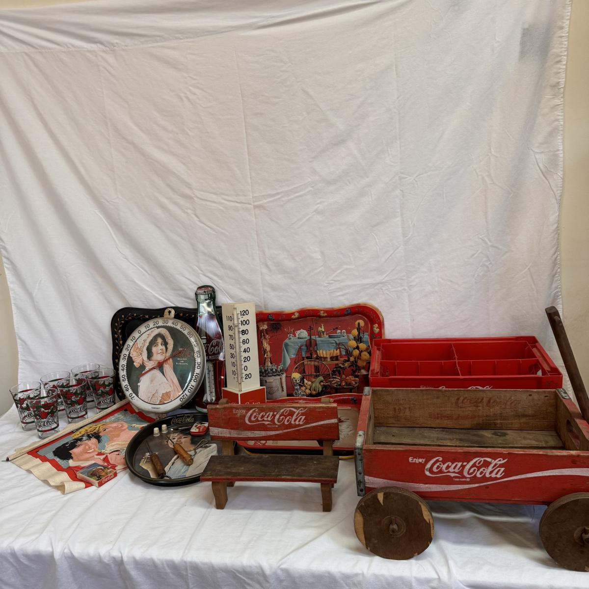 This lot includes a handful of unique Coca Cola collectibles. You’ll find two plastic crates, three different thermometers, a calendar from the 70s, small wooden bench for doll, small wooden wagon, several trays, playing cards, bottle openers, and more. You’ll also find a set of six glasses. The largest items are the plastic crates that individually measure 18.5” x 12” x 5.5”H. Shipping available.
