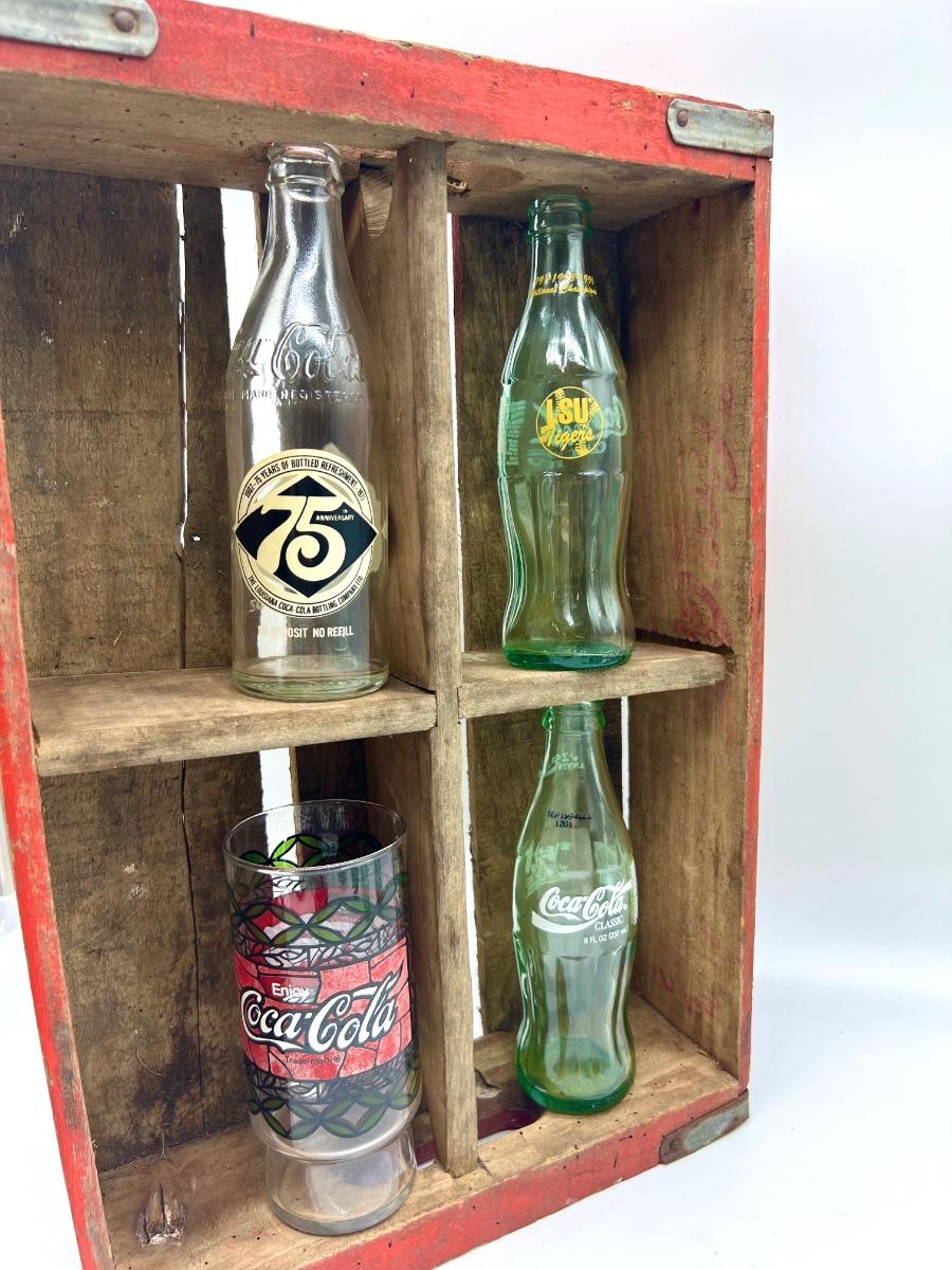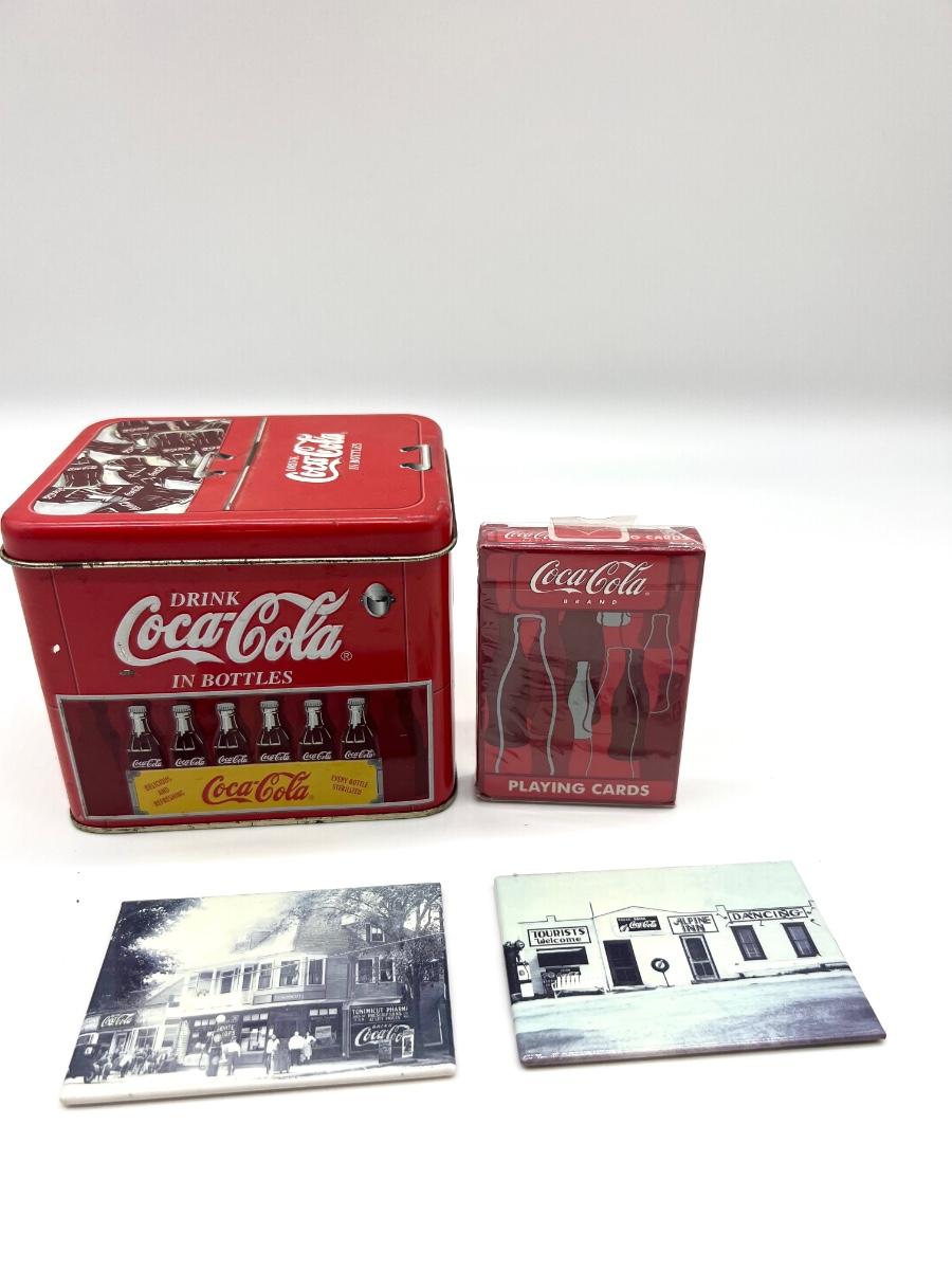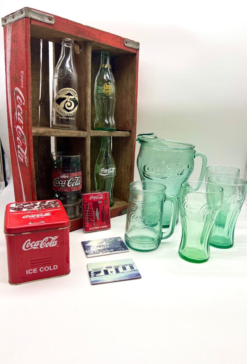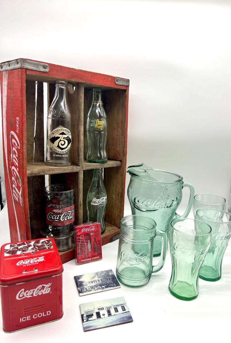 What a great Coca Cola lot includes vintage Coca Cola crate, 3 glass bottles, 1 Coca Cola glass, Coca Cola pitcher and 3 matching glasses, 1 glass mug, two magnets, deck of playing cards and a Coca Cola decorative tin.