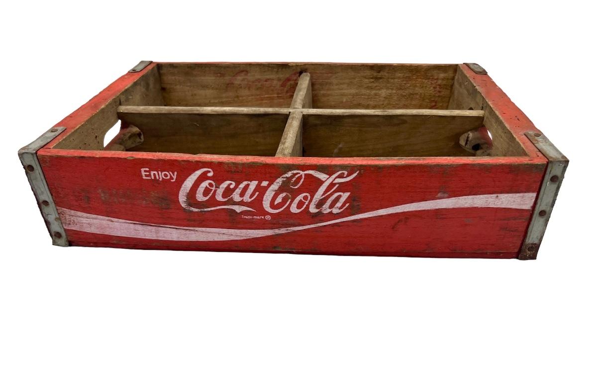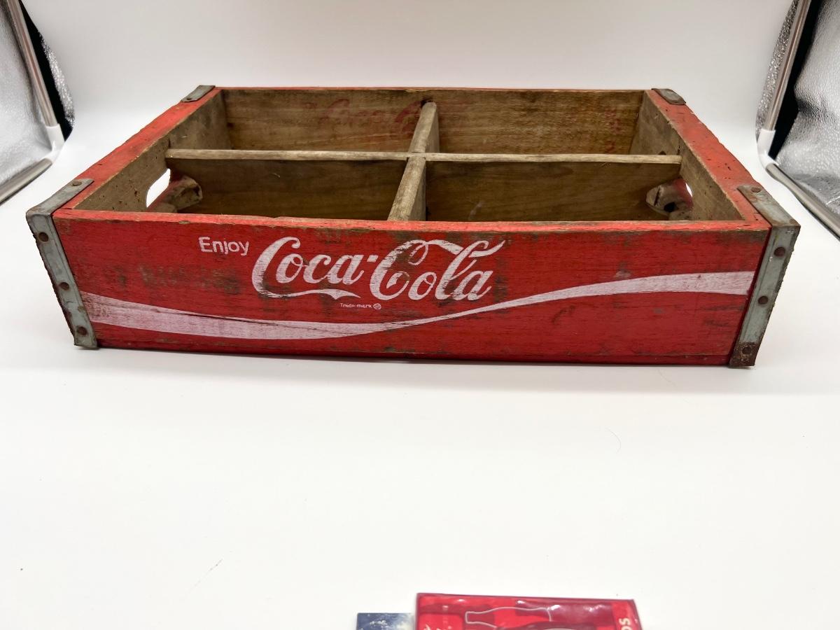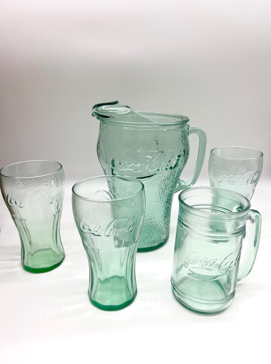 What a great Coca Cola lot includes vintage Coca Cola crate, 3 glass bottles, 1 Coca Cola glass, Coca Cola pitcher and 3 matching glasses, 1 glass mug, two magnets, deck of playing cards and a Coca Cola decorative tin.