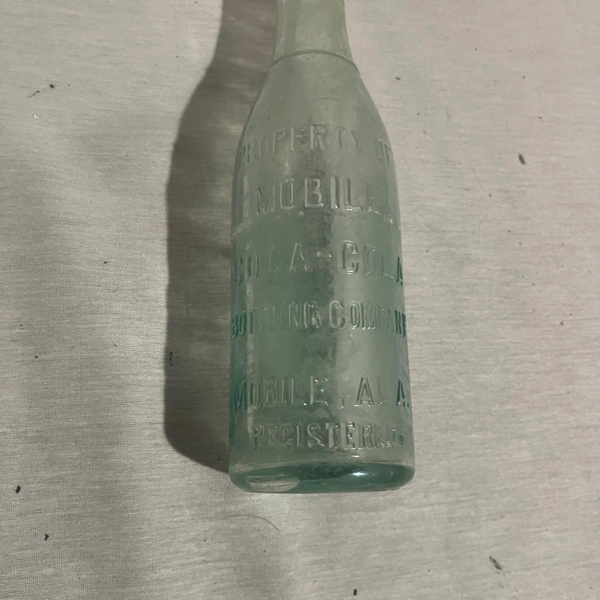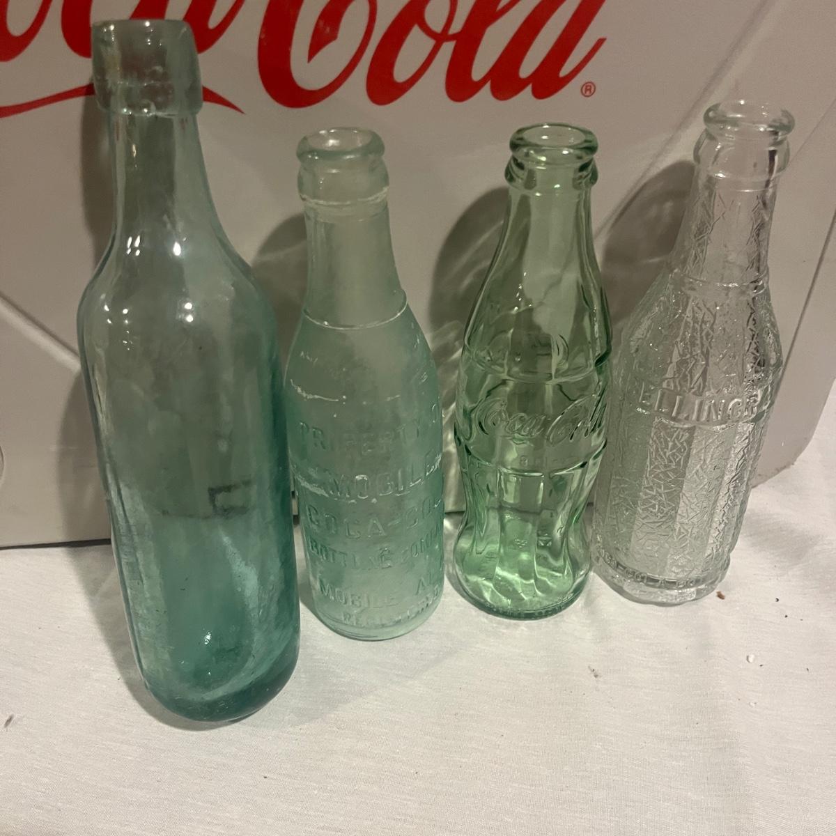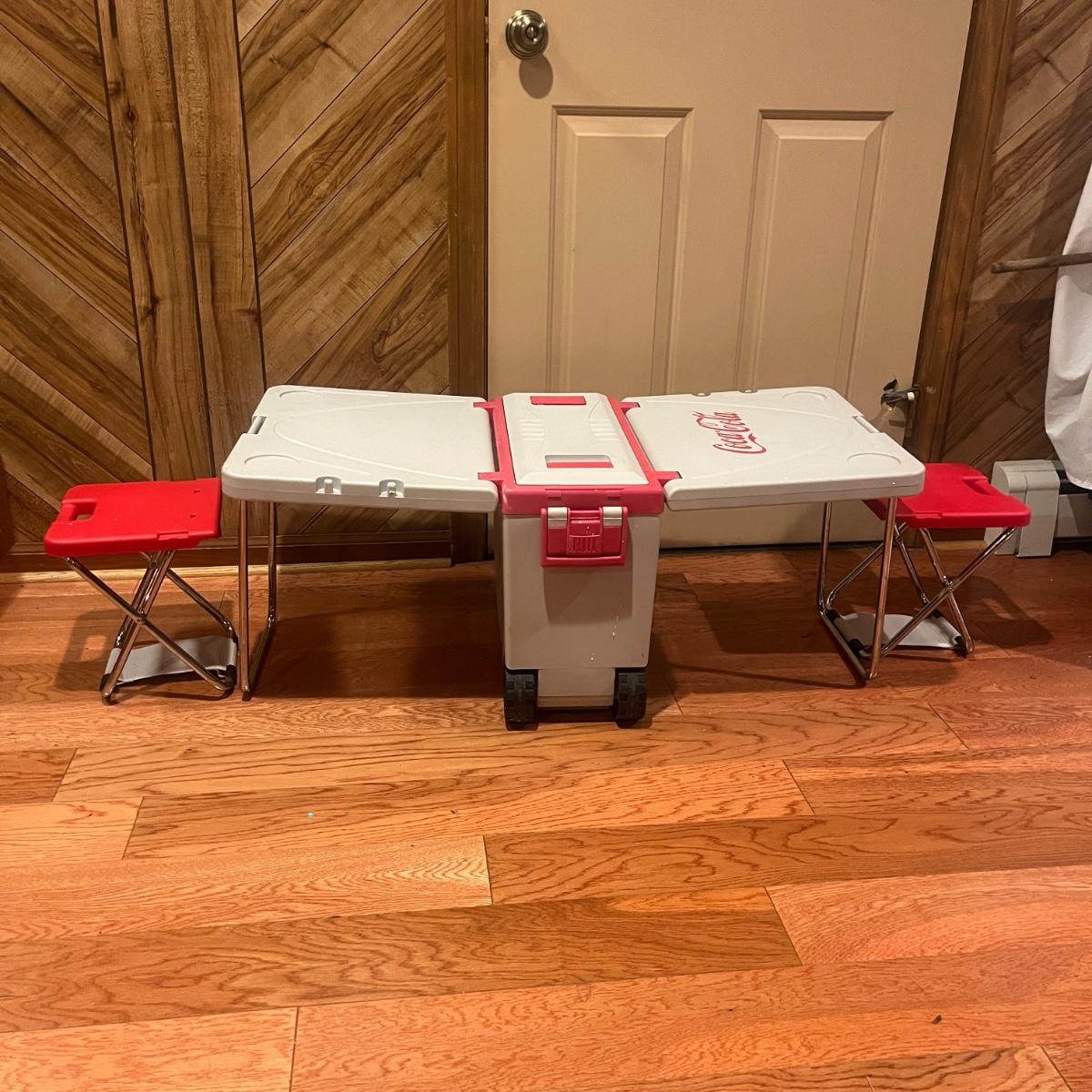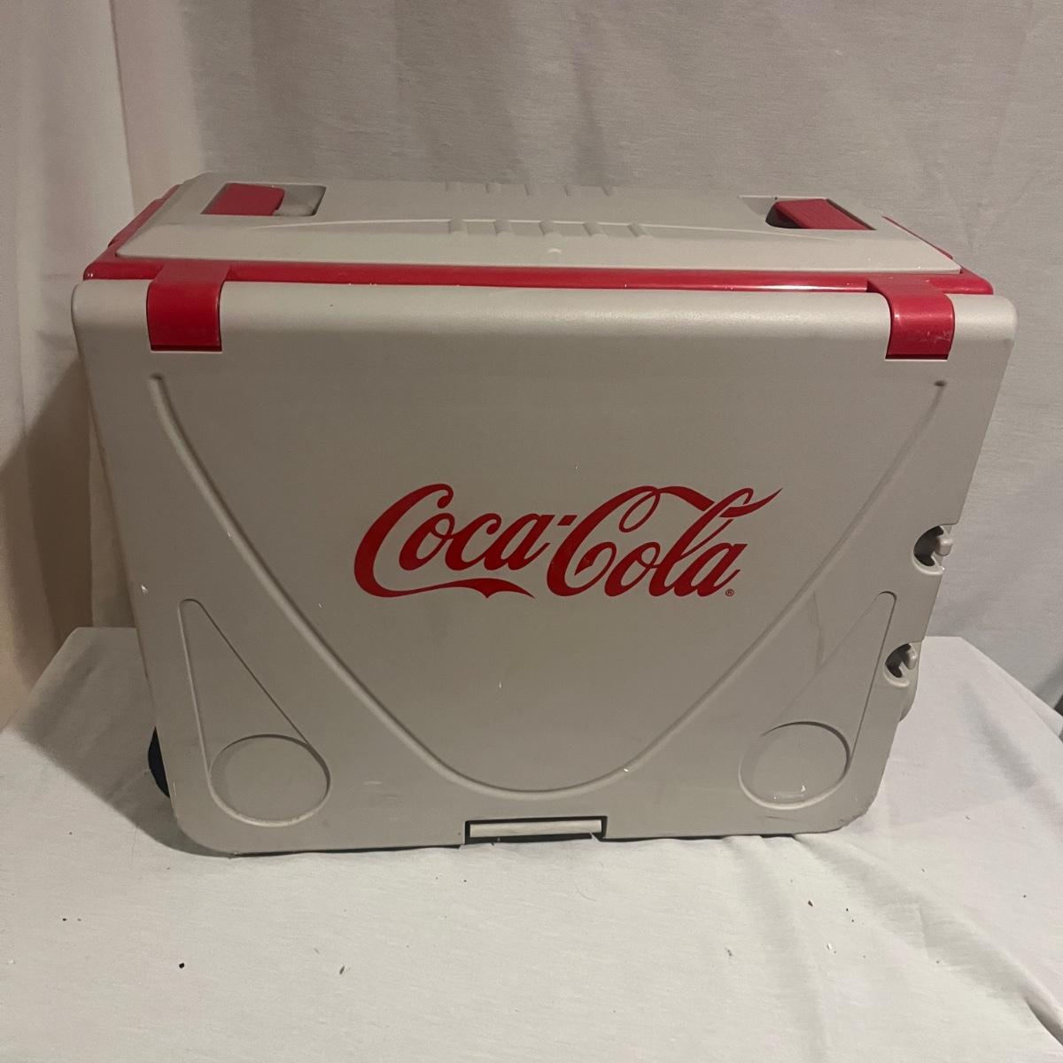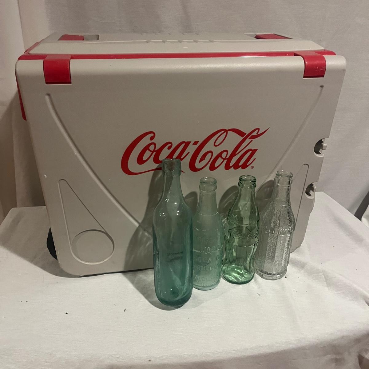 Lot includes a plastic Rolling Coca Cola cooler with two built in drop leafs that hold two small chairs. Also includes four bottles with two marked Coca Cola, Bellingrath Beverages bottle and a round bottom unmarked bottle. Cooler measures 36” x 20” x 14”H when open and 12” x 20” x 14”H when drop leafs are closed.
