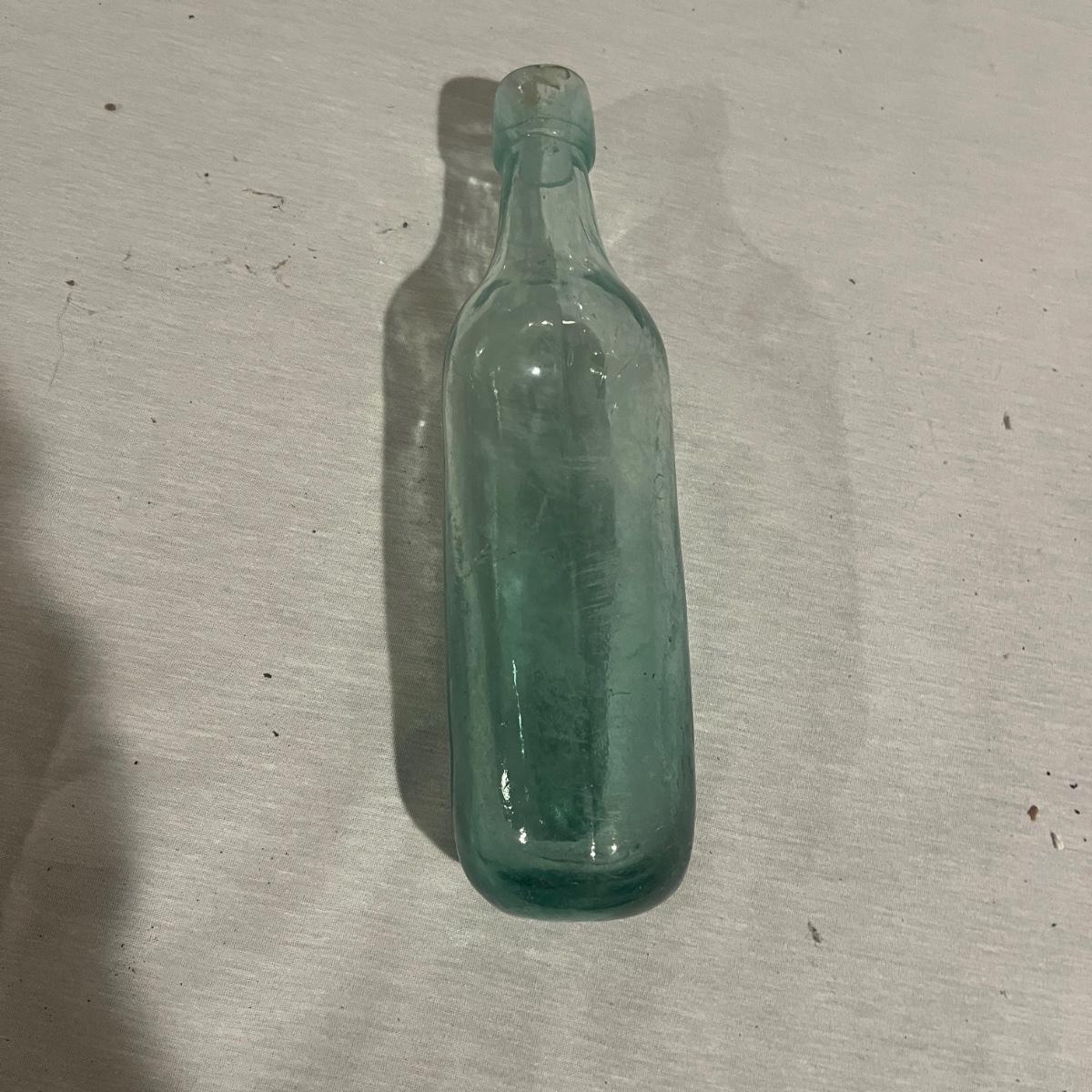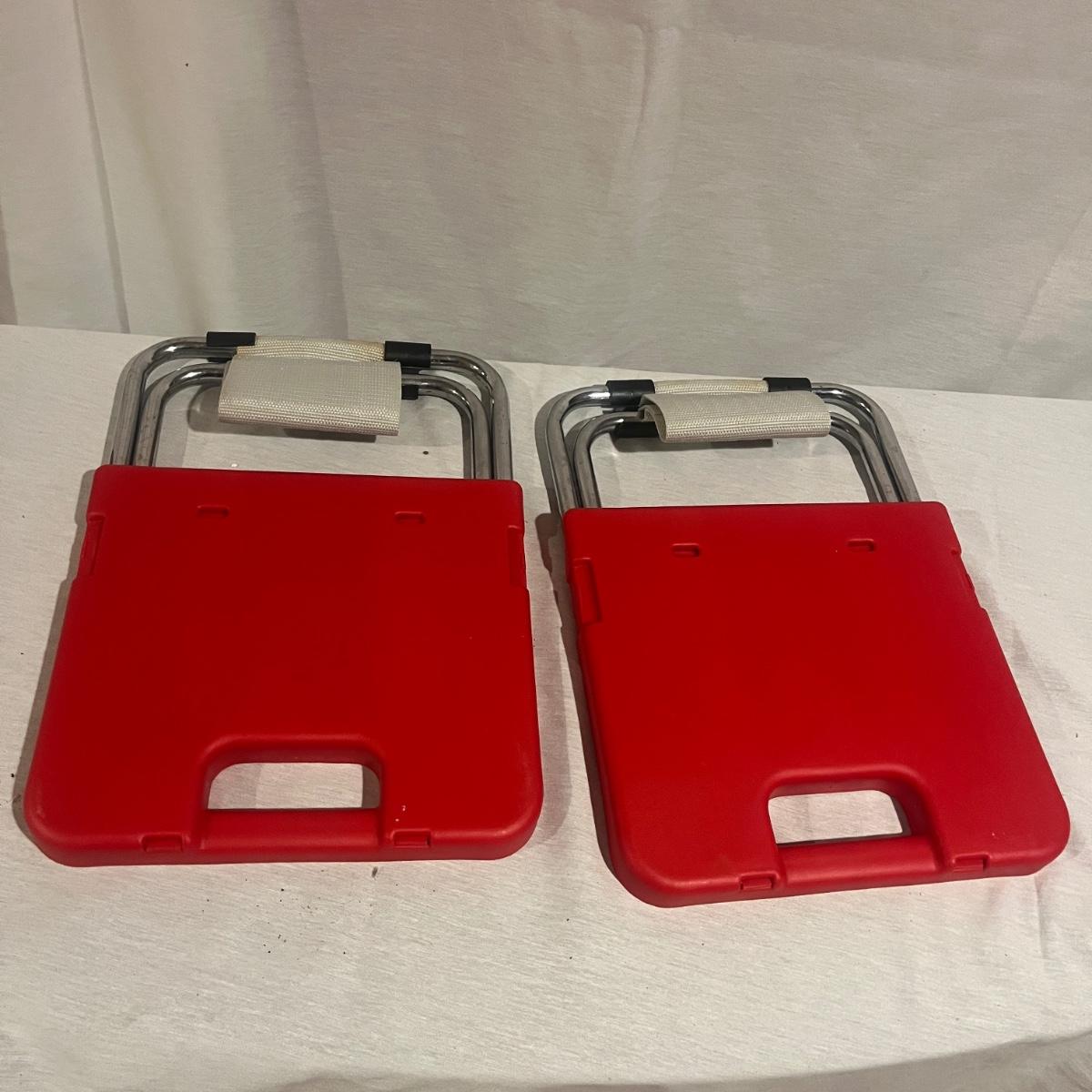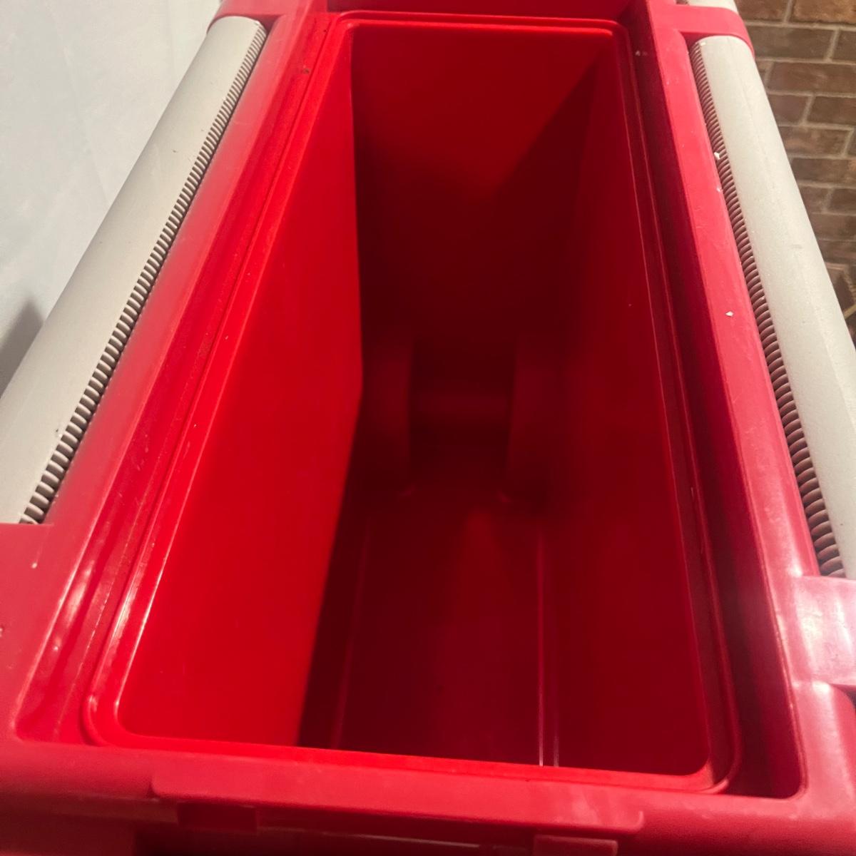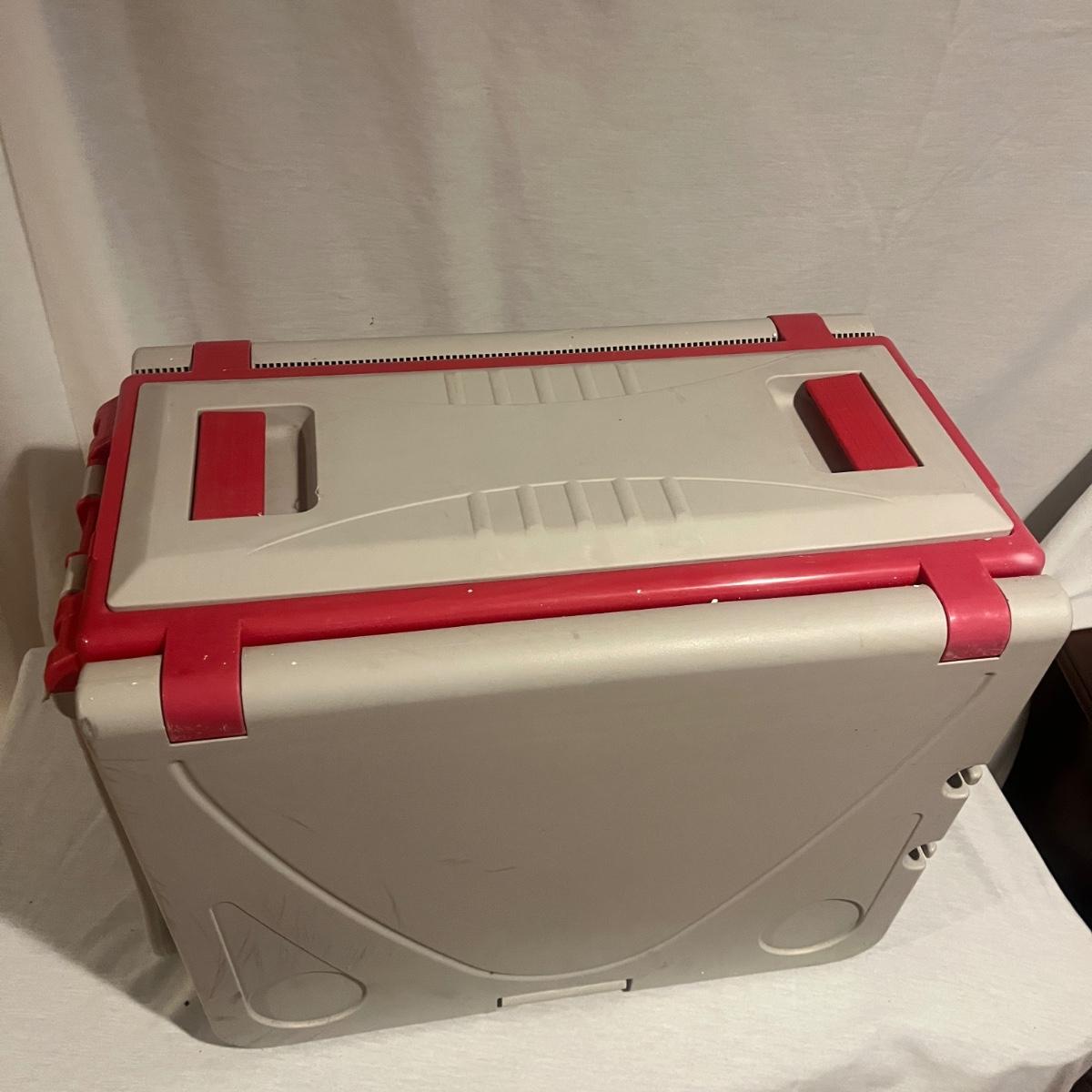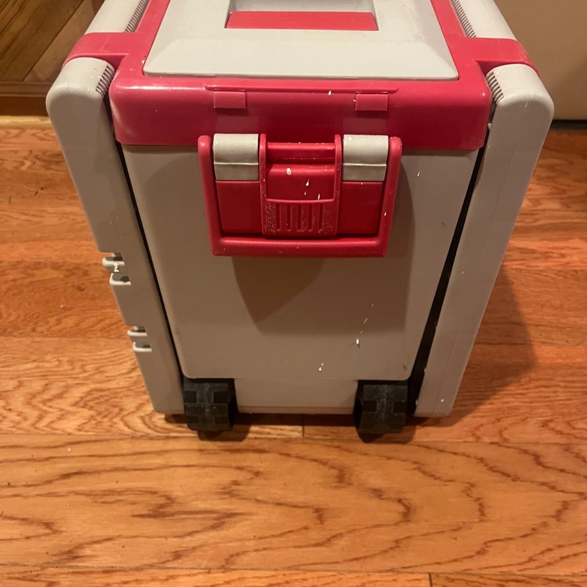 Lot includes a plastic Rolling Coca Cola cooler with two built in drop leafs that hold two small chairs. Also includes four bottles with two marked Coca Cola, Bellingrath Beverages bottle and a round bottom unmarked bottle. Cooler measures 36” x 20” x 14”H when open and 12” x 20” x 14”H when drop leafs are closed.