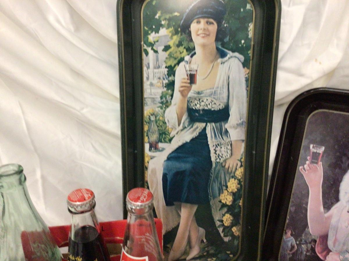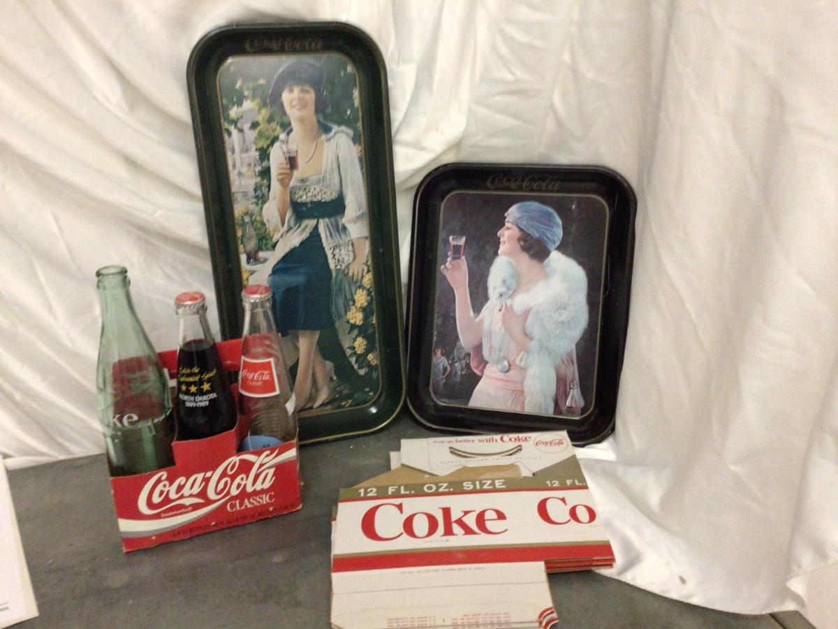 You get to collectible trays, three Diet Coke cardboard bottle carriers, one coke cardboard bottle holder and three bottles.