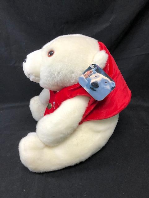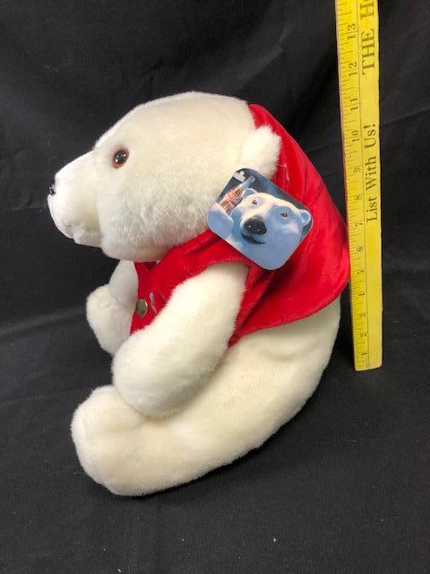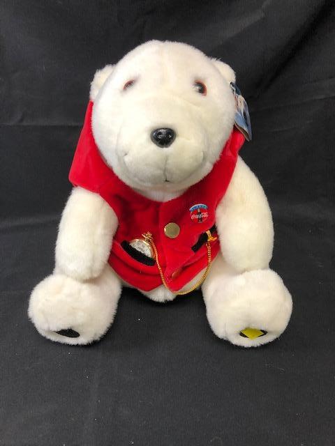 Coca Cola Polar Bear plush. 1995 HSN exclusive is wearing a red vest and has a pocket watch. Original hang tag still on his ear.