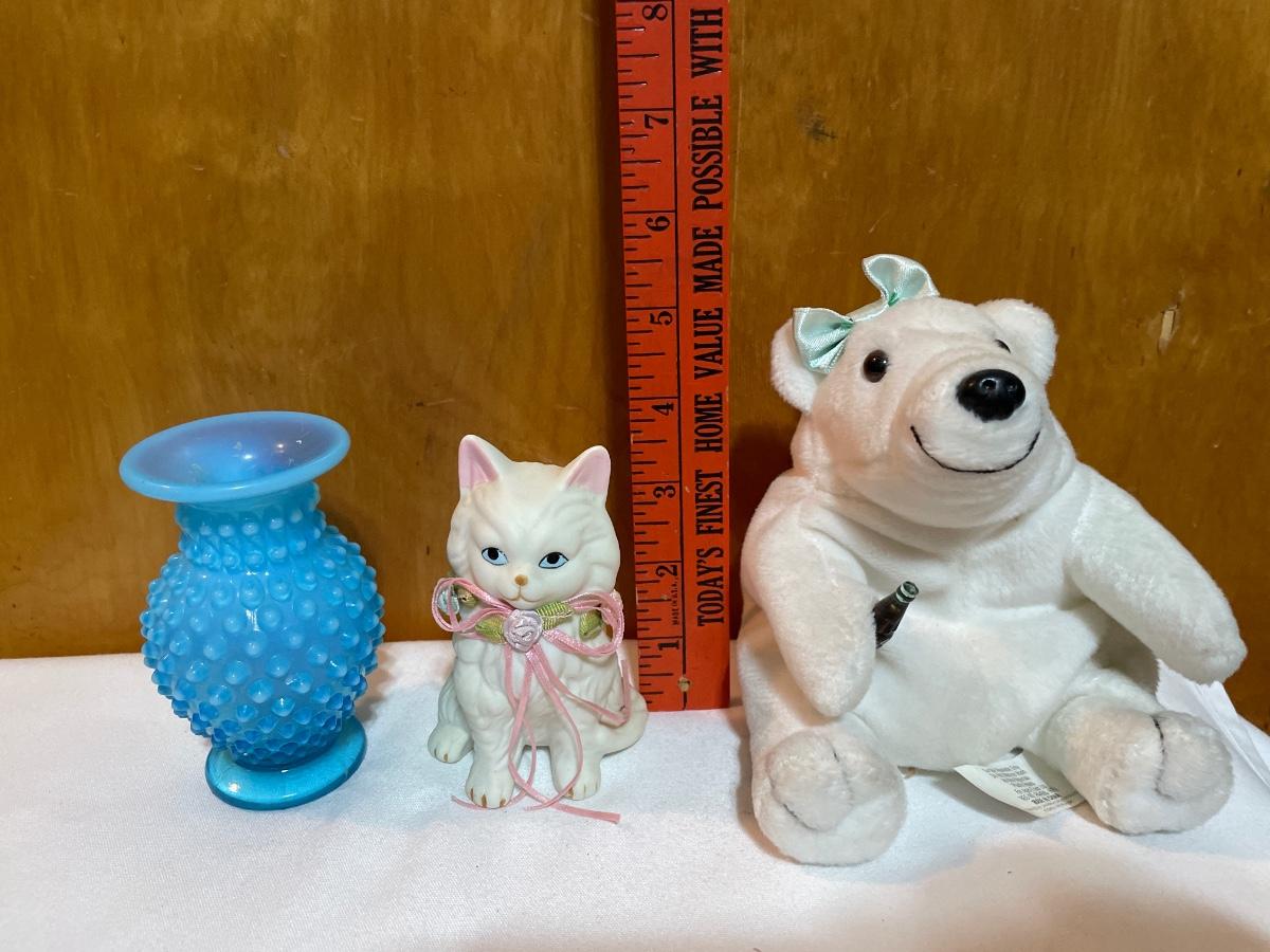 Vintage Coca-Cola, bear with ceramic kitty and blue hobnail vase
