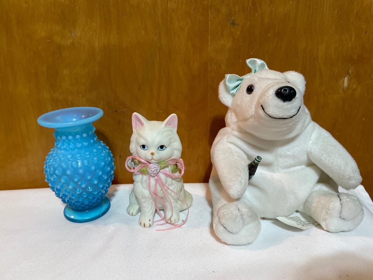 Coca-Cola bear with blue eyed kitty and blue nail vase
