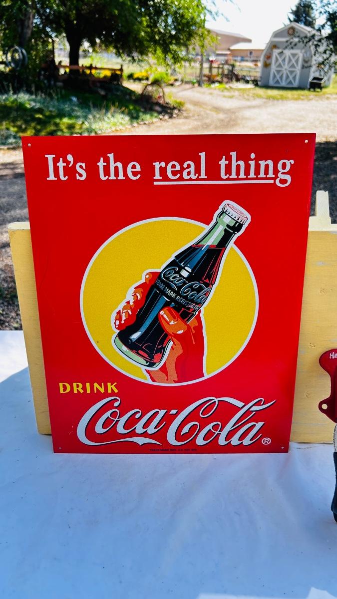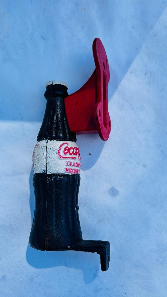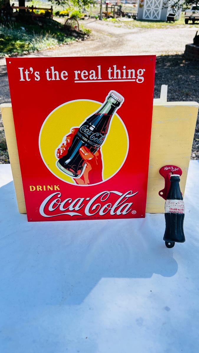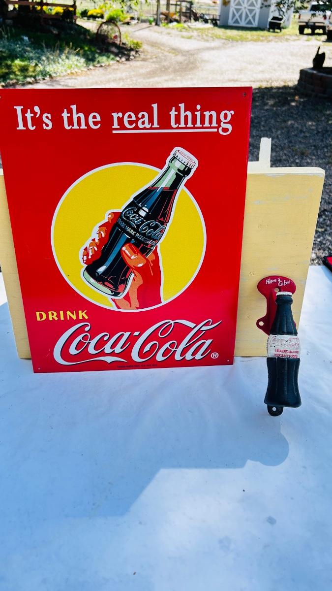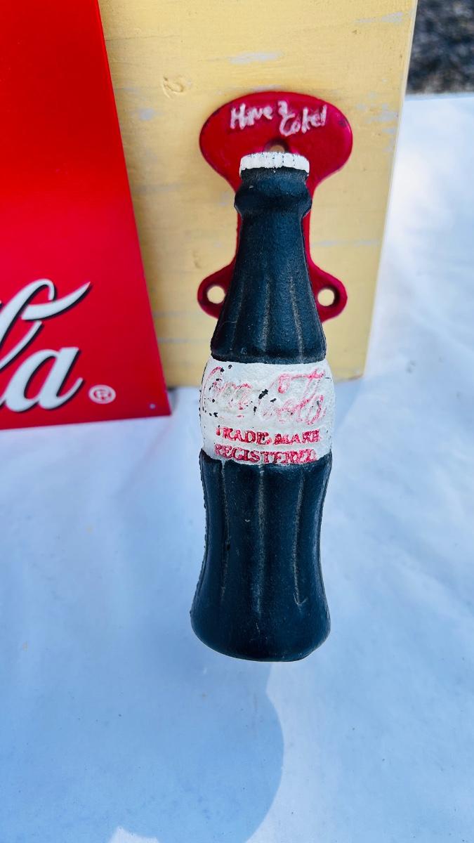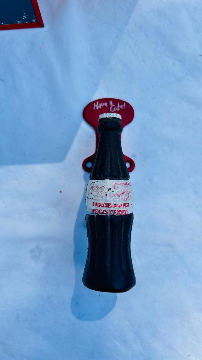 COCA-COLA CAST IRON BOTTLE SHAPED HANDLE AND TIN SIGN