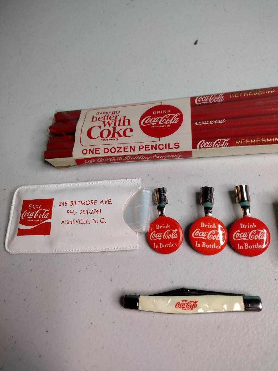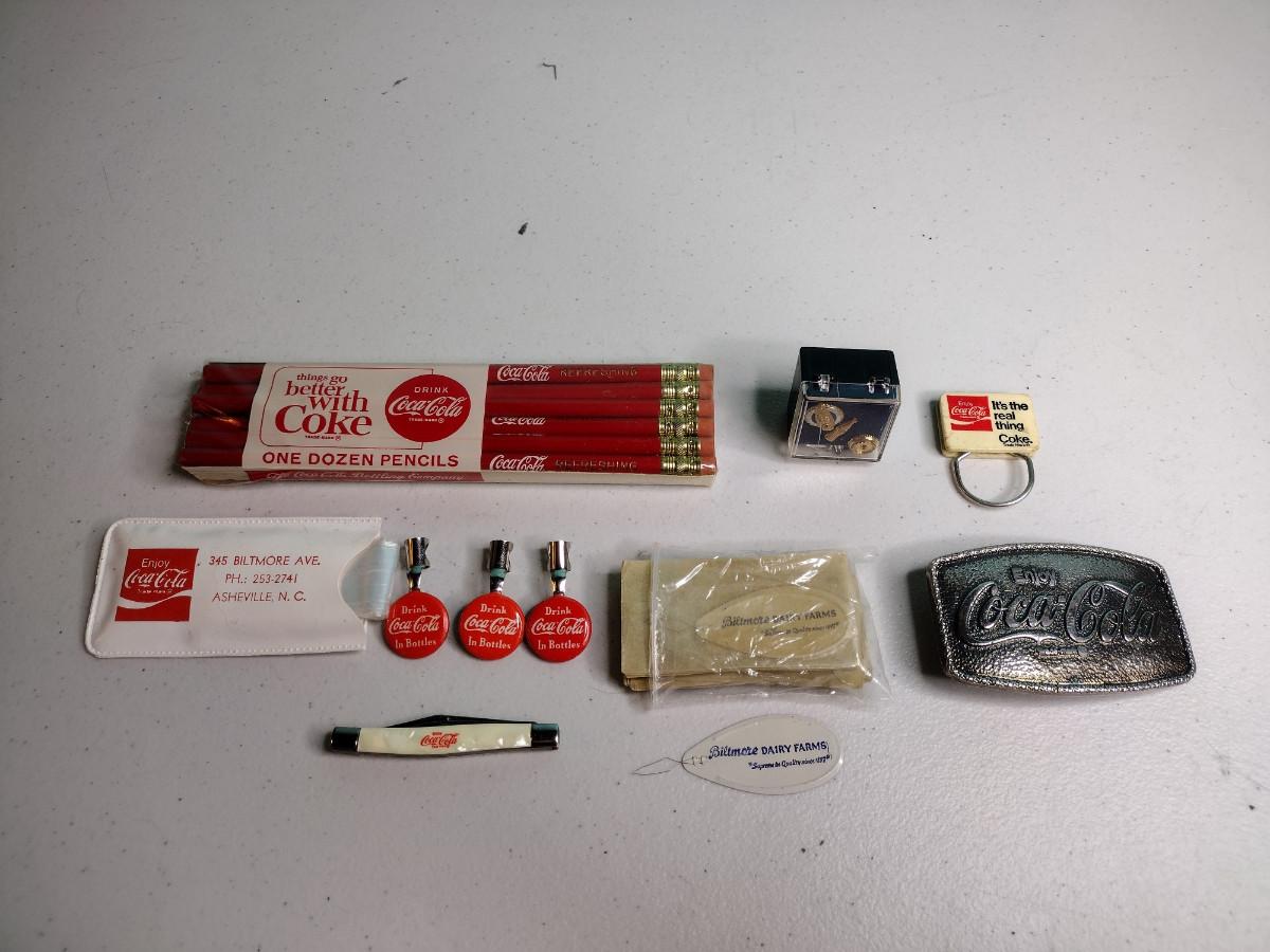Pencils, pencil toppers, and other items. The white plastic sleeve on the left contains a promotional plastic hair protector for going out in the rain. Also included is a package of Biltmore Dairy Farms needle threader. See pictures for details.