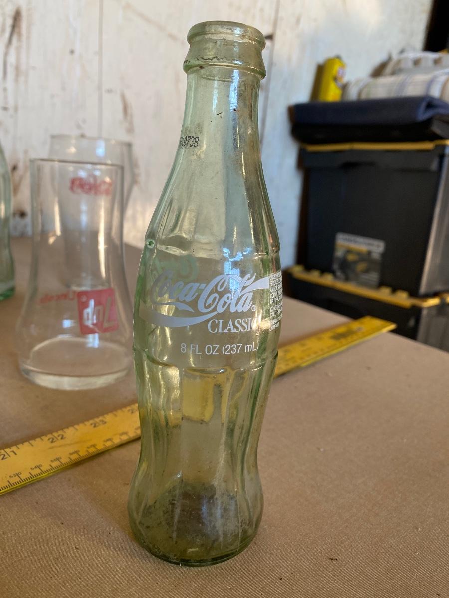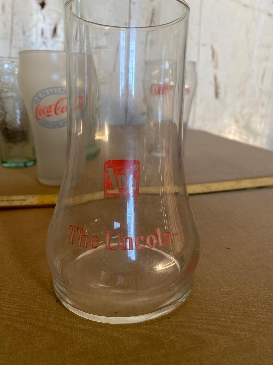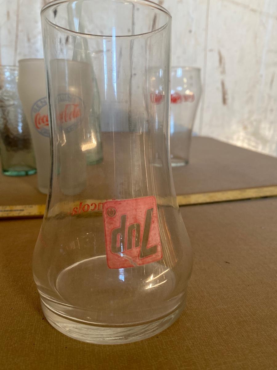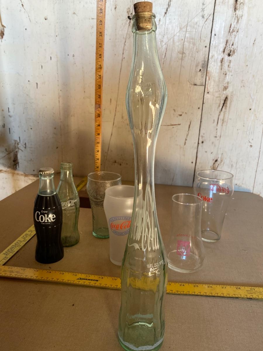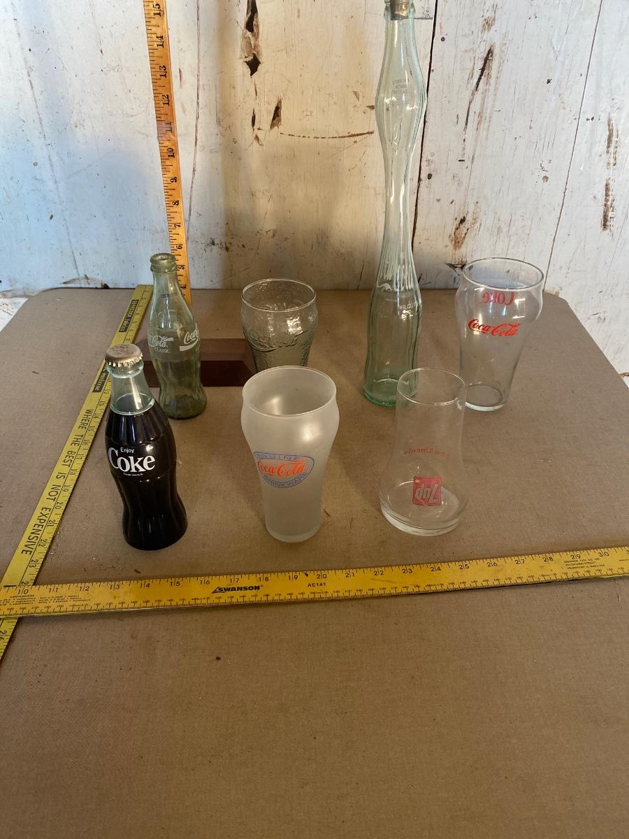A collection of three Coca-Cola cups one 7-Up cup a Coca-Cola stretch bottle Coca-Cola normal bottle and a Coca-Cola radio