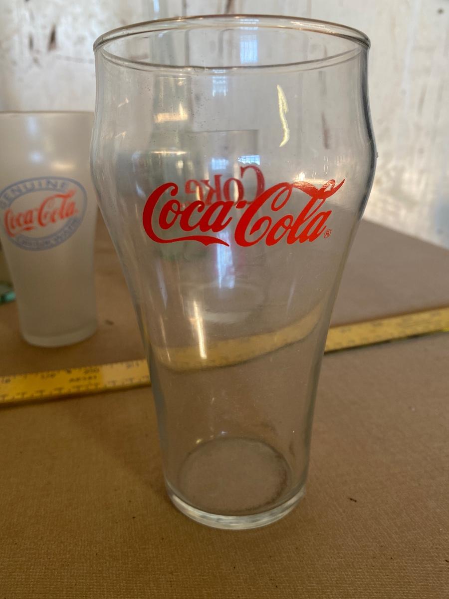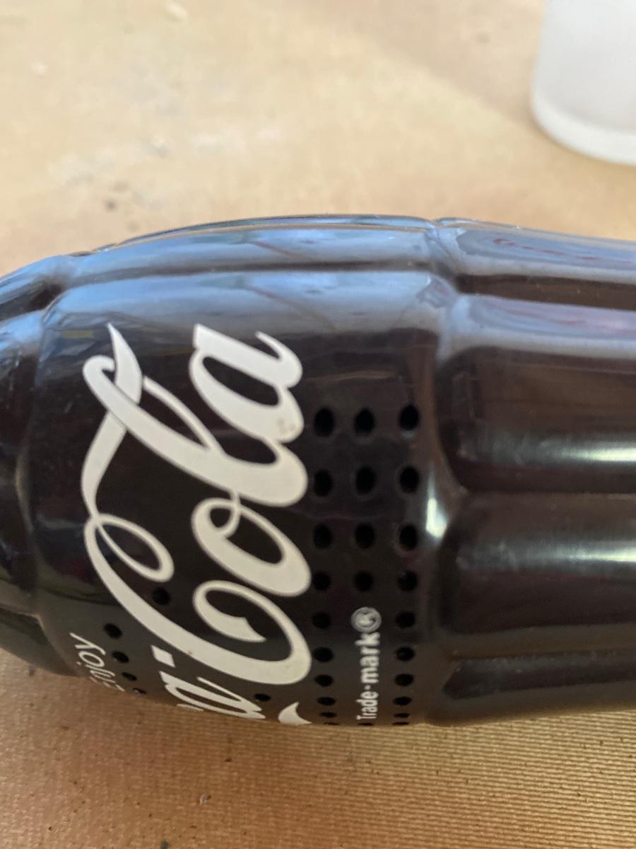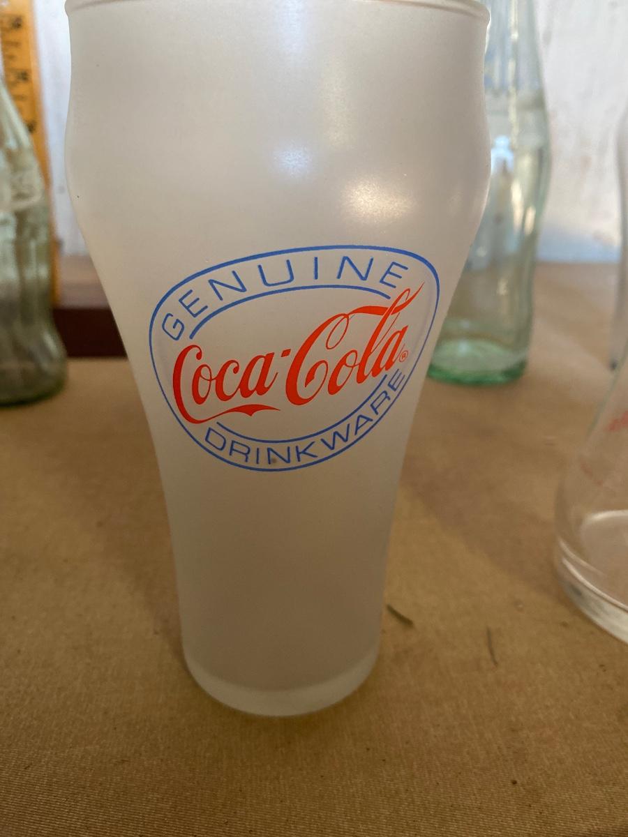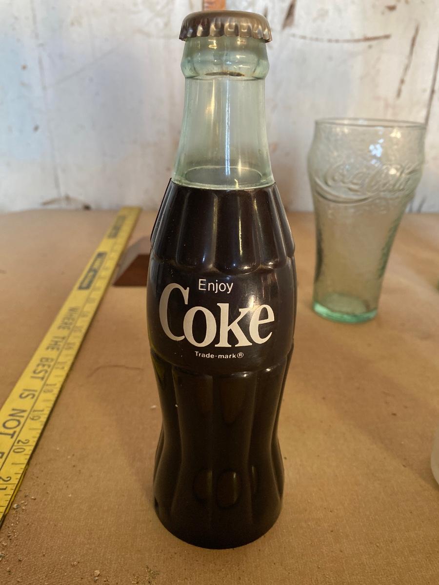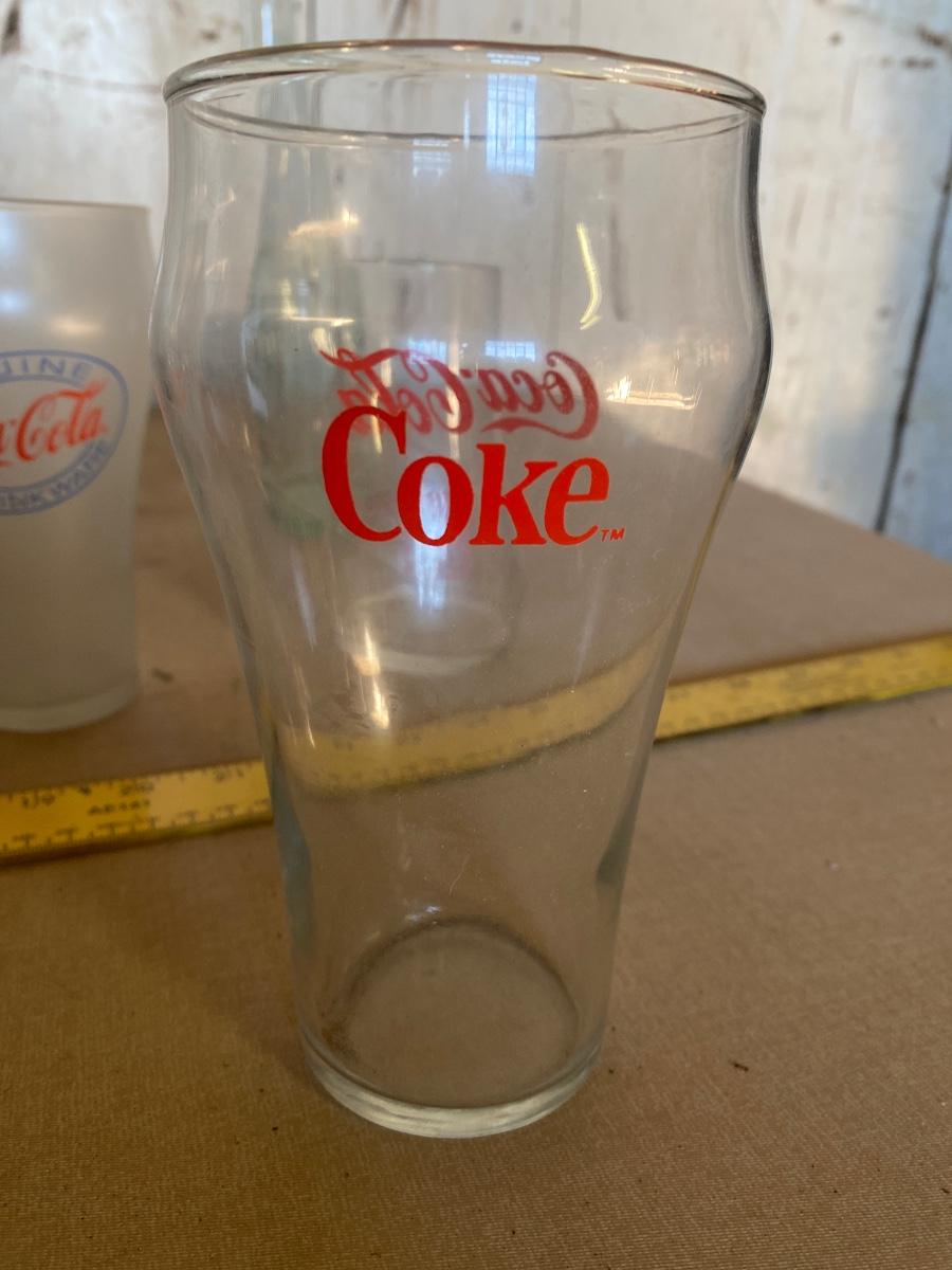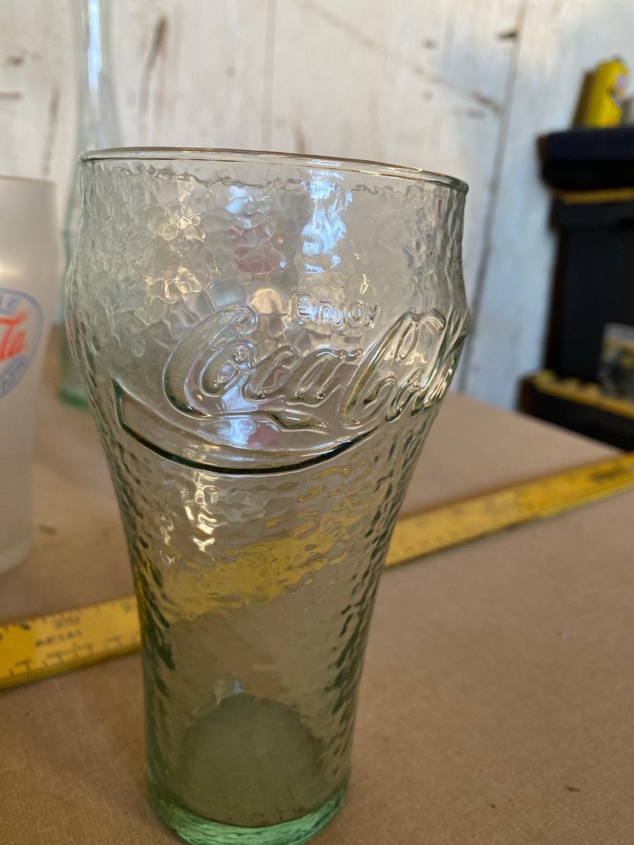 A collection of three Coca-Cola cups one 7-Up cup a Coca-Cola stretch bottle Coca-Cola normal bottle and a Coca-Cola radio