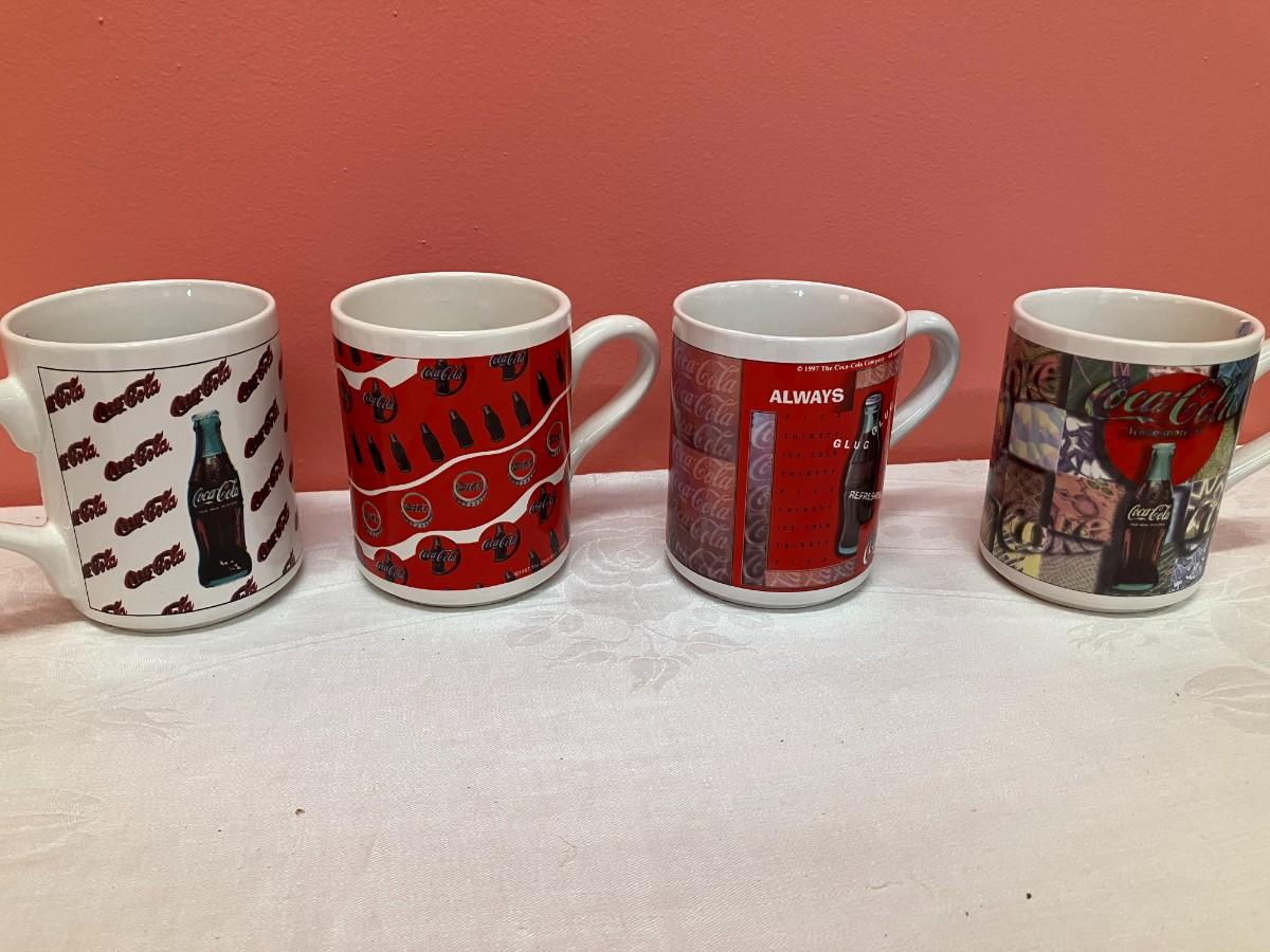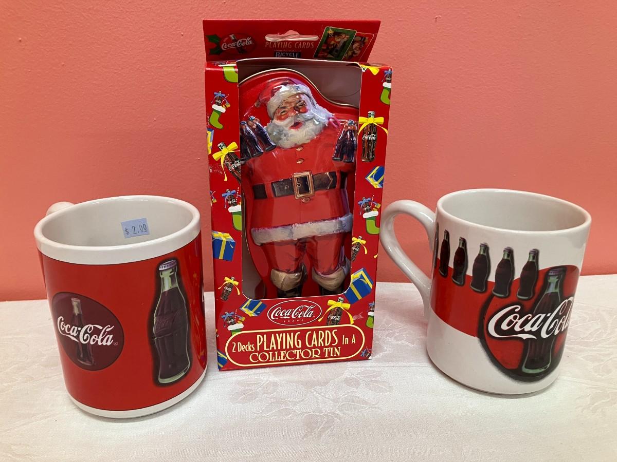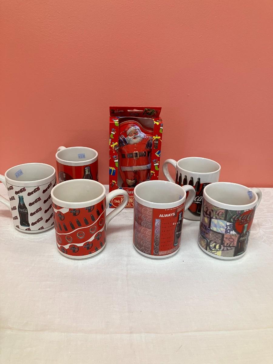Set of 6 varied Coca-Cola mugs and a Coca-Cola santa tin with playing cards in original box