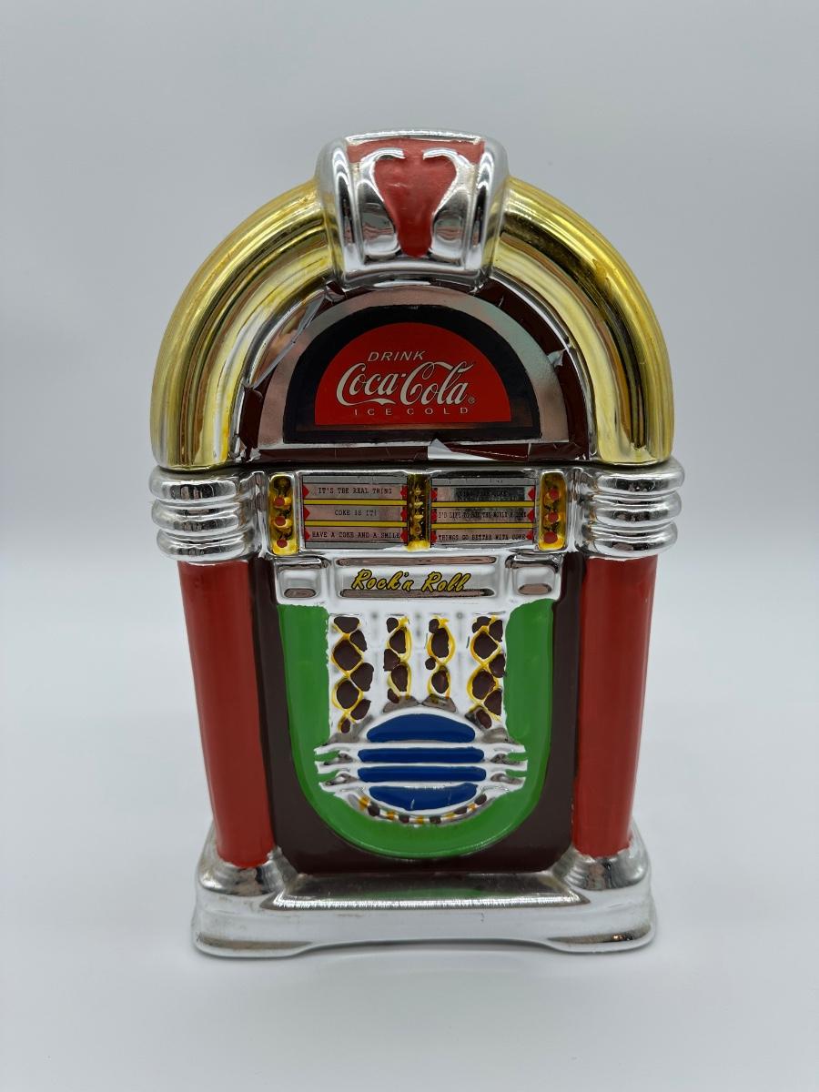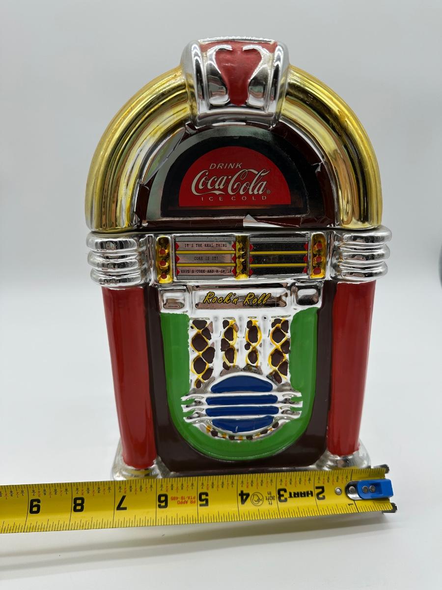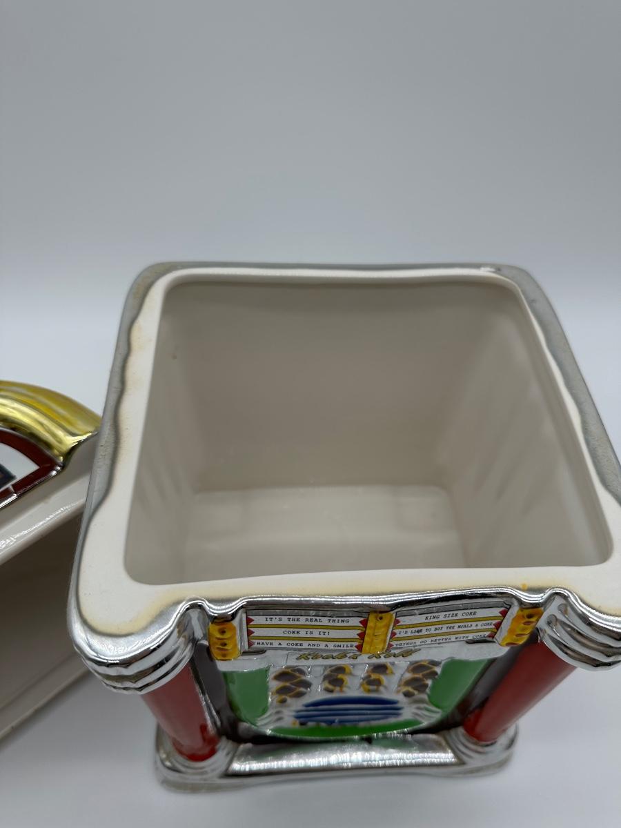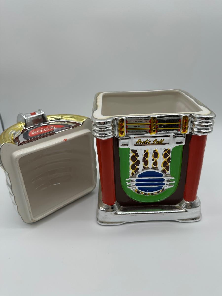Licensed Coca-Cola ceramic jukebox-style cookie jar with removable lid. Bright colors and chrome-look detailing.