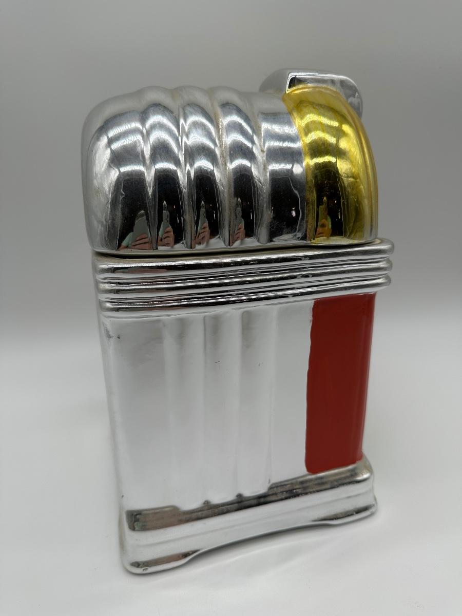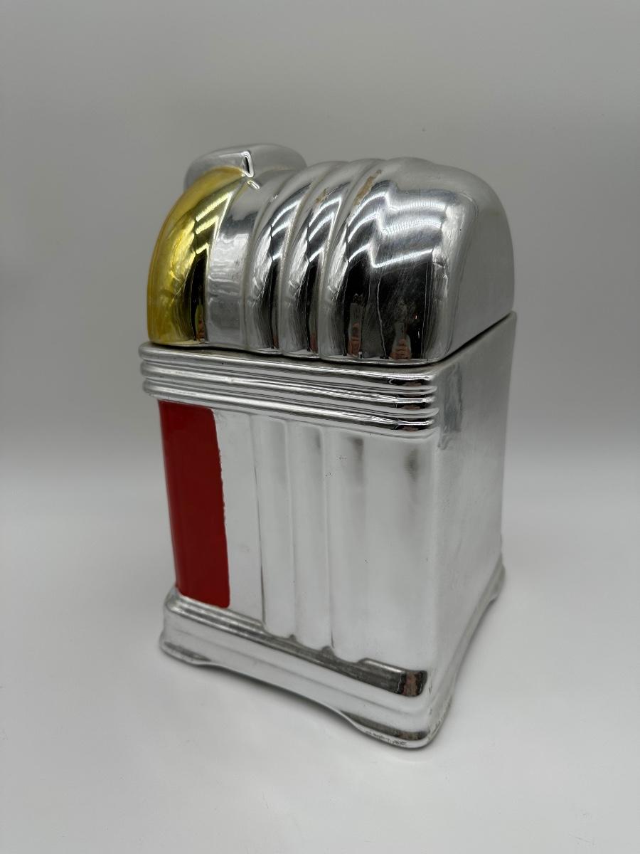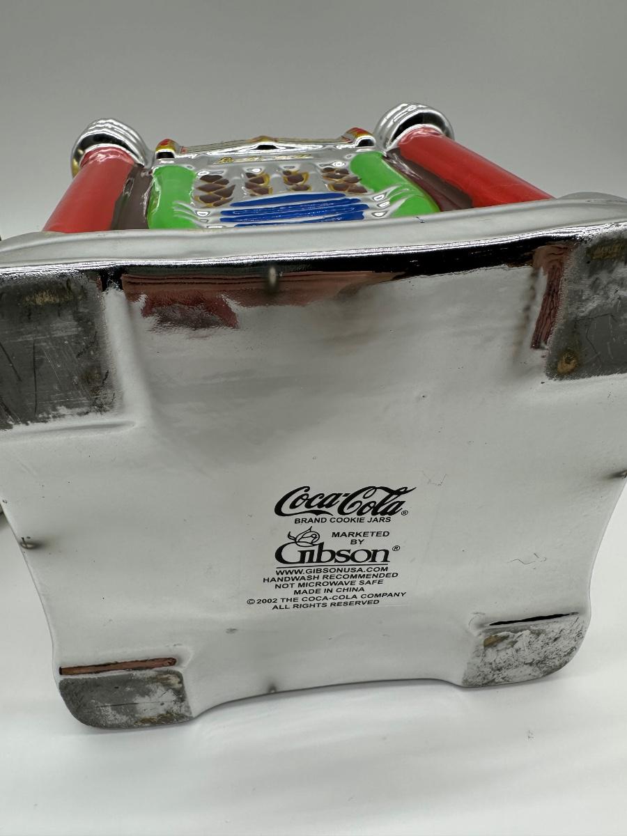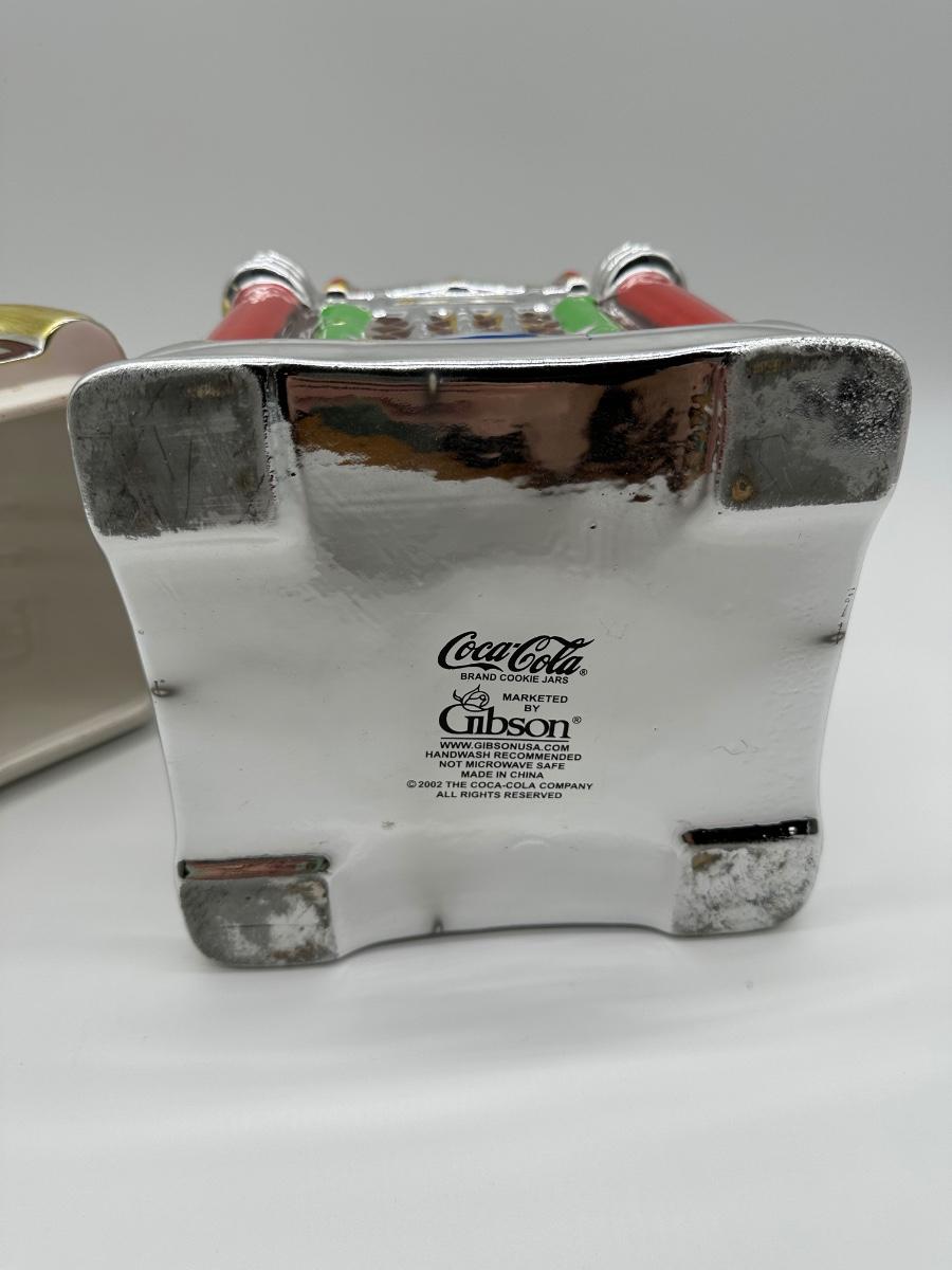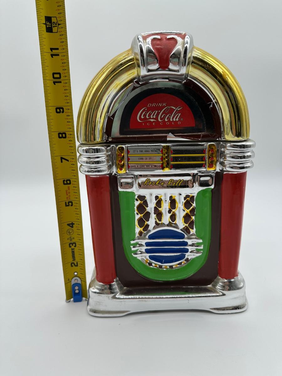 Licensed Coca-Cola ceramic jukebox-style cookie jar with removable lid. Bright colors and chrome-look detailing.