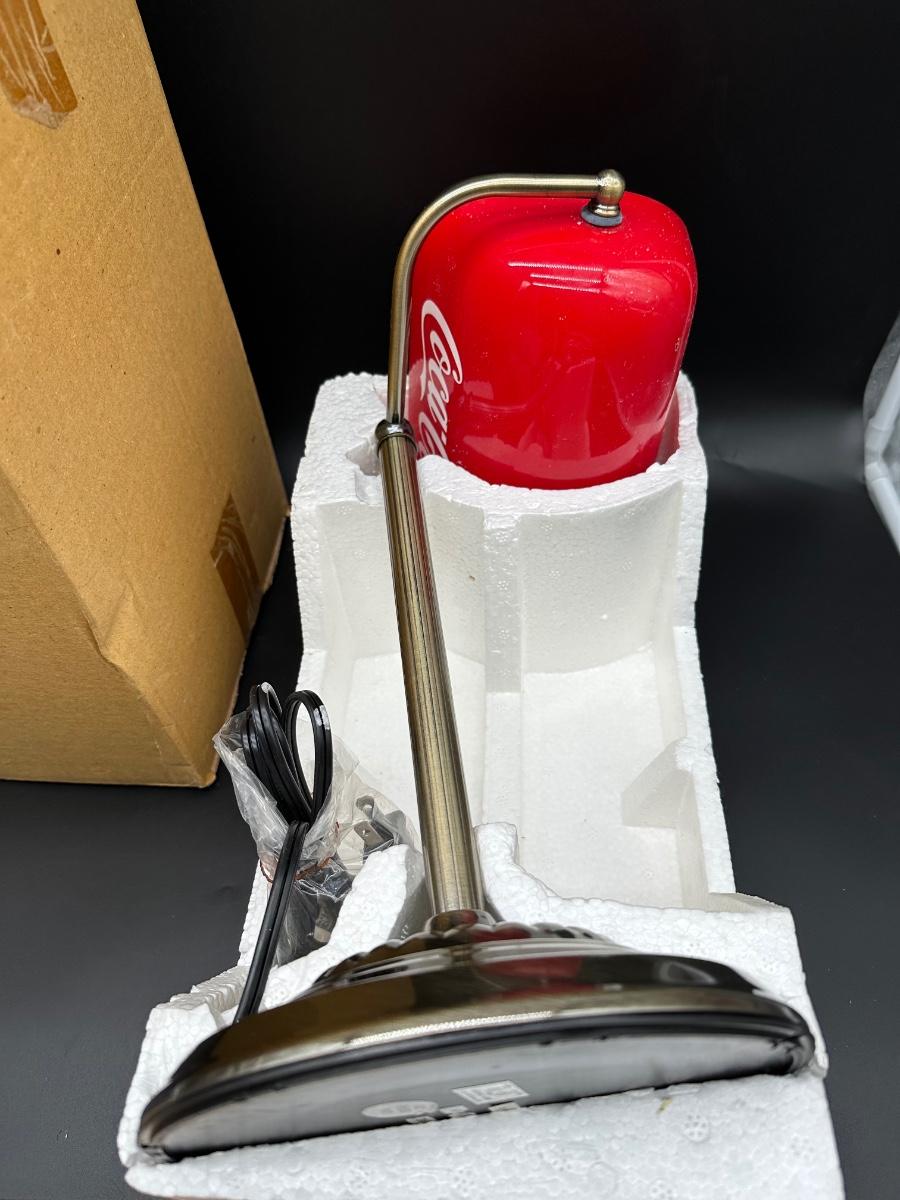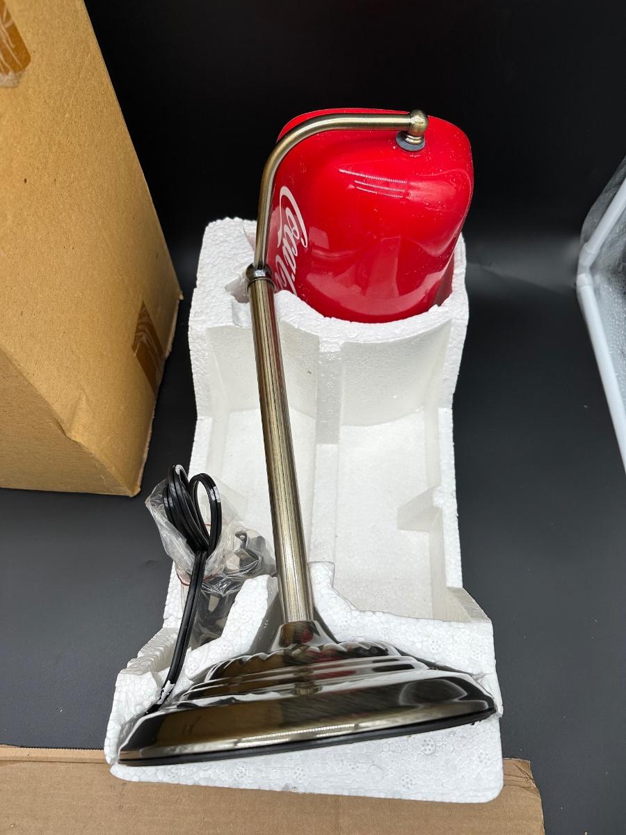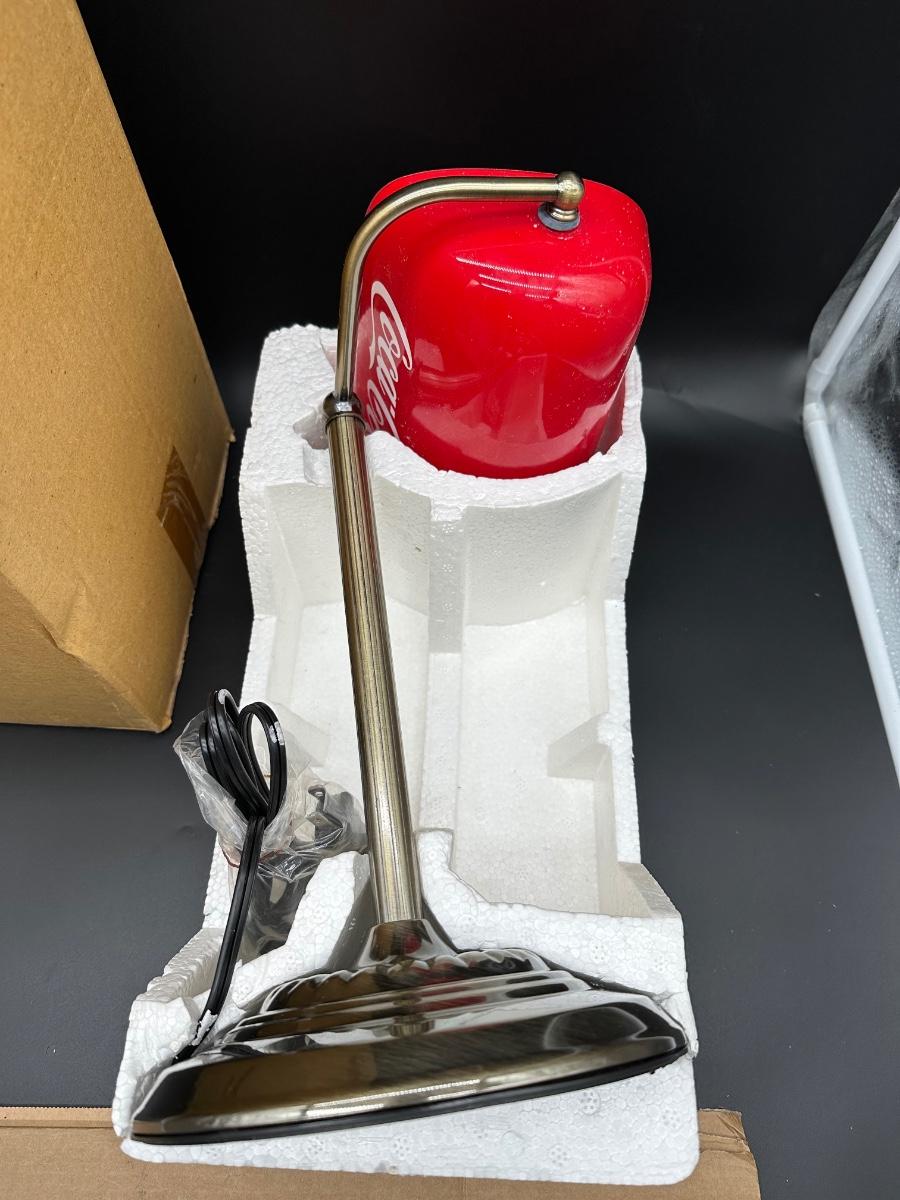 This is a modern licensed reproduction, made in China (not vintage). The lamp appears unused, but the shade mounting/arm joint needs attention — see photos. Likely a simple repair or tightening for someone handy. Great piece for a desk, office, bar, or Coca-Cola themed display once repaired.