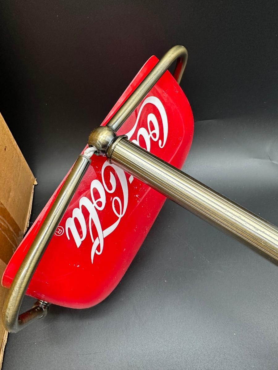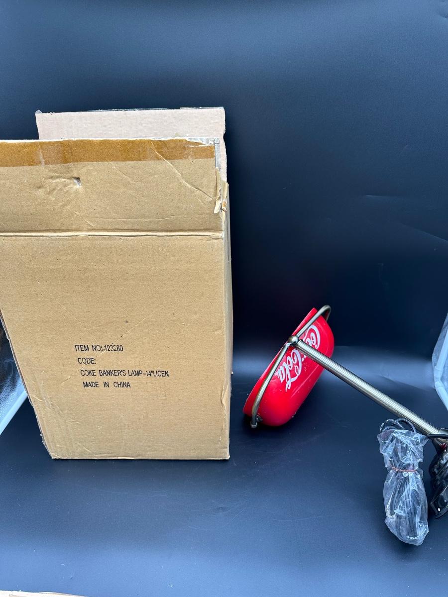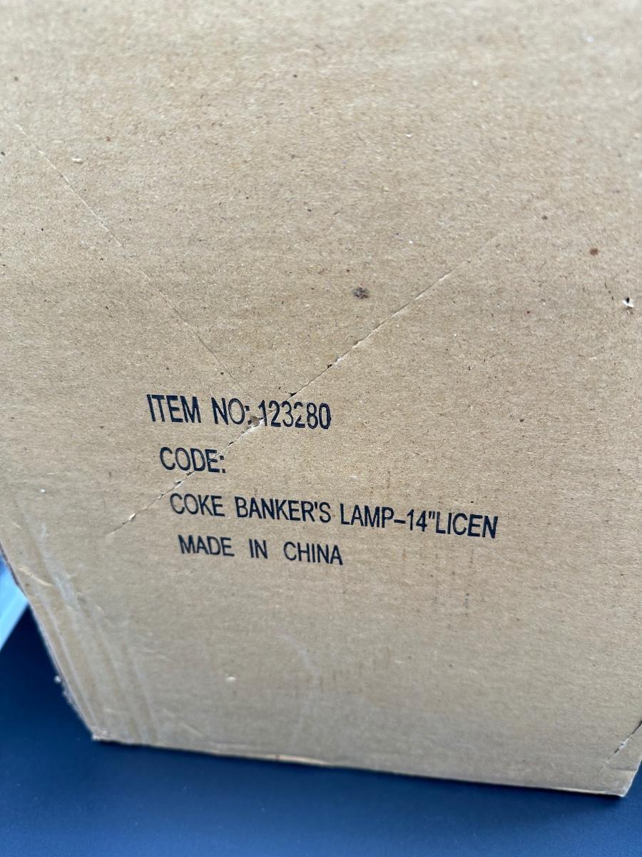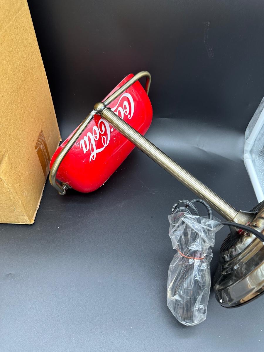 This is a modern licensed reproduction, made in China (not vintage). The lamp appears unused, but the shade mounting/arm joint needs attention — see photos. Likely a simple repair or tightening for someone handy. Great piece for a desk, office, bar, or Coca-Cola themed display once repaired.