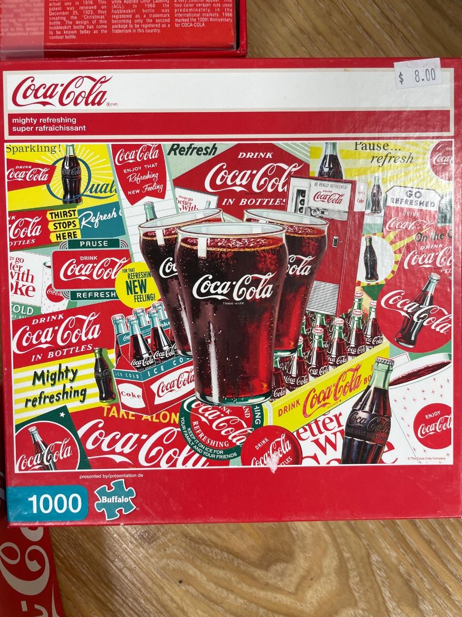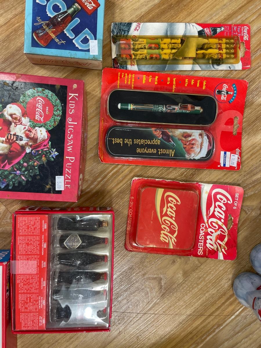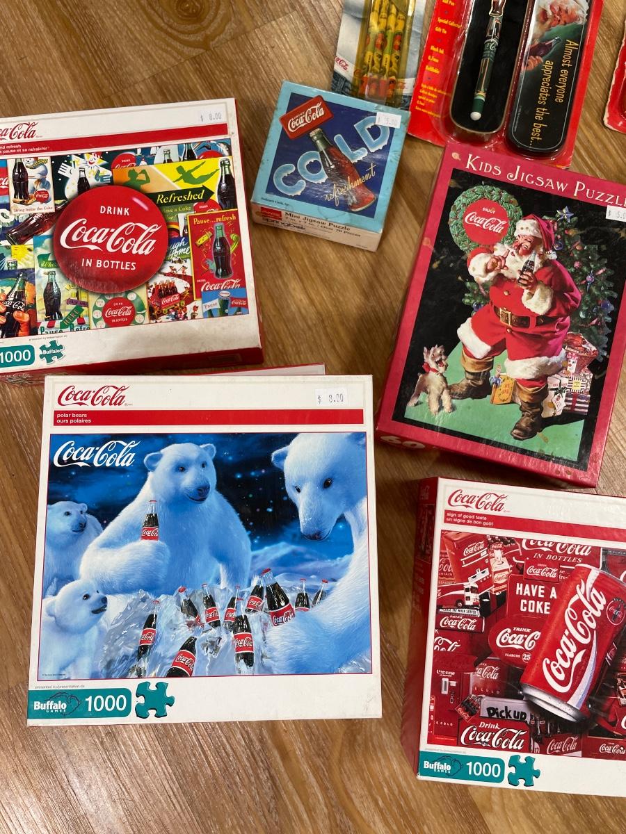 Includes pen, pencils, coaster, bottles, and puzzles that have been opened