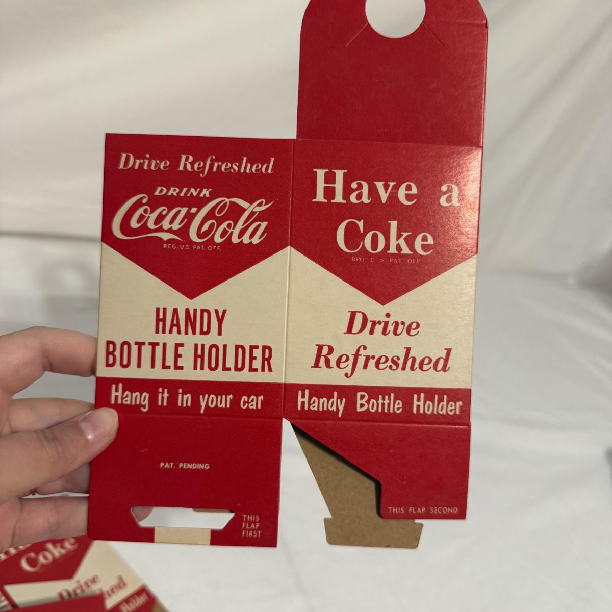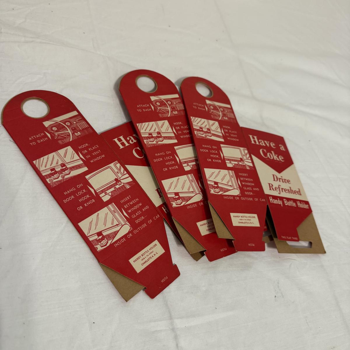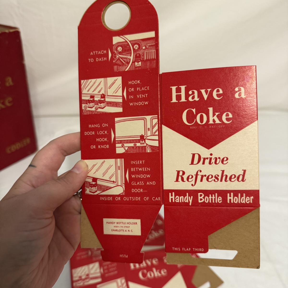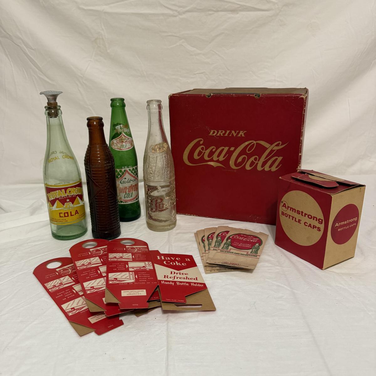 This lot contains a variety of vintage soda collectables including a Coca-Cola cardboard picnic cooler, Coca-Cola ‘Handy Bottle Holders’, several Coca-Cola “Dry-Server” bottle covers, a box of Armstrong Bottle Caps and four vintage soda bottles. Starting with the picnic cooler, this neat item is made from cardboard and measures 10” x 6” x 10”H. It has two metal handles and cardboard flaps that keep all your goods together. There is a normal amount of wear to the edges. Next are three cardboard “Handy Bottle Holders” that essentially fold out and hook to things so you can have your coke on the go! These all measure 5.5” x 8.5”H. Also included are seven Coca-Cola “Dry Servers” or paper koozi, they appear to be unused. Moving on there is a box of unused Armstrong Bottle caps. Last we have four empty vintage soda bottles, of them we have a Pepsi, Royal Crown Cola, Golden Sun-drop cola, and an Orange Crush Bottle. Shipping available.