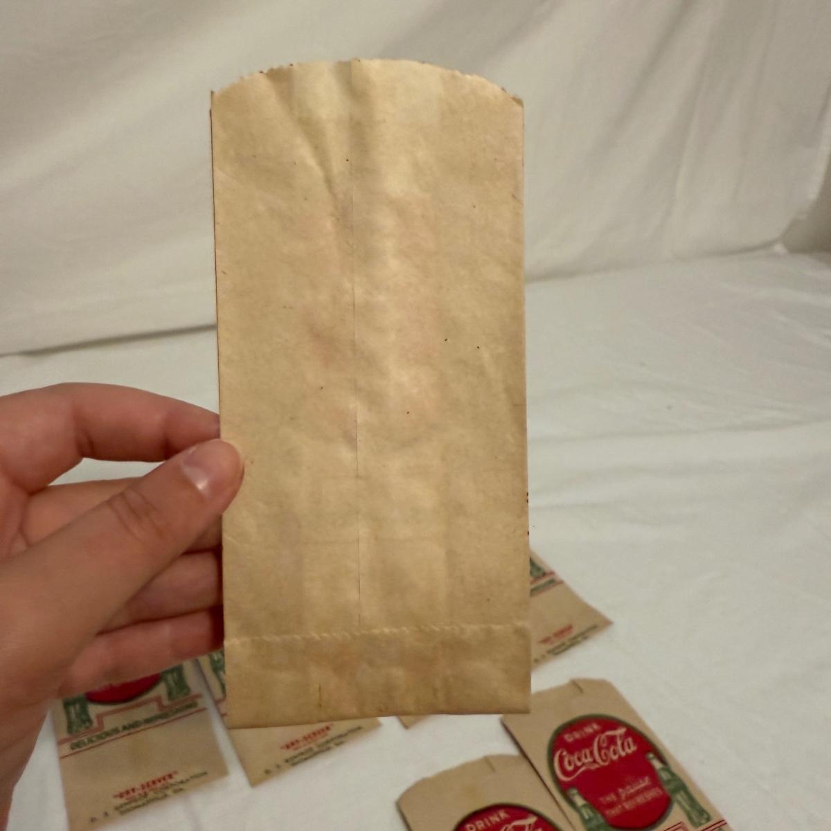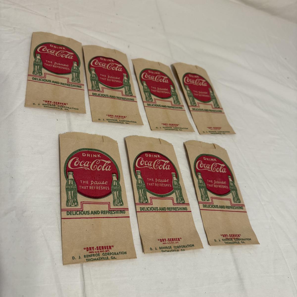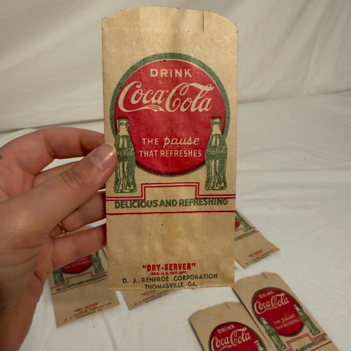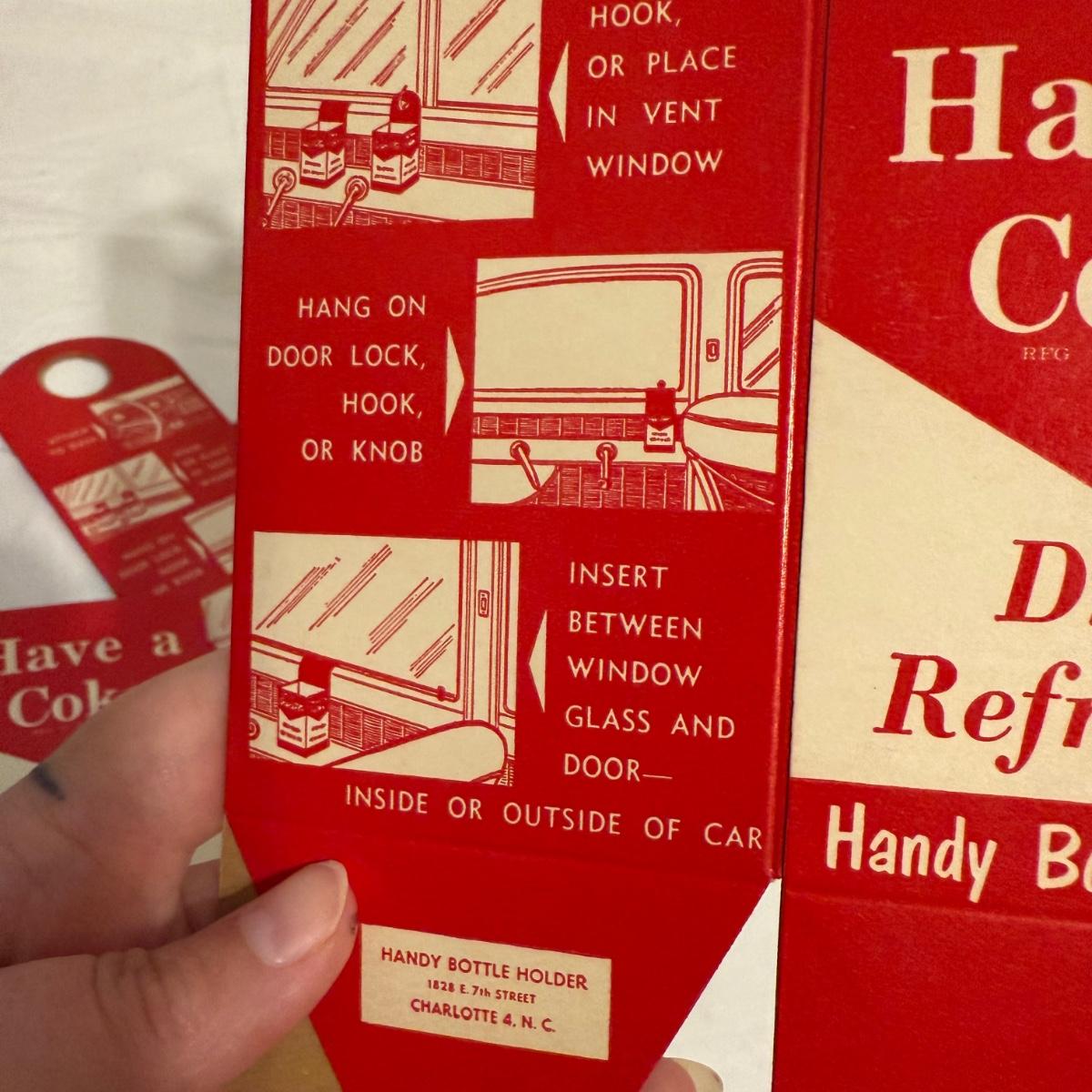 This lot contains a variety of vintage soda collectables including a Coca-Cola cardboard picnic cooler, Coca-Cola ‘Handy Bottle Holders’, several Coca-Cola “Dry-Server” bottle covers, a box of Armstrong Bottle Caps and four vintage soda bottles. Starting with the picnic cooler, this neat item is made from cardboard and measures 10” x 6” x 10”H. It has two metal handles and cardboard flaps that keep all your goods together. There is a normal amount of wear to the edges. Next are three cardboard “Handy Bottle Holders” that essentially fold out and hook to things so you can have your coke on the go! These all measure 5.5” x 8.5”H. Also included are seven Coca-Cola “Dry Servers” or paper koozi, they appear to be unused. Moving on there is a box of unused Armstrong Bottle caps. Last we have four empty vintage soda bottles, of them we have a Pepsi, Royal Crown Cola, Golden Sun-drop cola, and an Orange Crush Bottle. Shipping available.