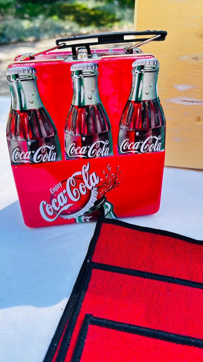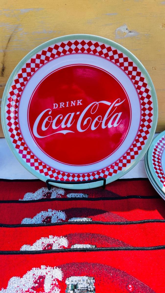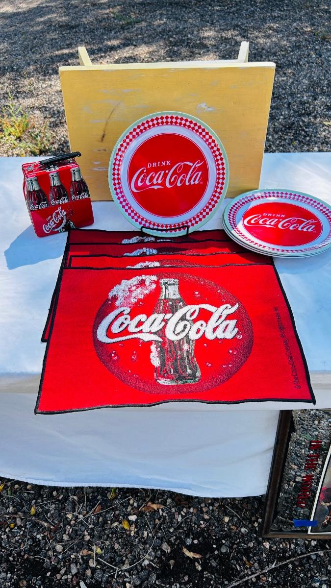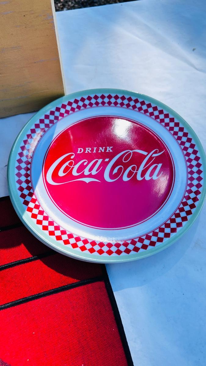 COCA-COLA PLACEMATS, PLASTIC PLATES, AND BOTTLE SHAPED TIN
