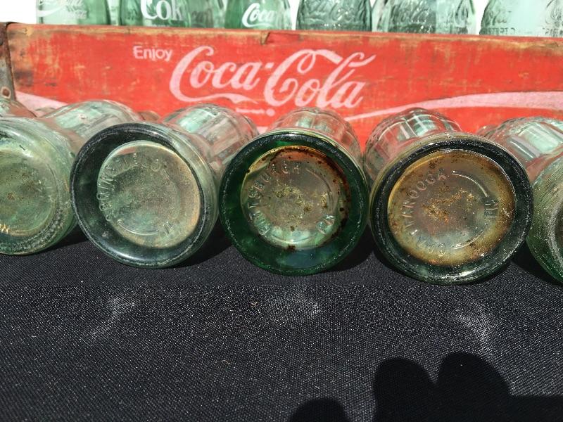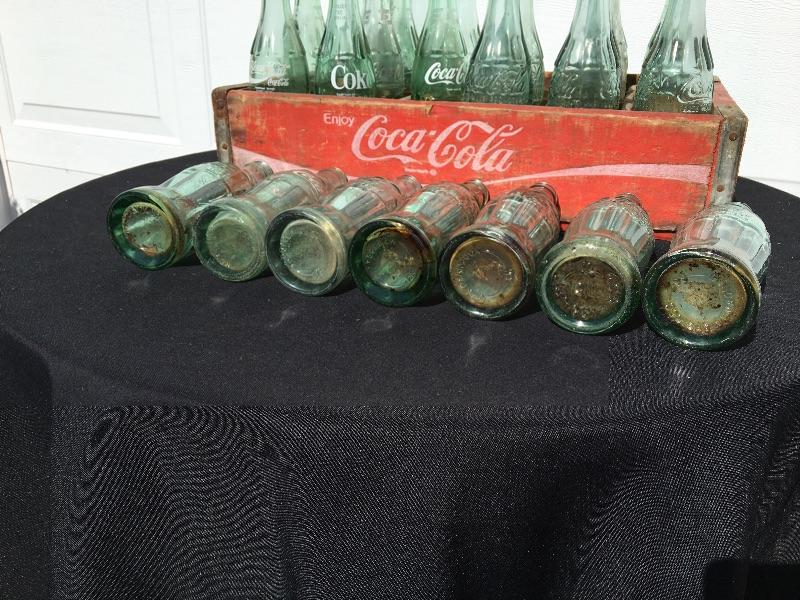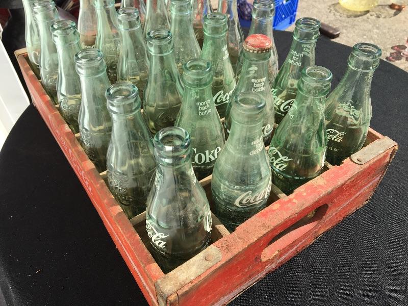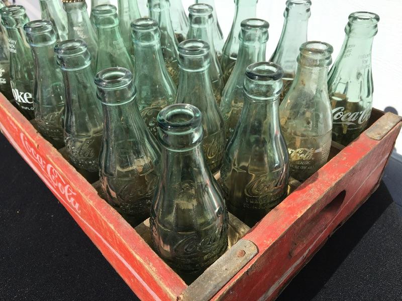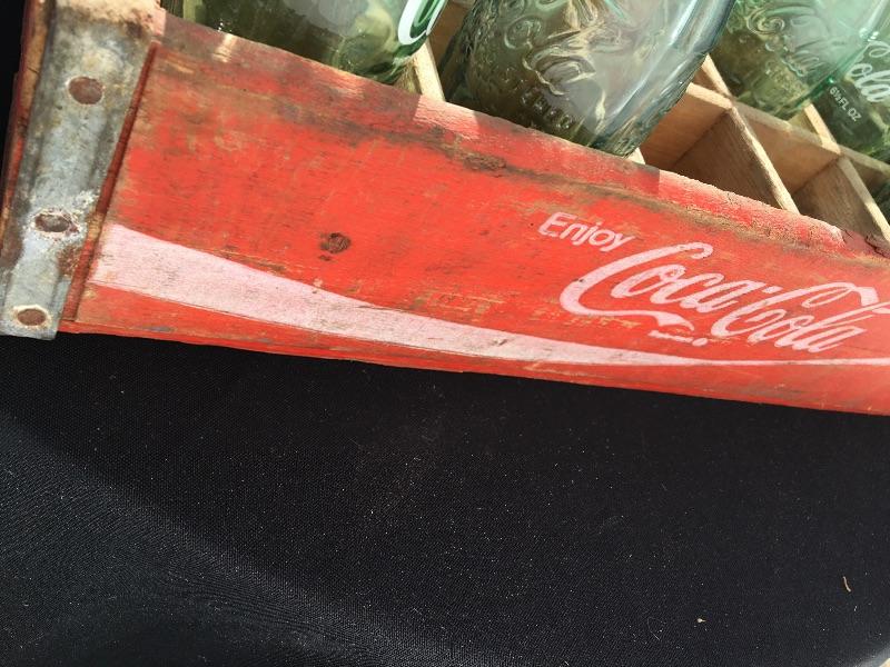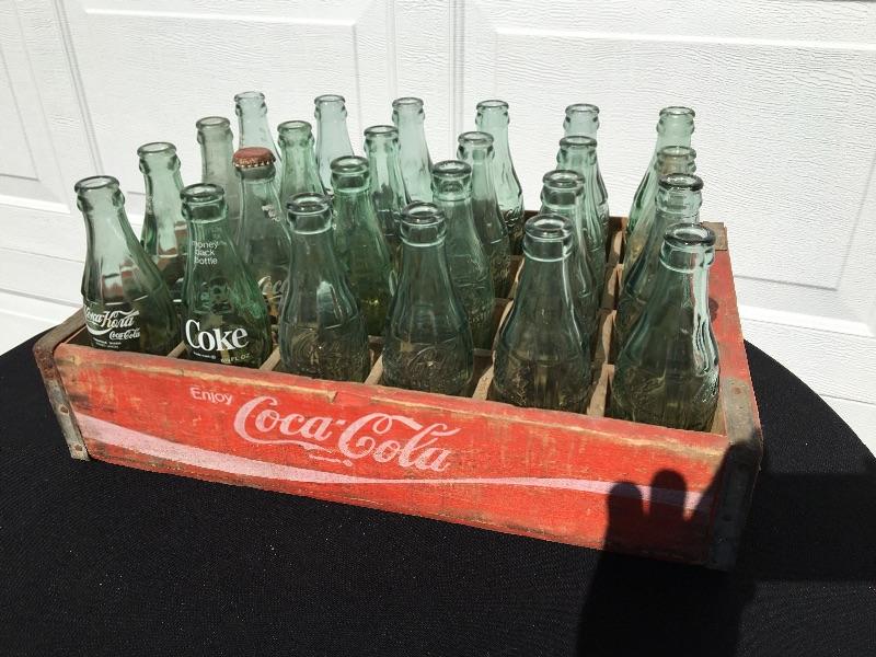 Coca-Cola wooden carrying case with 24 mixed Vintage and Rare glass bottles 18.5 x 12”