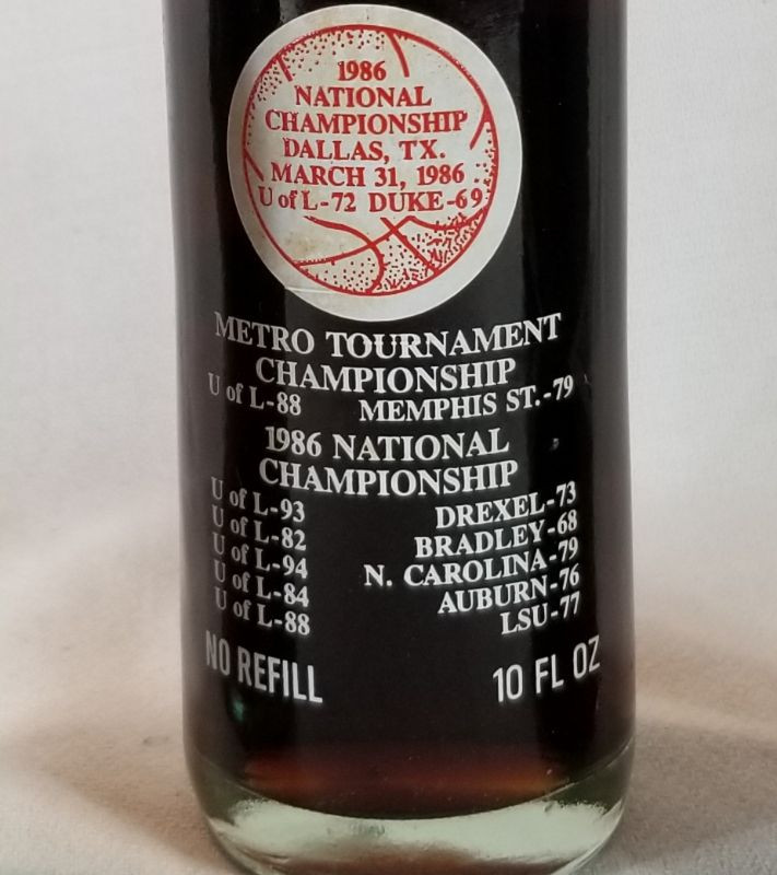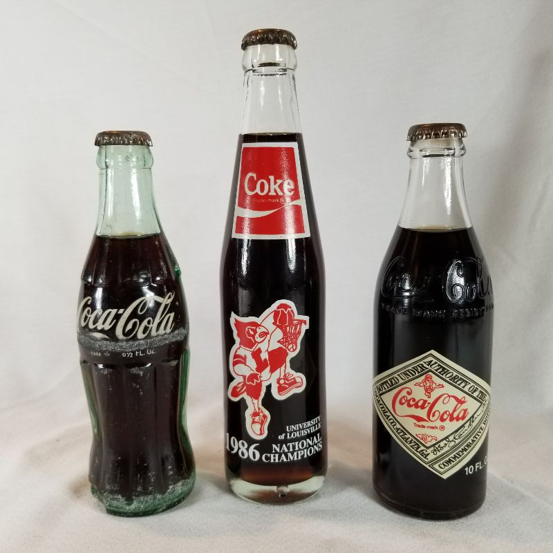 Three vintage Coca-Cola unopened collector bottles. The old Coke bottle is in rough shape, very scratched and has a big chip on bottom. Also on bottom is embossed Somerset, Ky - Bottle Trade Mark. The U of L 10-fluid ounce bottle is in very good condition and commemorates the 1986 National Championship in Dallas, TX - U of L-72 over Duke-69. The last bottle is also in very good condition and commemorates the 75th Anniversary of the Coca-Cola Bottling Company of Louisville. A nice offering for the true collector in you.
