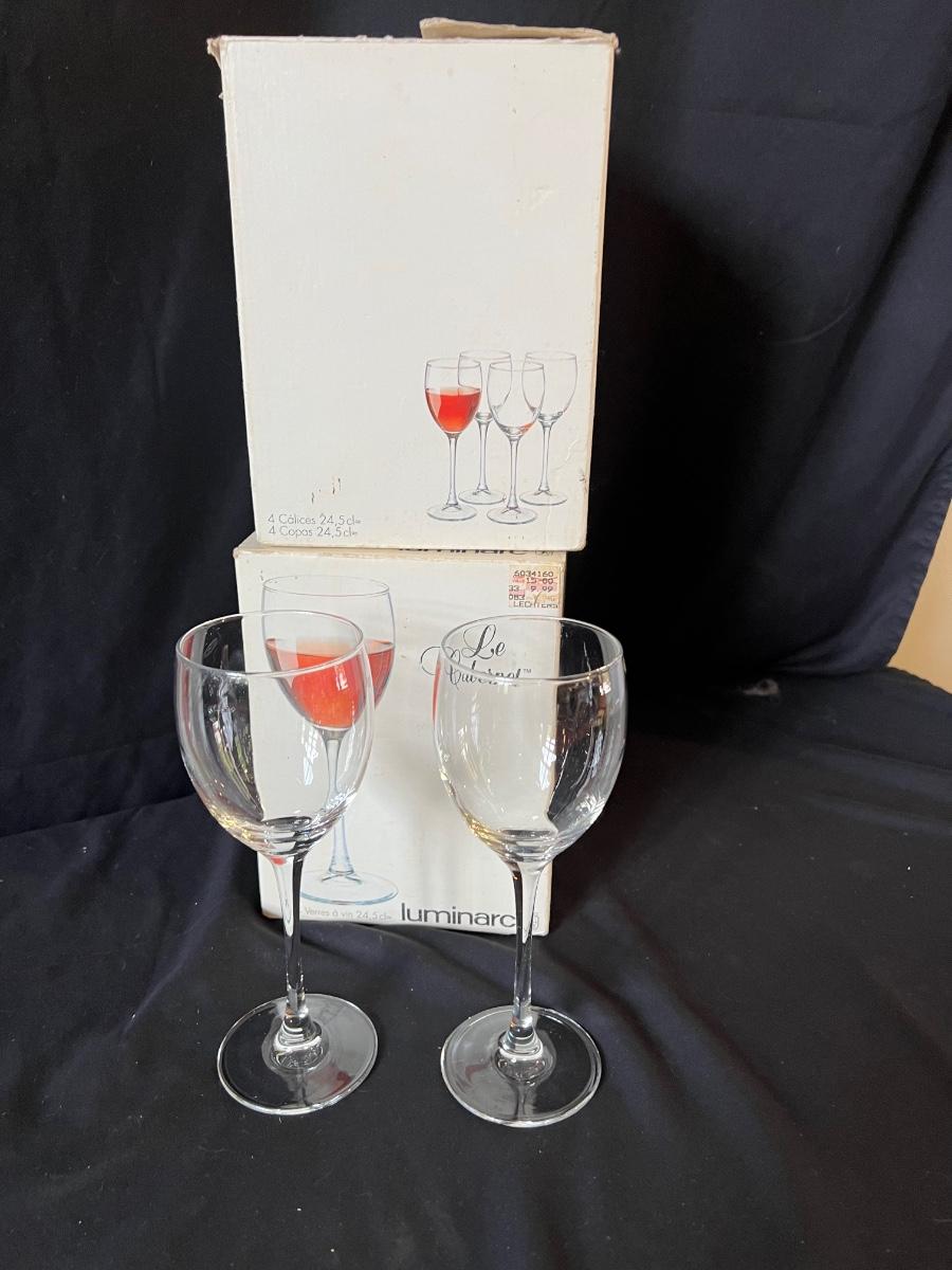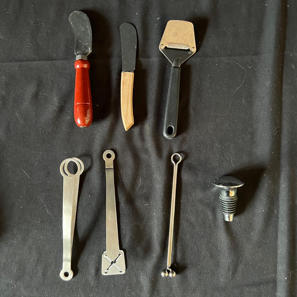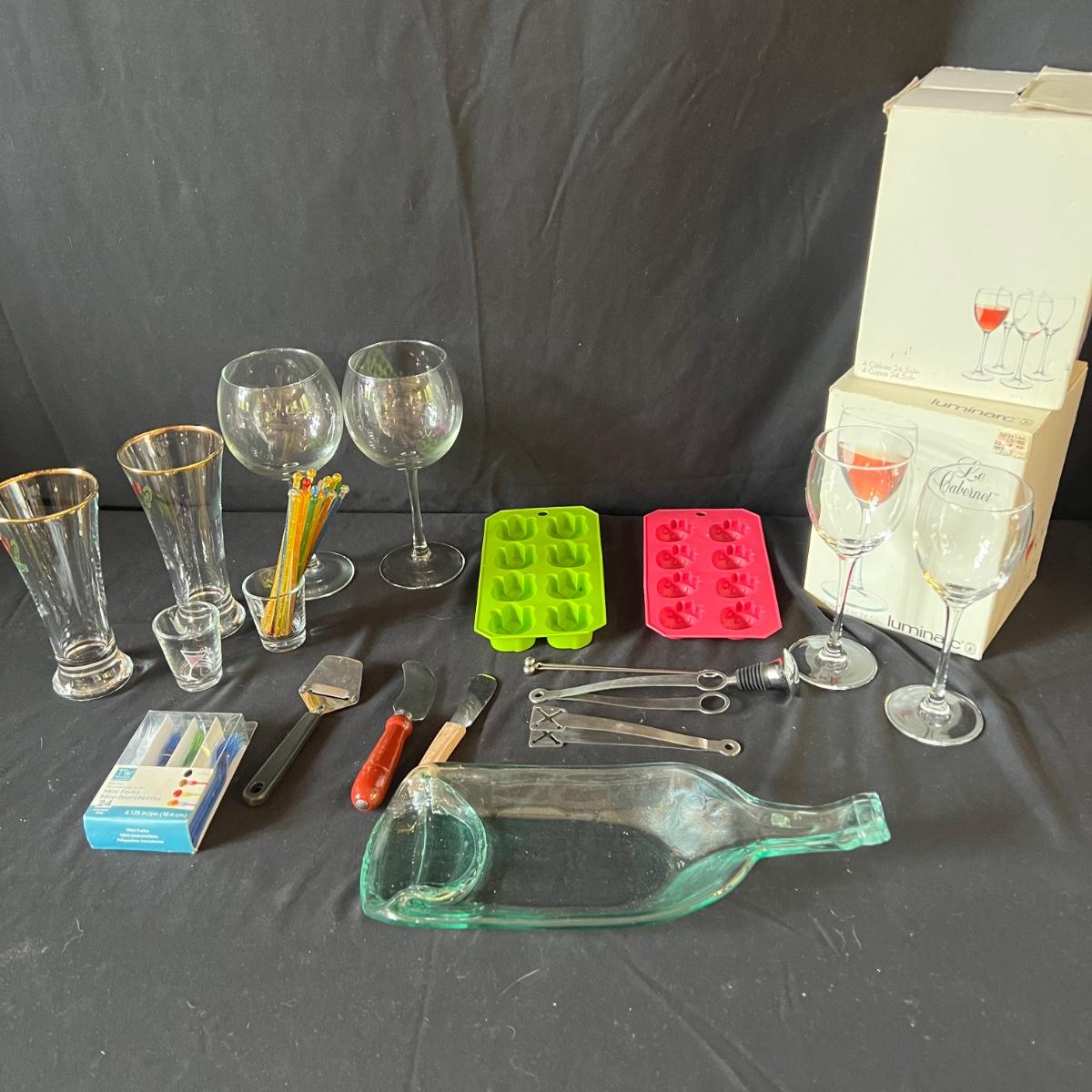 Eight 8.75 oz. Wine glasses in boxes, two wine glasses, two Carlsberg beer steins and two shot glasses. The lot also includes a metal bottle stopper, two silicone ice cube trays, three cheese knives and two sets of tongs. Lastly a melted glass bottle serving tray.