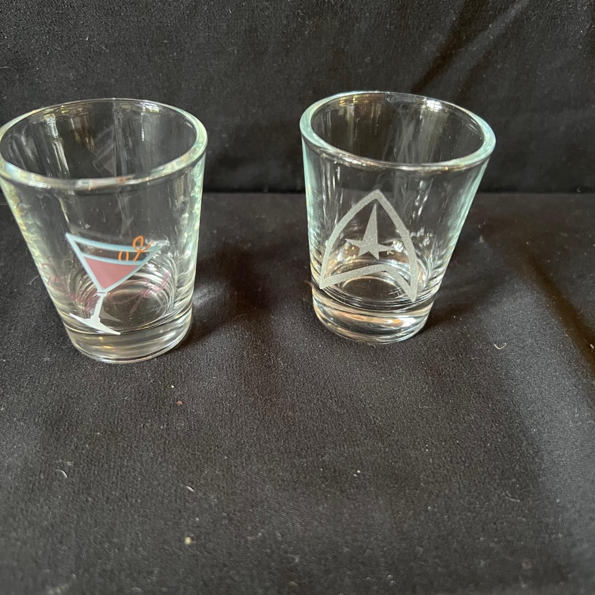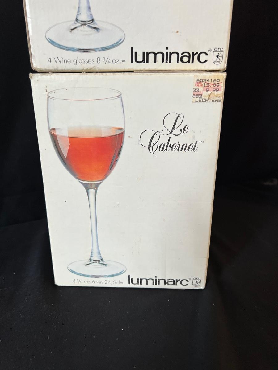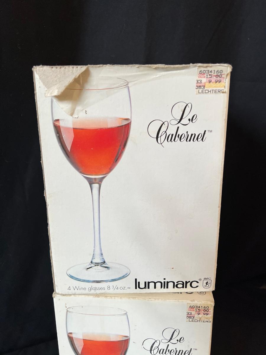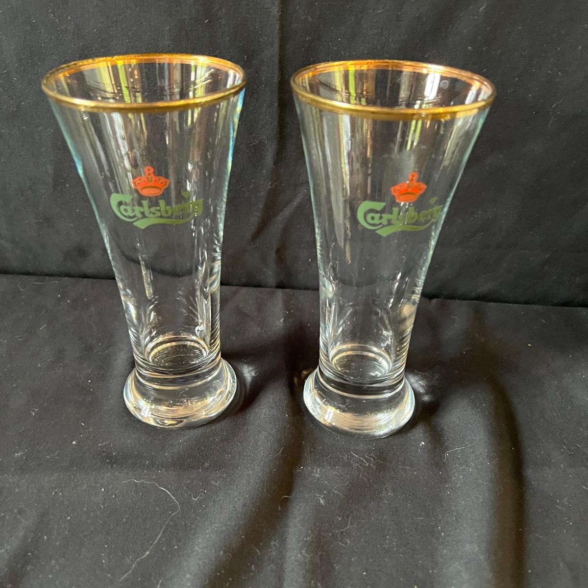 Eight 8.75 oz. Wine glasses in boxes, two wine glasses, two Carlsberg beer steins and two shot glasses. The lot also includes a metal bottle stopper, two silicone ice cube trays, three cheese knives and two sets of tongs. Lastly a melted glass bottle serving tray.