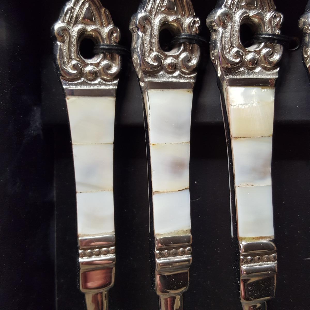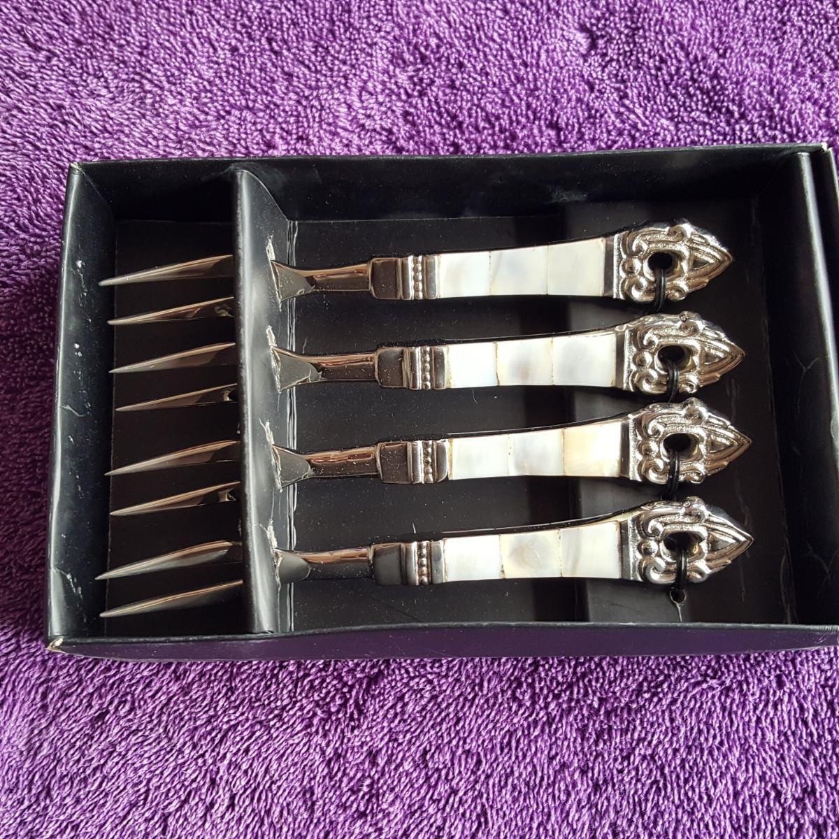 This auction lot is for a set of 4 Cocktail/Appetizer Forks. These forks that originally sold at the Bombay Company are set with mother of pearl adornment. Quite showy and fun. Appear to have never been used.