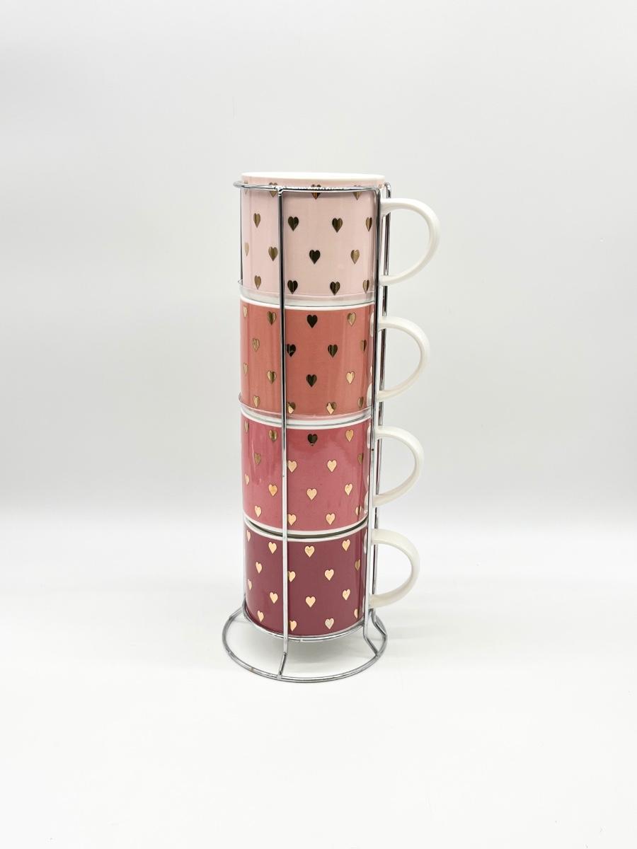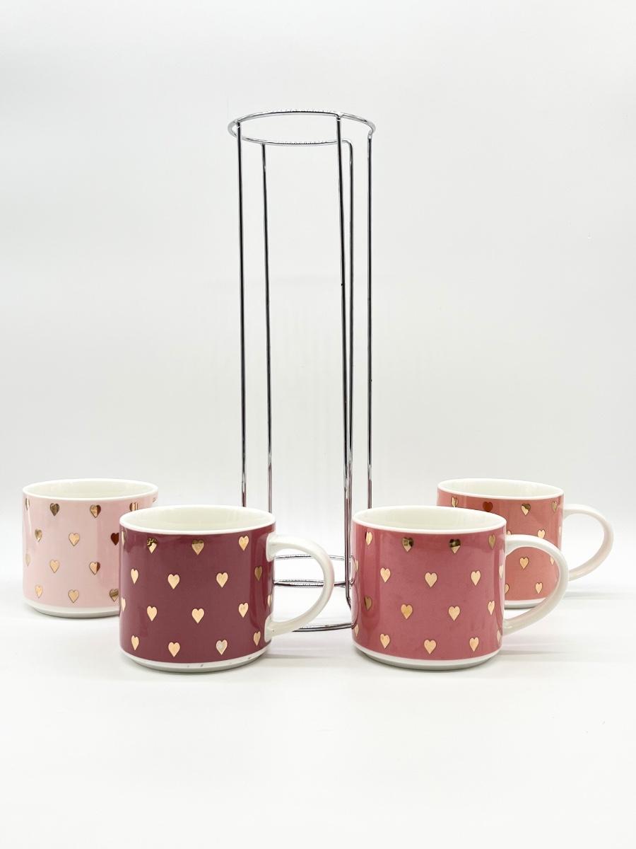 COCO + LOLA ~ Four Pink With Gold Hearts Stackable Coffee Mug ~ With Silver Metal Rack