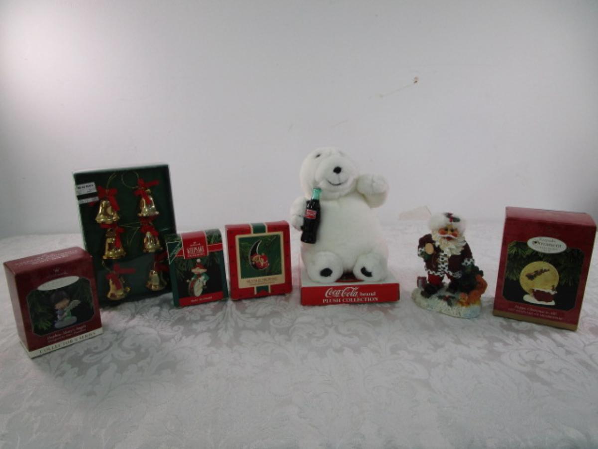 Coca Cola Plush bear, Christmas ornaments, Santa figurine, all new