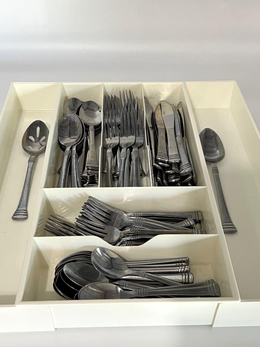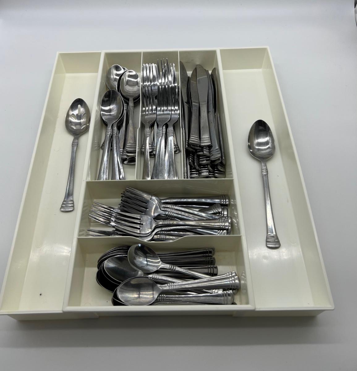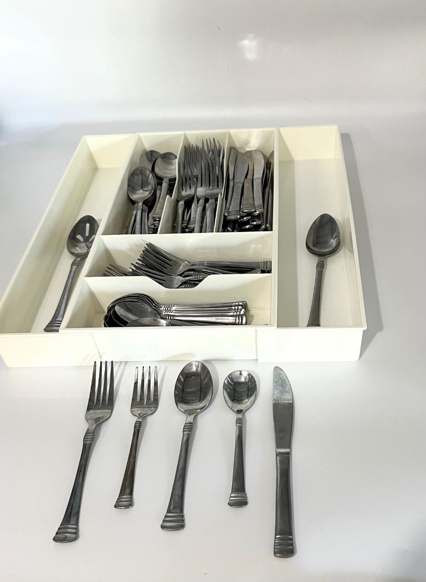 111 Piece stainless silverware set. CODIE By CAMBRIDGE with adjustable holder. Lot has 20 dinner forks, 24 small forks, 22 tablespoons, 19 teaspoons, 24 knives and 2 big serving spoons. May need to be polished.
