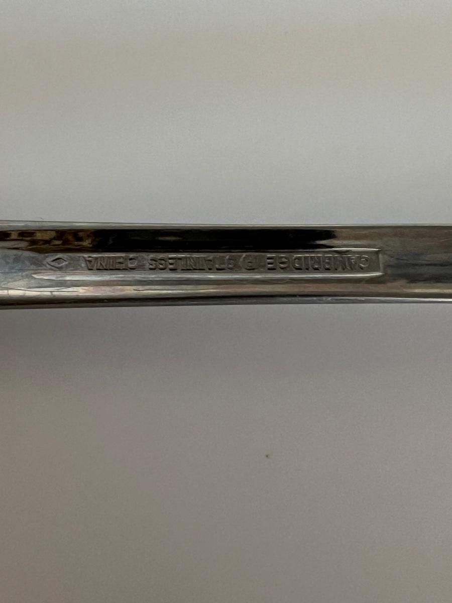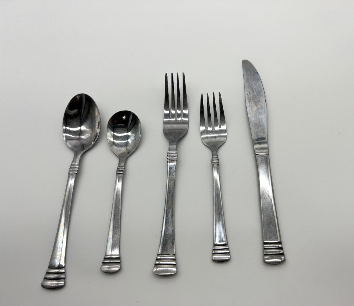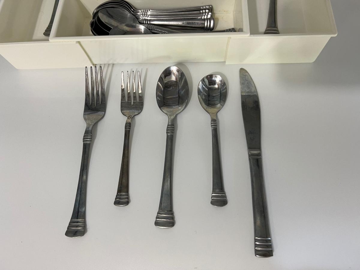 111 Piece stainless silverware set. CODIE By CAMBRIDGE with adjustable holder. Lot has 20 dinner forks, 24 small forks, 22 tablespoons, 19 teaspoons, 24 knives and 2 big serving spoons. May need to be polished.