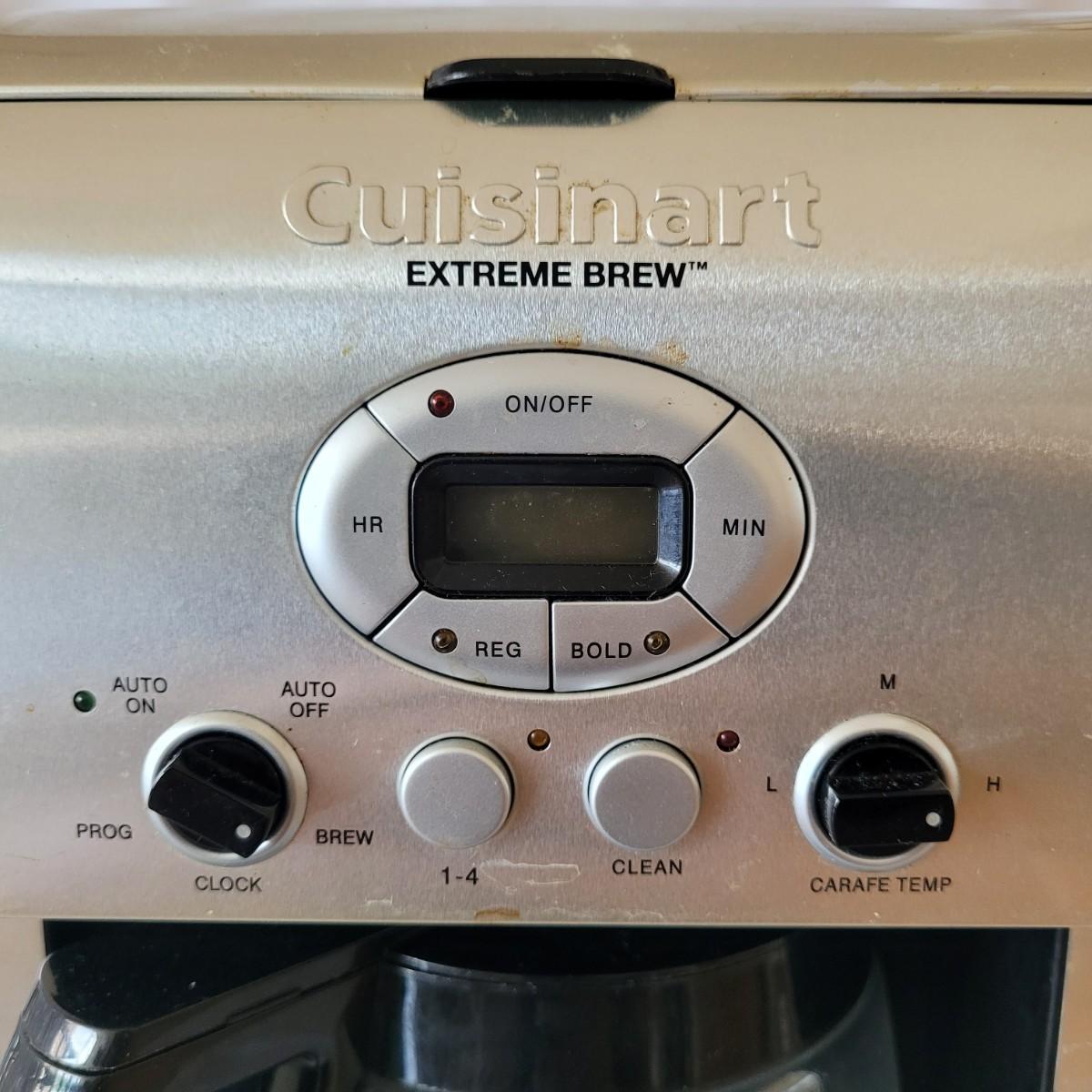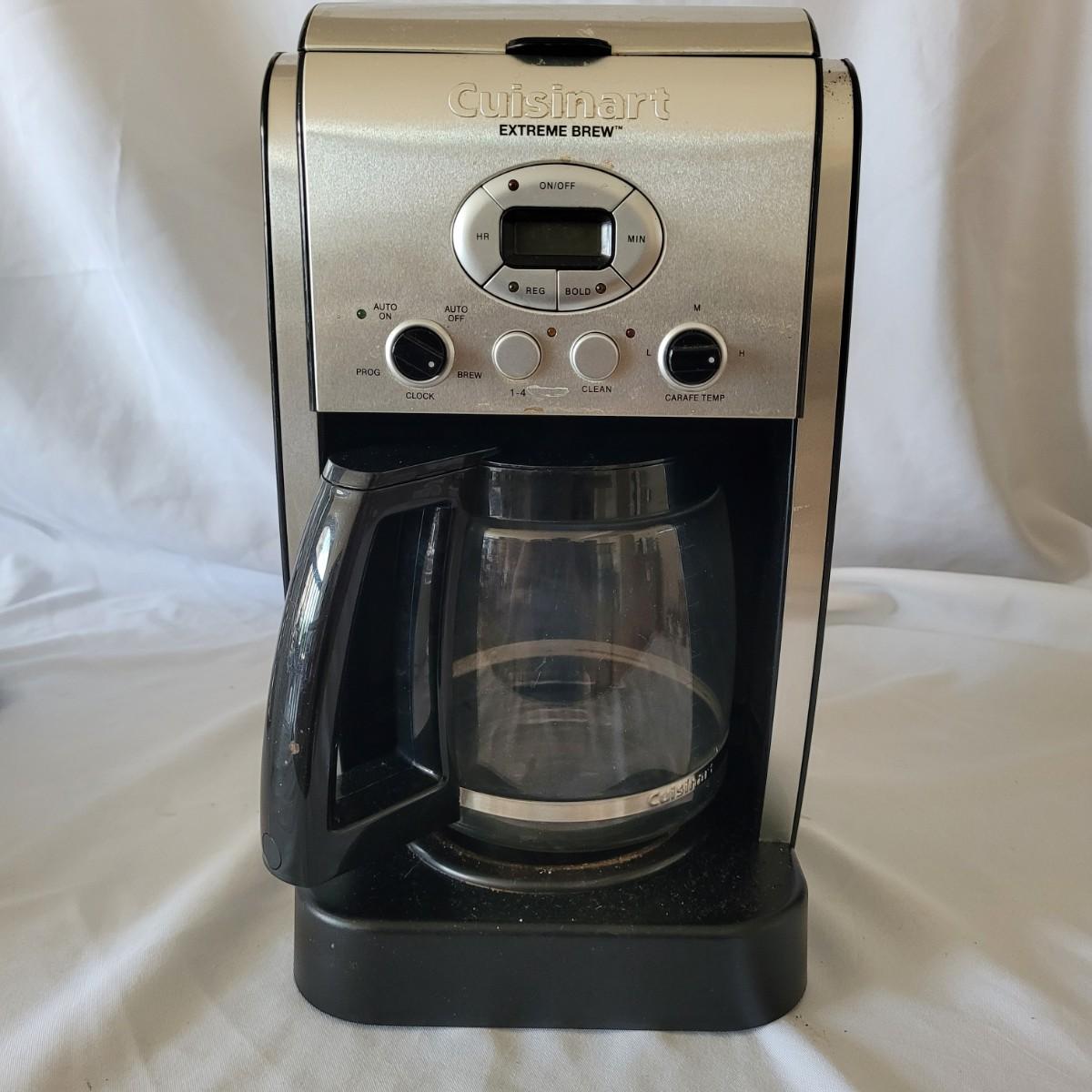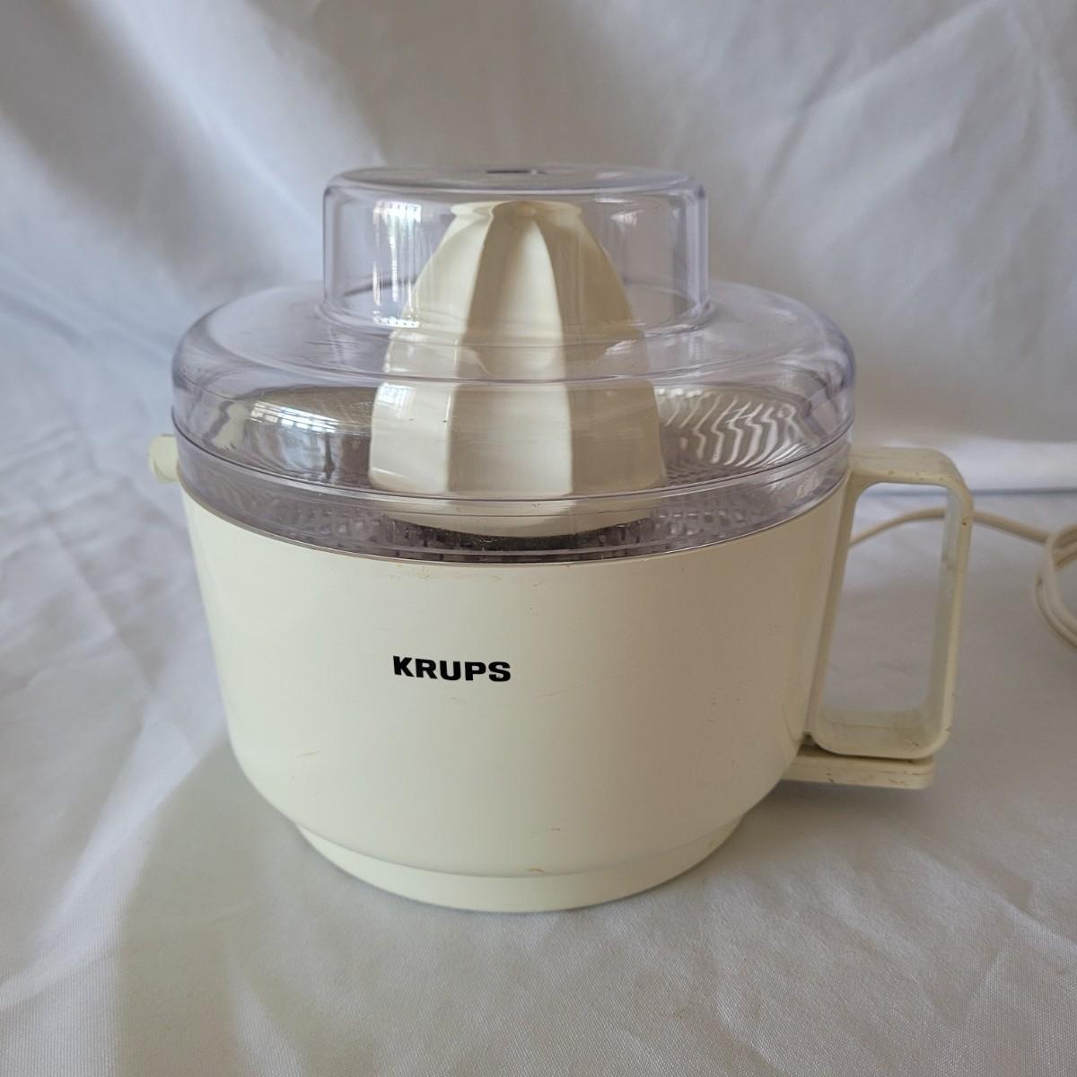 This lot includes four kitchen appliances. The first item is a Cuisinart brand Extreme Brew coffee maker. It measures 8" x 9" x 14"H and includes original instructions. It features many setting for creating a custom cup. There are also two blenders. Both Oster brand. One blender is older and possibly vintage in chrome. The other blender is a newer style 12 speed. The last item is a Krups electric juicer. It features a strainer and pitcher for juicing and straining. All items powered on when plugged in.