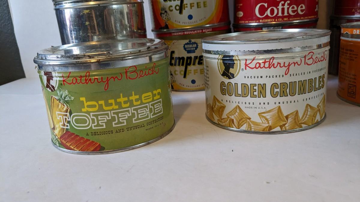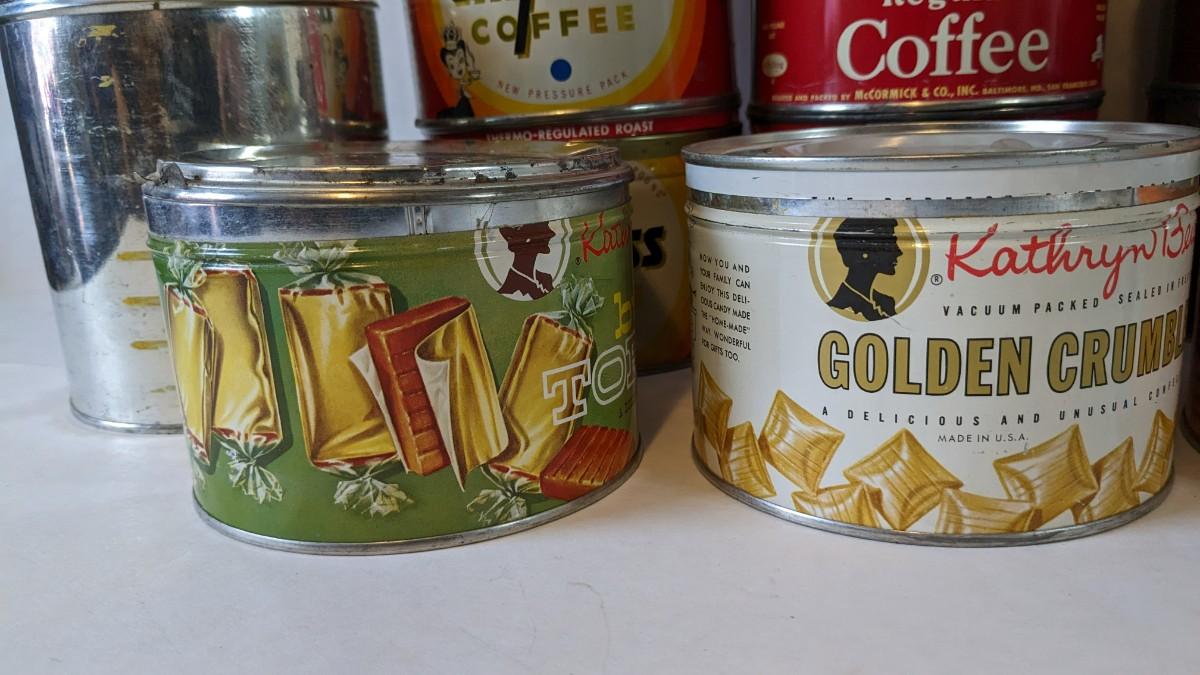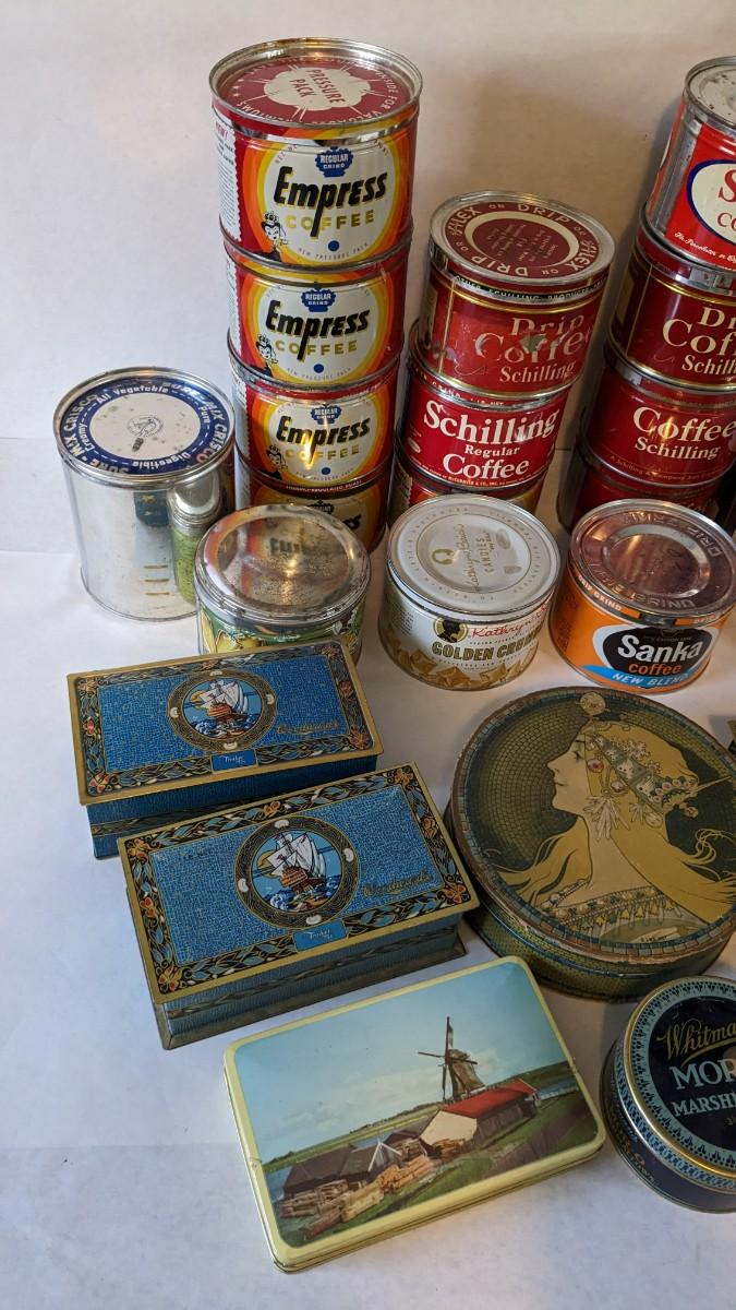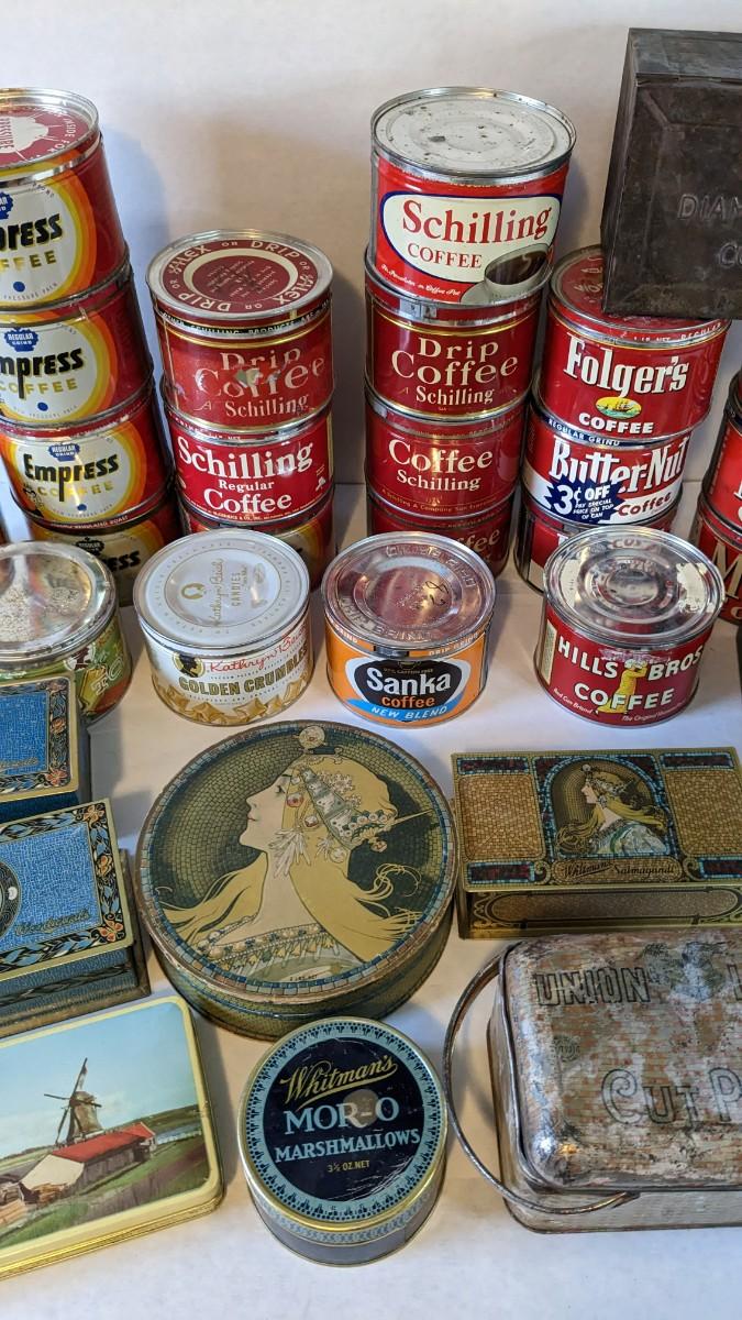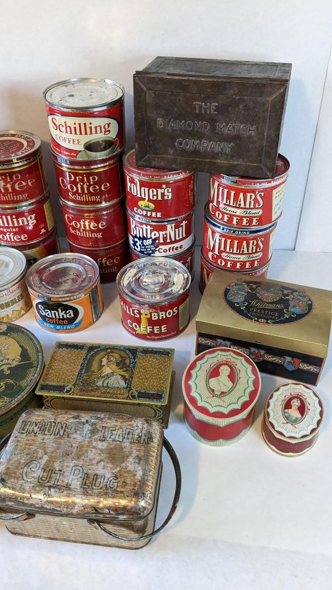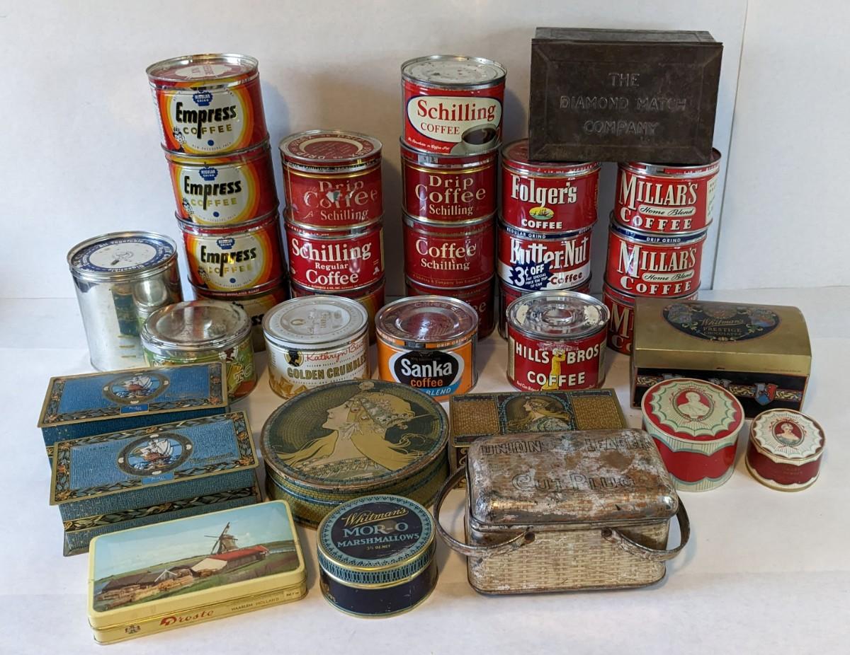 Includes tins from Empress, Schilling, Folgers, Butter-Nut, and Millars Coffee companies plus more. Woodwards trinket tins, Whitman tins as well as a fantastic tin and cardboard matching set, Richard Hudnut face powder tin and cardboard set, a fantastic Diamond Match box with matches still inside, Cut-Plug tin in rough shape, Kathryn Beich tins, and an old Crisco tin.