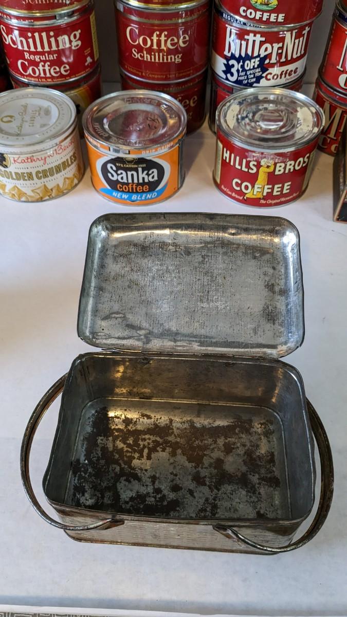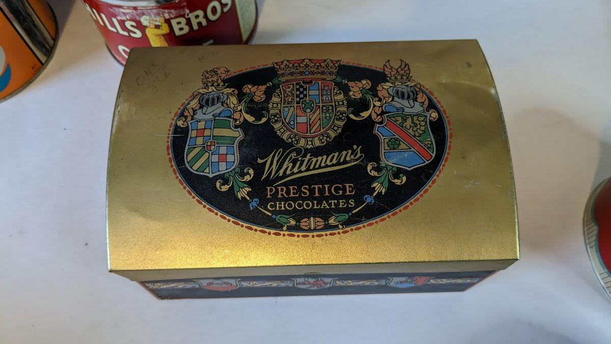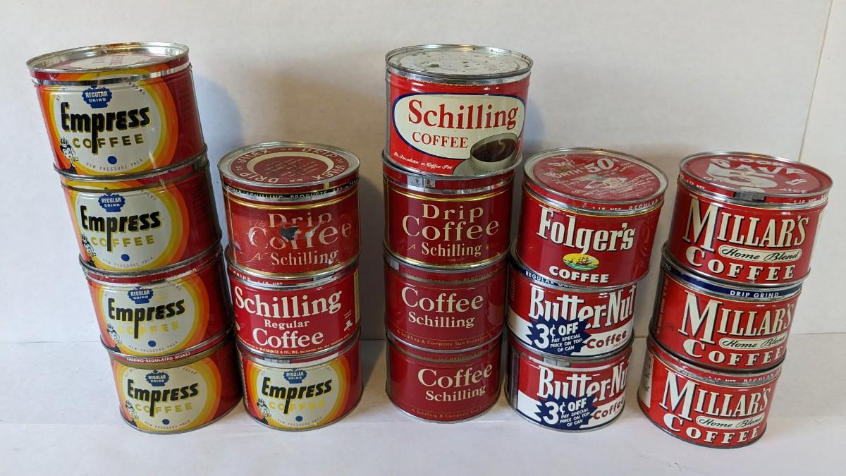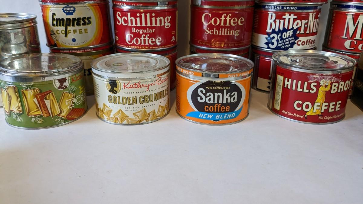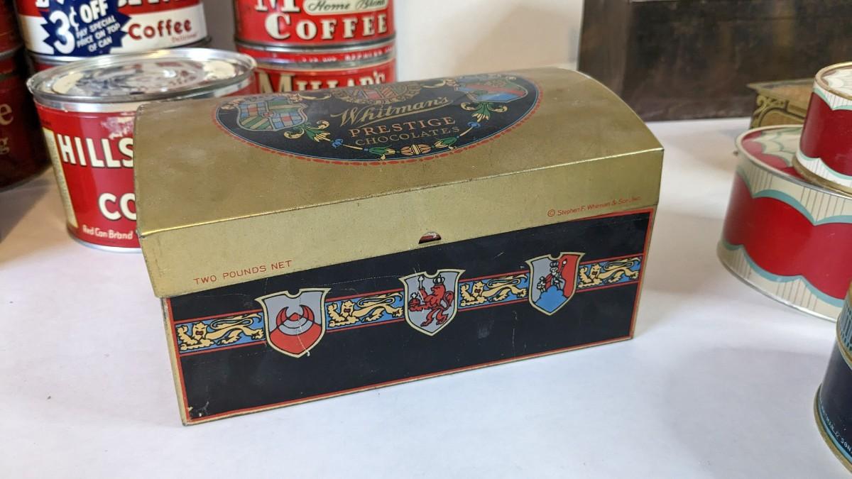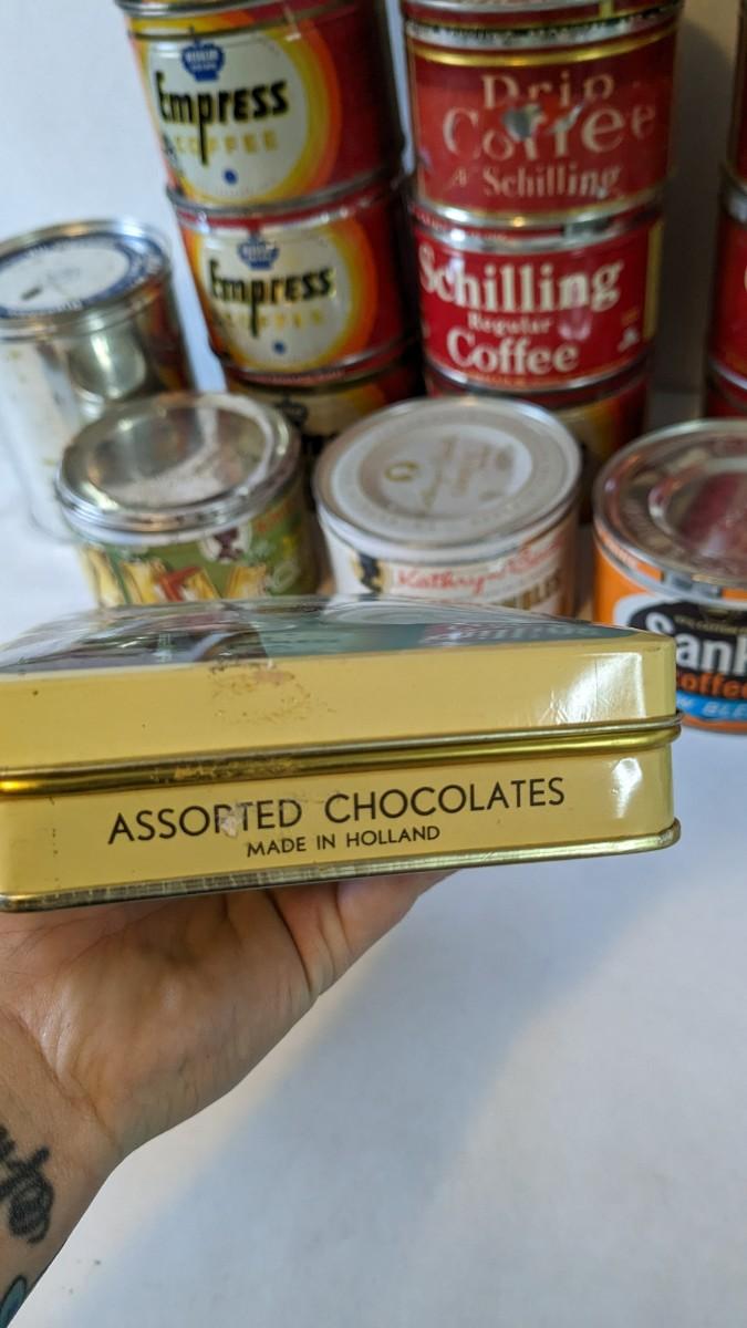 Includes tins from Empress, Schilling, Folgers, Butter-Nut, and Millars Coffee companies plus more. Woodwards trinket tins, Whitman tins as well as a fantastic tin and cardboard matching set, Richard Hudnut face powder tin and cardboard set, a fantastic Diamond Match box with matches still inside, Cut-Plug tin in rough shape, Kathryn Beich tins, and an old Crisco tin.