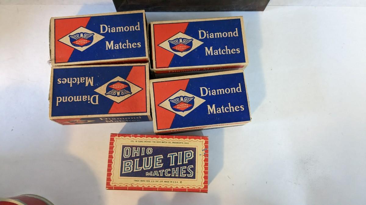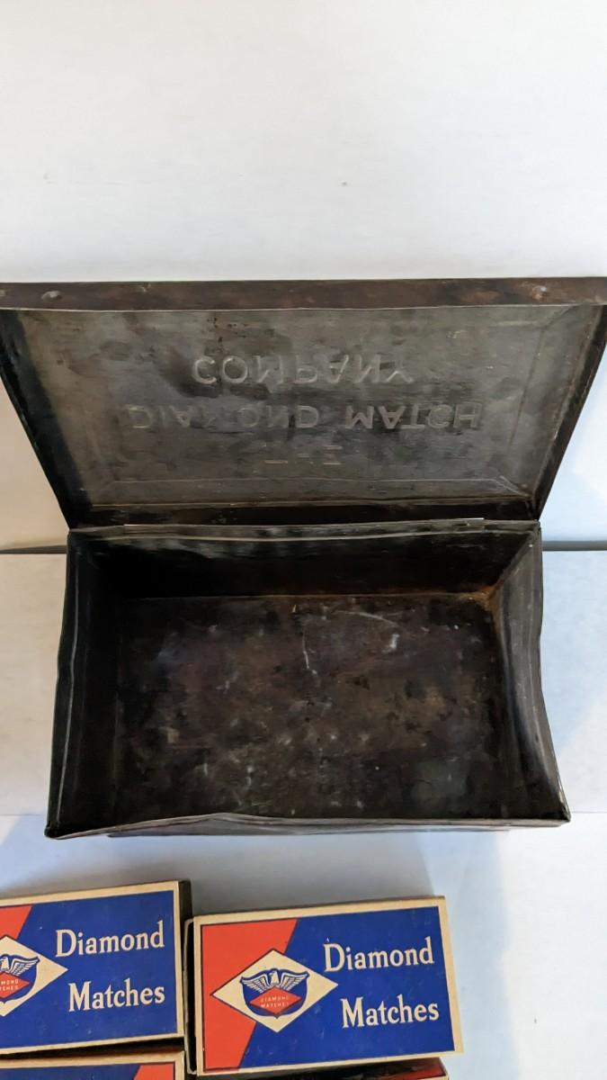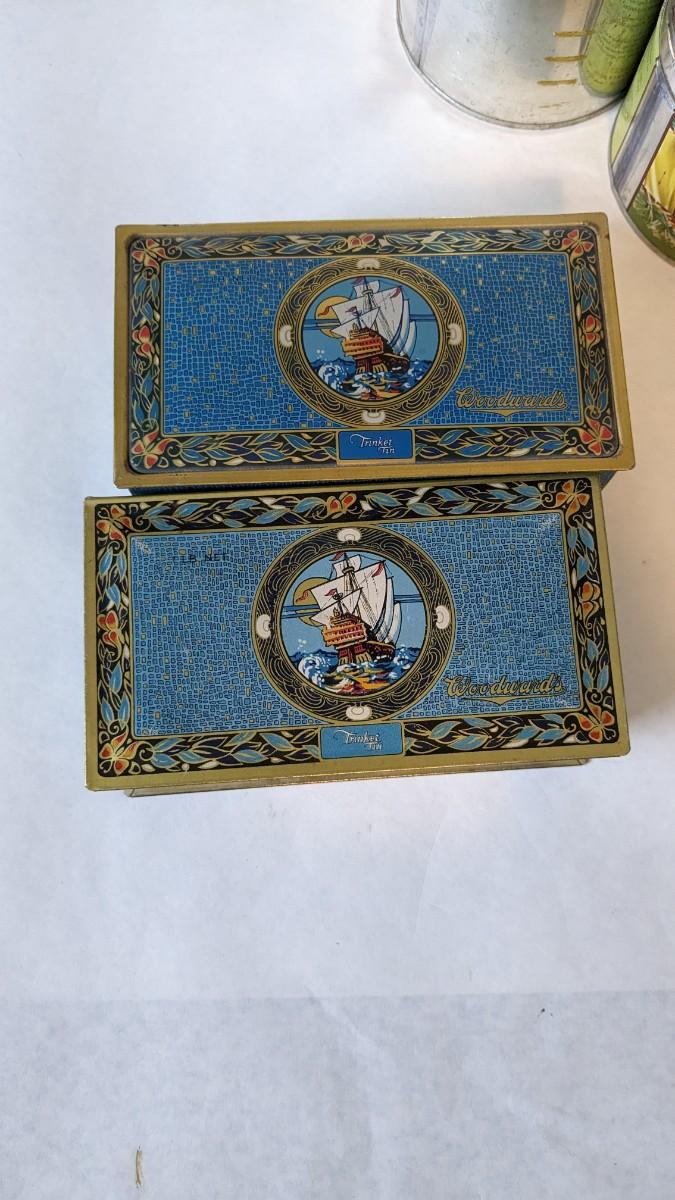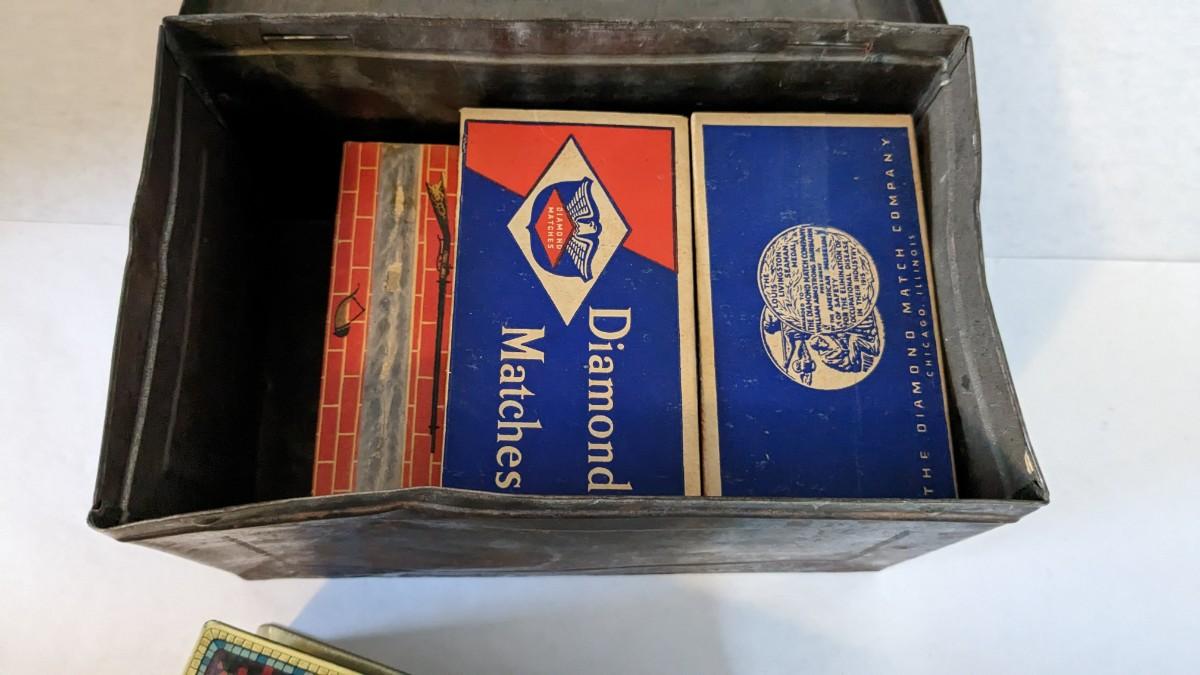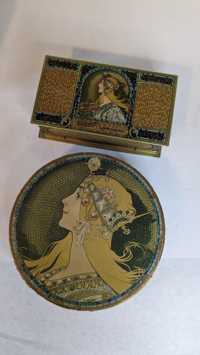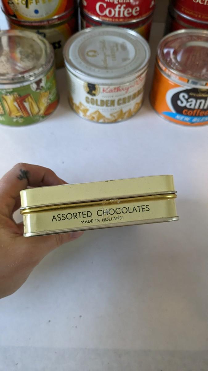 Includes tins from Empress, Schilling, Folgers, Butter-Nut, and Millars Coffee companies plus more. Woodwards trinket tins, Whitman tins as well as a fantastic tin and cardboard matching set, Richard Hudnut face powder tin and cardboard set, a fantastic Diamond Match box with matches still inside, Cut-Plug tin in rough shape, Kathryn Beich tins, and an old Crisco tin.